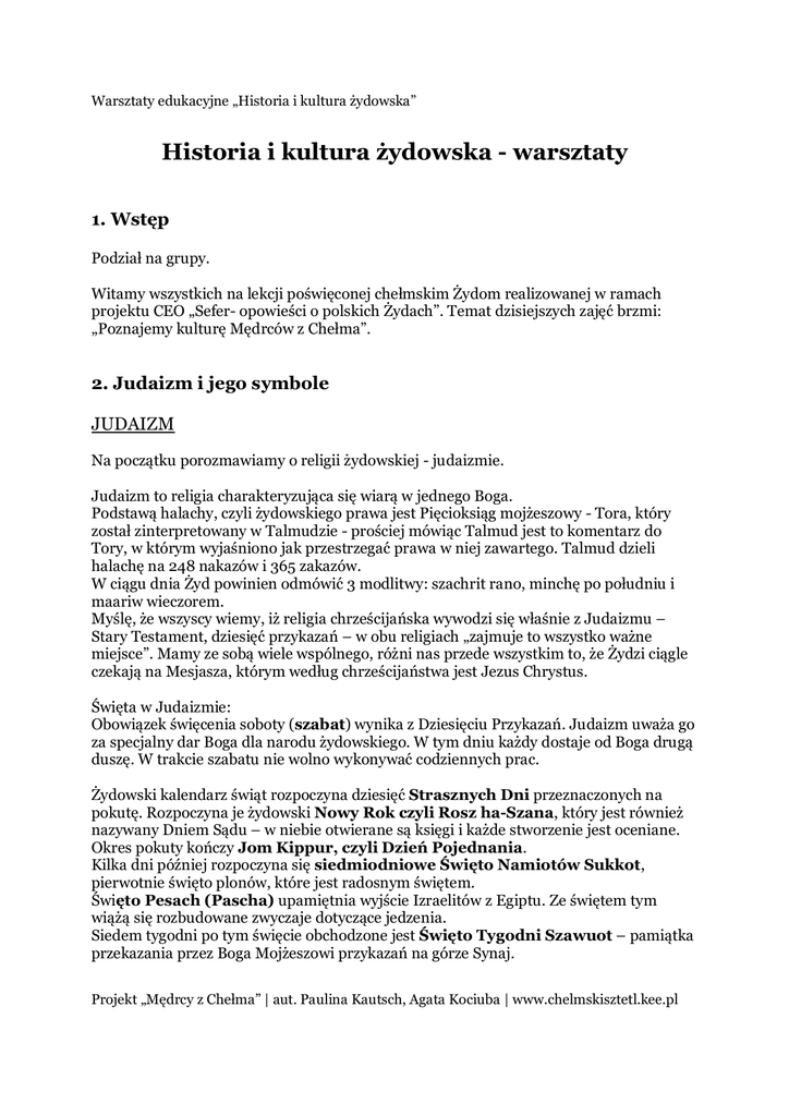 Warsztaty edukacyjne „Historia i kultura żydowska” Historia i kultura żydowska - warsztaty 1. Wstęp Podział na grupy. Witamy wszystkich na lekcji poświęconej chełmskim Żydom realizowanej w ramach projektu CEO „Sefer- opowieści o polskich Żydach”. Temat dzisiejszych zajęć brzmi: „Poznajemy kulturę Mędrców z Chełma”. 2. Judaizm i jego symbole JUDAIZM Na początku porozmawiamy o religii żydowskiej - judaizmie. Judaizm to religia charakteryzująca się wiarą w jednego Boga. Podstawą halachy, czyli żydowskiego prawa jest Pięcioksiąg mojżeszowy - Tora, który został zinterpretowany w Talmudzie - prościej mówiąc Talmud jest to komentarz do Tory, w którym wyjaśniono jak przestrzegać prawa w niej zawartego. Talmud dzieli halachę na 248 nakazów i 365 zakazów. W ciągu dnia Żyd powinien odmówić 3 modlitwy: szachrit rano, minchę po południu i maariw wieczorem. Myślę, że wszyscy wiemy, iż religia chrześcijańska wywodzi się właśnie z Judaizmu – Stary Testament, dziesięć przykazań – w obu religiach „zajmuje to wszystko ważne miejsce”. Mamy ze sobą wiele wspólnego, różni nas przede wszystkim to, że Żydzi ciągle czekają na Mesjasza, którym według chrześcijaństwa jest Jezus Chrystus. Święta w Judaizmie: Obowiązek święcenia soboty (szabat) wynika z Dziesięciu Przykazań. Judaizm uważa go za specjalny dar Boga dla narodu żydowskiego. W tym dniu każdy dostaje od Boga drugą duszę. W trakcie szabatu nie wolno wykonywać codziennych prac. Żydowski kalendarz świąt rozpoczyna dziesięć Strasznych Dni przeznaczonych na pokutę. Rozpoczyna je żydowski Nowy Rok czyli Rosz ha-Szana, który jest również nazywany Dniem Sądu – w niebie otwierane są księgi i każde stworzenie jest oceniane. Okres pokuty kończy Jom Kippur, czyli Dzień Pojednania. Kilka dni później rozpoczyna się siedmiodniowe Święto Namiotów Sukkot, pierwotnie święto plonów, które jest radosnym świętem. Święto Pesach (Pascha) upamiętnia wyjście Izraelitów z Egiptu. Ze świętem tym wiążą się rozbudowane zwyczaje dotyczące jedzenia. Siedem tygodni po tym święcie obchodzone jest Święto Tygodni Szawuot – pamiątka przekazania przez Boga Mojżeszowi przykazań na górze Synaj. Projekt „Mędrcy z Chełma” | aut. Paulina Kautsch, Agata Kociuba | www.chelmskisztetl.kee.pl Warsztaty edukacyjne „Historia i kultura żydowska” W okresie przesilenia zimowego żydzi obchodzą trwające osiem dni Święto Świateł Chanukka. Upamiętnia on wydarzenia jakie nastąpiły po zbezczeszczeniu Świątyni Jerozolimskiej, kiedy to jeden dzbanuszek oliwy płonął przez wszystkie osiem dni uroczystości ponownego wyświęcenia Świątyni. Święto Purim upamiętnia wybawienie od zagłady Żydów za czasów perskiego panowania. (Purim obchodzimy na pamiątkę cudownego ocalenia Żydów od całkowitej zagłady. Zausznik króla Persji, Haman, postanowić zniszczył Żydów., lecz jego plany spełzły na niczym dzięki odwadze dwojga ludzi - żony króla, Estery i jej kuzyna Mordechaja. Haman i jego stronnicy zostali zgładzeni tego samego dnia którego mieli wymordować Żydów. Następny dzień, 14 adar stał się świętem, które obchodzimy po dzień). KALENDARZ HEBRAJSKI Nie wiem czy wiecie, ale Żydzi mają inny kalendarz niż my. Jest to tak zwany kalendarz żydowski lub hebrajski. W tym kalendarzu rachuba lat zaczyna się od 6-tego dnia od stworzenia świata, które według ustaleń nastąpiło 7 października 3761 r. p. n. e. Teraz otwórzcie swoje teczki. Macie tam kartkę, na której znajdują się nazwy miesięcy hebrajskich i ich odpowiedniki w kalendarzu gregoriańskim, ilość dni oraz święta. Waszym zadaniem będzie wskazanie, który obecnie mamy miesiąc i rok według kalendarza hebrajskiego. (Czas na pracę z kalendarzem.) SYMBOLE Wiecie już mniej więcej, na czym polega judaizm. Teraz sprawdzimy, co wiecie o jego symbolach. (Na slajdzie pokazuje się Gwiazda Dawida). Czy ktoś z Was poznaje ten symbol? Tak, jest to Gwiazda Dawida, najbardziej znany symbol judaizmu. Gwiazda Dawida nie jest symbolem religii żydowskiej, tylko znakiem, który ma wymiar narodowościowy. Jest charakterystyczny dla państwa Izrael - od 1948 roku stanowi jego godło. . (Na slajdzie pojawia się menora) Kolejnym ważnym symbolem religii Żydów jest siedmioramienny świecznik. Czy ktoś zna jego prawidłową nazwę? Chodzi oczywiście o menorę, która według tradycji symbolizuje krzew gorejący, który ujrzał Mojżesz na górze Synaj. (Ściana Płaczu na slajdzie) Kto z was poznaje to miejsce? Tak, jest to Ściana Zachodnia, powszechnie znana jako Ściana Płaczu. Jedyna pozostałość po Świątyni Jerozolimskiej. Nazwa pochodzi od żydowskiego święta opłakiwania zburzenia świątyni przez Rzymian, obchodzonego corocznie w sierpniu. Wierni zgodnie z tradycją wkładają między kamienne ściany karteczki z prośbami do Boga. 3. Chełmski sztetl Projekt „Mędrcy z Chełma” | aut. Paulina Kautsch, Agata Kociuba | www.chelmskisztetl.kee.pl Warsztaty edukacyjne „Historia i kultura żydowska” Być może wiecie, że Chełm przed II wojną światową był w ok. 50 % miastem żydowskim. Dzięki temu mamy wiele zabytków związanymi z tymi ludźmi. Chcielibyśmy, abyście po tej lekcji nie przechodzili obojętnie obok tych miejsc i zdali sobie sprawę w jak wyjątkowym miejscu żyjemy. Pytanie do Was: czy wiecie, co znaczy słowo sztetl? (Prawdopodobnie nikt nie będzie wiedział co to, więc my podpowiadamy). Sztetl jest to małe skupisko miejskie zachowującą tradycyjną obyczajowość żydowską. Innymi słowydzielnica miasta, którą zamieszkują Żydzi. Ludzie mieszkający w obrębie sztetla posługiwali się językiem jidysz, obowiązywały ich zasady Tory i Talmudu i bardzo często przez całe swoje życie w ogóle nie mieli styczności ze swoimi polskimi sąsiadami. W Chełmie jednak Żydzi nie żyli w tak odizolowanym sztetlu. I
