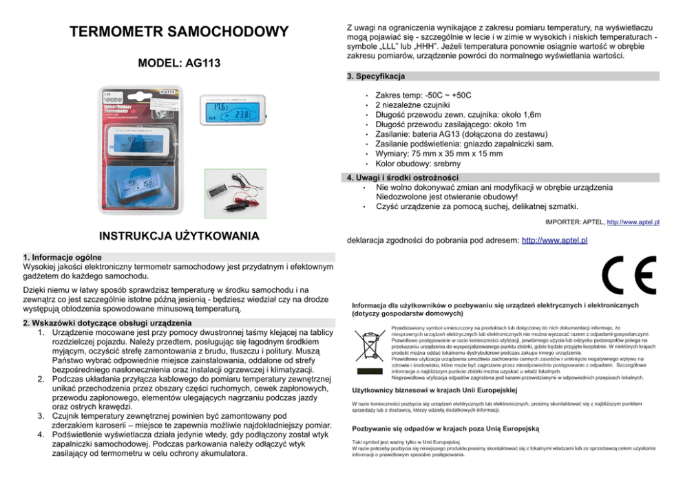 TERMOMETR SAMOCHODOWY MODEL: AG113 Z uwagi na ograniczenia wynikające z zakresu pomiaru temperatury, na wyświetlaczu mogą pojawiać się - szczególnie w lecie i w zimie w wysokich i niskich temperaturach symbole „LLL” lub „HHH”. Jeżeli temperatura ponownie osiągnie wartość w obrębie zakresu pomiarów, urządzenie powróci do normalnego wyświetlania wartości. 3. Specyfikacja • • • • • • • • Zakres temp: -50C ~ +50C 2 niezależne czujniki Długość przewodu zewn. czujnika: około 1,6m Długość przewodu zasilającego: około 1m Zasilanie: bateria AG13 (dołączona do zestawu) Zasilanie podświetlenia: gniazdo zapalniczki sam. Wymiary: 75 mm x 35 mm x 15 mm Kolor obudowy: srebrny 4. Uwagi i środki ostrożności • Nie wolno dokonywać zmian ani modyfikacji w obrębie urządzenia Niedozwolone jest otwieranie obudowy! • Czyść urządzenie za pomocą suchej, delikatnej szmatki. IMPORTER: APTEL, http://www.aptel.pl INSTRUKCJA UŻYTKOWANIA 1. Informacje ogólne Wysokiej jakości elektroniczny termometr samochodowy jest przydatnym i efektownym gadżetem do każdego samochodu. Dzięki niemu w łatwy sposób sprawdzisz temperaturę w środku samochodu i na zewnątrz co jest szczególnie istotne późną jesienią - będziesz wiedział czy na drodze występują oblodzenia spowodowane minusową temperaturą. 2. Wskazówki dotyczące obsługi urządzenia 1. Urządzenie mocowane jest przy pomocy dwustronnej taśmy klejącej na tablicy rozdzielczej pojazdu. Należy przedtem, posługując się łagodnym środkiem myjącym, oczyścić strefę zamontowania z brudu, tłuszczu i politury. Muszą Państwo wybrać odpowiednie miejsce zainstalowania, oddalone od strefy bezpośredniego nasłonecznienia oraz instalacji ogrzewczej i klimatyzacji. 2. Podczas układania przyłącza kablowego do pomiaru temperatury zewnętrznej unikać przechodzenia przez obszary części ruchomych, cewek zapłonowych, przewodu zapłonowego, elementów ulegających nagrzaniu podczas jazdy oraz ostrych krawędzi. 3. Czujnik temperatury zewnętrznej powinien być zamontowany pod zderzakiem karoserii – miejsce te zapewnia możliwie najdokładniejszy pomiar. 4. Podświetlenie wyświetlacza działa jedynie wtedy, gdy podłączony został wtyk zapalniczki samochodowej. Podczas parkowania należy odłączyć wtyk zasilający od termometru w celu ochrony akumulatora. deklaracja zgodności do pobrania pod adresem: http://www.aptel.pl