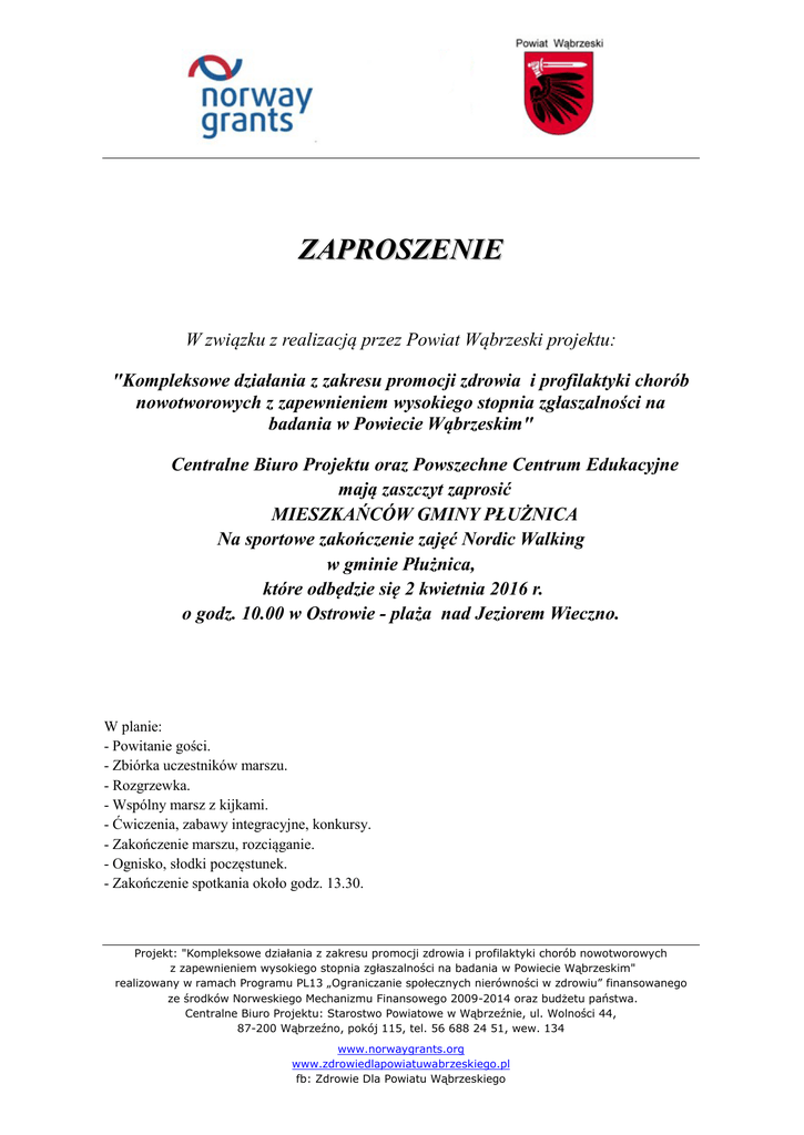 ZAPROSZENIE W związku z realizacją przez Powiat Wąbrzeski projektu: "Kompleksowe działania z zakresu promocji zdrowia i profilaktyki chorób nowotworowych z zapewnieniem wysokiego stopnia zgłaszalności na badania w Powiecie Wąbrzeskim" Centralne Biuro Projektu oraz Powszechne Centrum Edukacyjne mają zaszczyt zaprosić MIESZKAŃCÓW GMINY PŁUŻNICA Na sportowe zakończenie zajęć Nordic Walking w gminie Płużnica, które odbędzie się 2 kwietnia 2016 r. o godz. 10.00 w Ostrowie - plaża nad Jeziorem Wieczno. W planie: - Powitanie gości. - Zbiórka uczestników marszu. - Rozgrzewka. - Wspólny marsz z kijkami. - Ćwiczenia, zabawy integracyjne, konkursy. - Zakończenie marszu, rozciąganie. - Ognisko, słodki poczęstunek. - Zakończenie spotkania około godz. 13.30. Projekt: "Kompleksowe działania z zakresu promocji zdrowia i profilaktyki chorób nowotworowych z zapewnieniem wysokiego stopnia zgłaszalności na badania w Powiecie Wąbrzeskim" realizowany w ramach Programu PL13 „Ograniczanie społecznych nierówności w zdrowiu” finansowanego ze środków Norweskiego Mechanizmu Finansowego 2009-2014 oraz budżetu państwa. Centralne Biuro Projektu: Starostwo Powiatowe w Wąbrzeźnie, ul. Wolności 44, 87-200 Wąbrzeźno, pokój 115, tel. 56 688 24 51, wew. 134 www.norwaygrants.org www.zdrowiedlapowiatuwabrzeskiego.pl fb: Zdrowie Dla Powiatu Wąbrzeskiego Zakończenie zajęć Nordic Walking – „Marsz z kijami” w Gminie Płużnica. Zajęcia finansowane z projektu „Zdrowie dla powiatu wąbrzeskiego” Miejsce : Ostrowo plaża nad Jeziorem Wieczno Termin imprezy: 2 kwietnia 2016 r. godz. 10.00 Instruktor prowadzący : Paulina Puchała Początek i koniec trasy : Plaża główna Trasa Nordic Walking: Projekt: "Kompleksowe działania z zakresu promocji zdrowia i profilaktyki chorób nowotworowych z zapewnieniem wysokiego stopnia zgłaszalności na badania w Powiecie Wąbrzeskim" realizowany w ramach Programu PL13 „Ograniczanie społecznych nierówności w zdrowiu” finansowanego ze środków Norweskiego Mechanizmu Finansowego 2009-2014 oraz budżetu państwa. Centralne Biuro Projektu: Starostwo Powiatowe w Wąbrzeźnie, ul. Wolności 44, 87-200 Wąbrzeźno, pokój 115, tel. 56 688 24 51, wew. 134 www.norwaygrants.org www.zdrowiedlapowiatuwabrzeskiego.pl fb: Zdrowie Dla Powiatu Wąbrzeskiego - zaawansowana: początek-czerwona, żółta, niebieska, biała-koniec; czas : 1h - łatwa :początek –czerwona, biała- koniec; czas: 0,5 h - Ćwiczenia, konkurencje, zabawy : niebieskie koło-polana; czas: 0,5 h Projekt: "Kompleksowe działania z zakresu promocji zdrowia i profilaktyki chorób nowotworowych z zapewnieniem wysokiego stopnia zgłaszalności na badania w Powiecie Wąbrzeskim" realizowany w ramach Programu PL13 „Ograniczanie społecznych nierówności w zdrowiu” finansowanego ze środków Norweskiego Mechanizmu Finansowego 2009-2014 oraz budżetu państwa. Centralne Biuro Projektu: Starostwo Powiatowe w Wąbrzeźnie, ul. Wolności 44, 87-200 Wąbrzeźno, pokój 115, tel. 56 688 24 51, wew. 134 www.norwaygrants.org www.zdrowiedlapowiatuwabrzeskiego.pl fb: Zdrowie Dla Powiatu Wąbrzeskiego