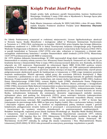 Ksiądz Prałat Józef Poręba Ksiądz prałat, były proboszcz parafii limanowskiej, kustosz Sanktuarium Maryjnego. Urodzony 9 maja 1940 roku w Mystkowie k. Nowego Sącza jako syn Stanisława i Wiktorii z d. Kiełbasa. Rada Miasta Limanowa uchwałą Nr XXIV/168/2004 z dnia 28 maja 2004r. nadała Księdzu Prałatowi Józefowi Porębie tytuł Honorowy Obywatel Miasta Limanowa. Do Szkoły Podstawowej uczęszczał w rodzinnej miejscowości, Liceum Ogólnokształcące ukończył w Nowym Sączu. Studia filozoficzne i teologiczne odbył w Wyższym Seminarium Duchownym w Tarnowie w l. 1958-1964, wyświęcony na księdza 28.06.1964 przez księdza bpa Jerzego Ablewicza. Dodatkowo studiował w l. 1958-1970 w Sekcji Teoretycznej Instytutu Liturgicznego przy Papieskim Wydziale Teologicznym w Krakowie. Jako wikariusz pracował w Lisiej Górze koło Tarnowa (1964-1967), w parafii katedralnej w Tarnowie (1967-1970) oraz jako wikariusz w Limanowej, a również jako szczególnie utalentowany katecheta i erudyta limanowskich szkół średnich (1970-1979). Mianowany 14.07.1979 proboszczem parafii MBB w Limanowej. Od 1979 dziekan dekanatu limanowskiego. W 1980 wprowadził drugi dzień modlitw na cmentarzach limanowskich w ostatnią sobotę czerwca tzw. Wiosenny Dzień Zmarłych. Ustanowił od 1.06.1981 (tj. po kradzieży korony z limanowskiej Piety w maju 1981) zwyczaj nocnych dyżurów, tzw. Kustodię, do której włączyło się 120 mężczyzn. Doprowadził do rekoronacji figury MBB 22.06.1983 podczas wizyty papieskiej w Krakowie, w ramach drugiej pielgrzymki do ojczyzny; od 1986 zainicjował nabożeństwa fatimskie, które obecnie odbywają w pierwsze soboty miesiąca od maja do października; ożywił piesze pielgrzymowanie okolicznych parafii do Sanktuarium w Limanowej; w 1988 z jego inicjatywy powstało muzeum sanktuaryjne. Wniósł ogromny wkład pracy dla uczczenia 200-lecia Konstytucji 3 Maja w Limanowej i podniesienia w tym czasie (28.05.1991) limanowskiego kościoła do godności Bazyliki Mniejszej. Przeprowadził liczne prace budowlane, jak remont dachu kościelnego (1980-1981), budowa Domu Katechetycznego (1980-1982), remont Kaplicy Łaski (1980), zbudowanie Domu Pielgrzyma (1982-1986), przebudowa starej wikarówki (1982-1984), budowa ołtarza polowego z krużgankami (1982-1986), stworzenie Małej Kalwarii Limanowskiej na placu koronacyjnym, remont muru oporowego, wzniesienie budynku na placu po b. budynku PKO w Limanowej (1991), zrekonstruowanie bramy kościelnej oraz zbudowanie kamiennego arkadowego ogrodzenia po obu stronach kościoła od strony Rynku, wybudowanie kolumnady dla osiemnastu dzwonów wygrywających melodie maryjne, wykupienie placu pod parking św. Krzysztofa (1991), prace wewnątrz kościoła (zabezpieczenie głównego ołtarza, odnowienie polichromii w l. 1982-1984, odnowienie wszystkich ołtarzy, remont organów, konserwacja witraży). Był współfundatorem nowej monstrancji w 1987 w formie lipy (nawiązanie do pierwotnego kultu MBB na lipie przy Kaplicy Łaski). Dba o zachowanie kultury, tradycji i obyczajów regionu poprzez m. in.: konkurs na najpiękniejszą palmę, konkurs szopek i gwiazd kolędowych, pielęgnowanie strojów ludowych w procesjach i uroczystościach kościelnych, dożynki i towarzyszące im wystawy wieńców dożynkowych w pomieszczeniach sanktuaryjnych. Redaktor monografii, napisanej przez Józefa Szymona Wrońskiego pt. Bazylika Matki Boskiej Bolesnej w Limanowej, wyd w Limanowej w 2001; Odznaczony Expositorium canonicale 1977, rokietą i mantoletem 1980, kapelan Ojca św. 1992. Odznaczony 9.04.1998 złotym medalem Za zasługi dla pożarnictwa i 13.04.2005 Złotym Znakiem Związku Ochotniczych Straży Pożarnych RP. Wyróżniony 16.10.1997 odznaką Za zasługi dla miasta Limanowej i Hon. Obywatelstwem Miasta Limanowej (28.05.2004). W 2010 roku przeszedł na emeryturę, pozostając rezydentem w parafii.