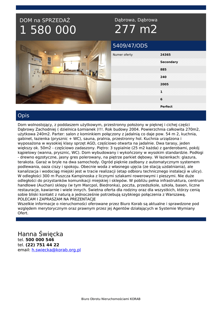 Dąbrowa, Dąbrowa DOM na SPRZEDAŻ 277 m2 1 580 000 5409/47/ODS Numer oferty 24365 Secondary 885 240 2005 1 6 Perfect Opis Dom wolnostojący, z poddaszem użytkowym, przestronny położony w pięknej i cichej części Dąbrowy Zachodniej ( dzielnica Łomianek )!!!. Rok budowy 2004. Powierzchnia całkowita 270m2, użytkowa 240m2. Parter: salon z kominkiem połączony z jadalnią co daje pow. 54 m 2, kuchnia, gabinet, łazienka (prysznic + WC), sauna, pralnia, przestronny hol. Kuchnia urządzona i wyposażona w wysokiej klasy sprzęt AGD, częściowo otwarta na jadalnie. Dwa tarasy, jeden większy ok. 50m2 - częściowo zadaszony. Piętro: 3 sypialnie (25 m2 każda) z garderobami, pokój kąpielowy (wanna, prysznic, WC). Dom wybudowany i wykończony w wysokim standardzie. Podłogi - drewno egzotyczne, jasny gres polerowany, na piętrze parkiet dębowy. W łazienkach: glazura, terakota. Garaż w bryle na dwa samochody. Ogród pięknie zadbany z automatycznym systemem podlewania, oaza ciszy i spokoju. Obecnie woda z własnego ujęcia (ze stacją uzdatniania), ale kanalizacja i wodociąg miejski jest w tracie realizacji (etap odbioru technicznego instalacji w ulicy). W odległości 300 m Puszcza Kampinoska z licznymi szlakami rowerowymi i pieszymi. Nie duże odległości do przystanków komunikacji miejskiej i sklepów. W pobliżu pełna infrastruktura, centrum handlowe (Auchan) sklepy (w tym Marcpol, Biedronka), poczta, przedszkole, szkoła, basen, liczne restauracje, kawiarnie i wiele innych. Świetna oferta dla rodziny oraz dla wszystkich, którzy cenią sobie bliski kontakt z naturą a jednocześnie potrzebują szybkiego połączenia z Warszawą. POLECAM I ZAPRASZAM NA PREZENTACJE Wszelkie informacje o nieruchomości oferowane przez Biuro Korab są aktualne i sprawdzone pod względem merytorycznym oraz prawnym przez jej Agentów działających w Systemie Wymiany Ofert. Hanna Święcka tel. 500 000 546 tel. (22) 751 44 22 email: [email protected] Biuro Obrotu Nieruchomościami KORAB Powered by TCPDF (www.tcpdf.org)