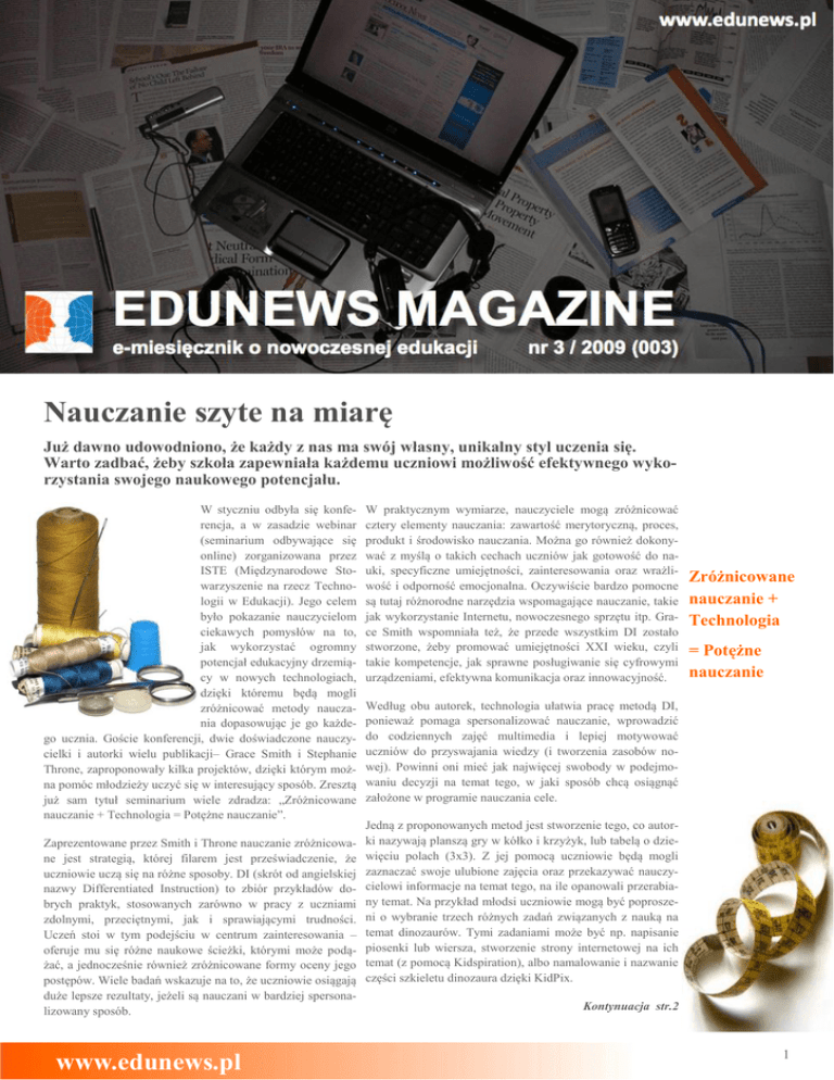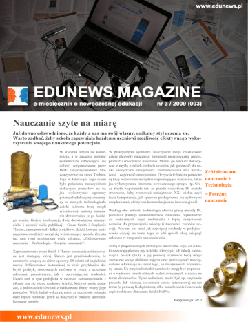 Nauczyciele pokolenia Y wkraczają do szkoły Zaczyna się symboliczny koniec starej edukacji Nauczanie szyte na miarę Już dawno udowodniono, że każdy z nas ma swój własny, unikalny styl uczenia się. Warto zadbać, żeby szkoła zapewniała każdemu uczniowi możliwość efektywnego wykorzystania swojego naukowego potencjału. W styczniu odbyła się konferencja, a w zasadzie webinar (seminarium odbywające się online) zorganizowana przez ISTE (Międzynarodowe Stowarzyszenie na rzecz Technologii w Edukacji). Jego celem było pokazanie nauczycielom ciekawych pomysłów na to, jak wykorzystać ogromny potencjał edukacyjny drzemiący w nowych technologiach, dzięki któremu będą mogli zróżnicować metody nauczania dopasowując je go każdego ucznia. Goście konferencji, dwie doświadczone nauczycielki i autorki wielu publikacji– Grace Smith i Stephanie Throne, zaproponowały kilka projektów, dzięki którym można pomóc młodzieży uczyć się w interesujący sposób. Zresztą już sam tytuł seminarium wiele zdradza: „Zróżnicowane nauczanie + Technologia = Potężne nauczanie”. Zaprezentowane przez Smith i Throne nauczanie zróżnicowane jest strategią, której filarem jest przeświadczenie, że uczniowie uczą się na różne sposoby. DI (skrót od angielskiej nazwy Differentiated Instruction) to zbiór przykładów dobrych praktyk, stosowanych zarówno w pracy z uczniami zdolnymi, przeciętnymi, jak i sprawiającymi trudności. Uczeń stoi w tym podejściu w centrum zainteresowania – oferuje mu się różne naukowe ścieżki, którymi może podążać, a jednocześnie również zróżnicowane formy oceny jego postępów. Wiele badań wskazuje na to, że uczniowie osiągają duże lepsze rezultaty, jeżeli są nauczani w bardziej spersonalizowany sposób. www.edunews.pl W praktycznym wymiarze, nauczyciele mogą zróżnicować cztery elementy nauczania: zawartość merytoryczną, proces, produkt i środowisko nauczania. Można go również dokonywać z myślą o takich cechach uczniów jak gotowość do nauki, specyficzne umiejętności, zainteresowania oraz wrażliwość i odporność emocjonalna. Oczywiście bardzo pomocne są tutaj różnorodne narzędzia wspomagające nauczanie, takie jak wykorzystanie Internetu, nowoczesnego sprzętu itp. Grace Smith wspomniała też, że przede wszystkim DI zostało stworzone, żeby promować umiejętności XXI wieku, czyli takie kompetencje, jak sprawne posługiwanie się cyfrowymi urządzeniami, efektywna komunikacja oraz innowacyjność. Zróżnicowane nauczanie + Technologia = Potężne nauczanie Według obu autorek, technologia ułatwia pracę metodą DI, ponieważ pomaga spersonalizować nauczanie, wprowadzić do codziennych zajęć multimedia i lepiej motywować uczniów do przyswajania wiedzy (i tworzenia zasobów nowej). Powinni oni mieć jak najwięcej swobody w podejmowaniu decyzji na temat tego, w jaki sposób chcą osiągnąć założone w programie nauczania cele. Jedną z proponowanych metod jest stworzenie tego, co autorki nazywają planszą gry w kółko i krzyżyk, lub tabelą o dziewięciu polach (3x3). Z jej pomocą uczniowie będą mogli zaznaczać swoje ulubione zajęcia oraz przekazywać nauczycielowi informacje na temat tego, na ile opanowali przerabiany temat. Na przykład młodsi uczniowie mogą być poproszeni o wybranie trzech różnych zadań związanych z nauką na temat dinozaurów. Tymi zadaniami może być np. napisanie piosenki lub wiersza, stworzenie strony internetowej na ich temat (z pomocą Kidspiration), albo namalowanie i nazwanie części szkieletu dinozaura dzięki KidPix. Kontynuacja str.2 1 Witamy w Edunews Magazine No to mamy wiosnę. Pięknie się wszystko ożywia, rozbudza, oddycha po zimie. I nawet najważniejsze Ministerstwo dostrzegło, że to już wiosna. Do szkół – jak doniósł dziennik Metro - trafiła optymistyczna zachęta z MEN, aby uczniowie podstawówek i gimnazjów - zamiast siedzieć w szkolnych ławkach - chodzili sobie na wycieczki. Doprawdy, fantastyczne zalecenie… Tylko po co przez dwa lata z hakiem urządzano ogólnopolskie zawody w rozpychaniu podstawy programowej do granic wytrzymałości? Dodawano coraz to nowe pozycje, treści, fakty, osoby, książki…? Przecież nie da się ukryć, że ciężko pracowano na to, aby uczeń nie mógł pójść na wycieczkę, bo przecież a nuż zdarzy się, że pytania na egzaminie będą dotyczyły właśnie tego, czego nie przerobiono z jej powodu (wszyscy pamiętamy sławną sytuację z zeszłego roku). Z obliczeń urzędniczych wyszło, że przy roku szkolnym trwającym 35-36 tygodni, do zrealizowania podstawy programowej w gimnazjum wystarczy tygodni 32. Zaiste, powiadają nam urzędnicy, lepiej te ostatnie 3-4 tygodnie spędzić na świeżym powietrzu, niż na zakuwaniu. I jak tu nie przyklasnąć z zachwytem? No ale koniec tego marudzenia. Mamy wiosnę, więc spójrzmy śmielej w przyszłość. Róbmy swoje, realizujmy swoje marzenia, eksperymentujmy, stąpajmy twardo po ziemi, nie oglądając się na oderwane od rzeczywistości zalecenia. Naszym czytelnikom życzymy samych sukcesów! A gimnazjalistom udanych wycieczek :) Marcin Polak [email protected] kontynuacja ze str.1 „Nauczyciele powinni dokonać wstępnej analizy zainteresowań swoich podopiecznych za pomocą różnych kwestionariuszy, obserwacji i wywiadów” mówi Smith. Wskazała na wiele dostępnych w sieci narzędzi do tworzenia ankiet, które mogą pomóc nauczycielom w przygotowaniu takiego badania. Warto wykorzystać te narzędzia: I-Search: polega na przeszukiwaniu zasobów dostępnych on-line. Uczniowie pracują indywidualnie lub w parach, żeby odnaleźć informacje z określonego tematu. Wyniki poszukiwań są później prezentowane na forum klasy za pomocą dowolnej techniki – może to być pisemne opracowanie, rysunek ręczny lub grafika komputerowa, albo prezentacja multimedialna. Przykładowo, nauczyciel może przygotować szablon 