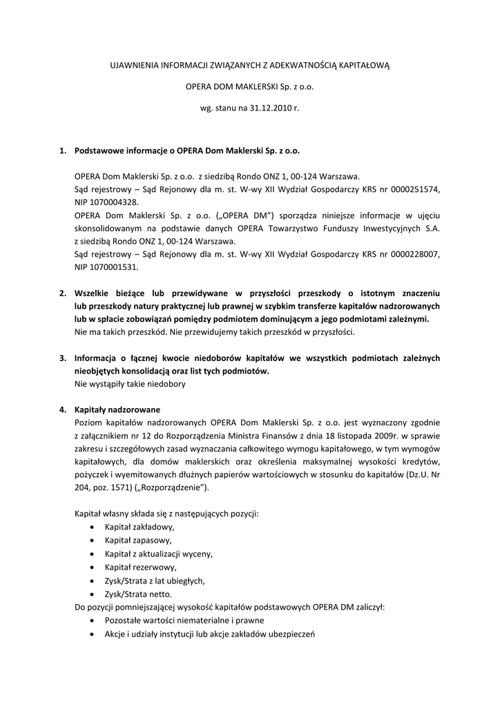 UJAWNIENIA INFORMACJI ZWIĄZANYCH Z ADEKWATNOŚCIĄ KAPITAŁOWĄ OPERA DOM MAKLERSKI Sp. z o.o. wg. stanu na 31.12.2010 r. 1. Podstawowe informacje o OPERA Dom Maklerski Sp. z o.o. OPERA Dom Maklerski Sp. z o.o. z siedzibą Rondo ONZ 1, 00‐124 Warszawa. Sąd rejestrowy – Sąd Rejonowy dla m. st. W‐wy XII Wydział Gospodarczy KRS nr 0000251574, NIP 1070004328. OPERA Dom Maklerski Sp. z o.o. („OPERA DM”) sporządza niniejsze informacje w ujęciu skonsolidowanym na podstawie danych OPERA Towarzystwo Funduszy Inwestycyjnych S.A. z siedzibą Rondo ONZ 1, 00‐124 Warszawa. Sąd rejestrowy – Sąd Rejonowy dla m. st. W‐wy XII Wydział Gospodarczy KRS nr 0000228007, NIP 1070001531. 2. Wszelkie bieżące lub przewidywane w przyszłości przeszkody o istotnym znaczeniu lub przeszkody natury praktycznej lub prawnej w szybkim transferze kapitałów nadzorowanych lub w spłacie zobowiązań pomiędzy podmiotem dominującym a jego podmiotami zależnymi. Nie ma takich przeszkód. Nie przewidujemy takich przeszkód w przyszłości. 3. Informacja o łącznej kwocie niedoborów kapitałów we wszystkich podmiotach zależnych nieobjętych konsolidacją oraz list tych podmiotów. Nie wystąpiły takie niedobory 4. Kapitały nadzorowane Poziom kapitałów nadzorowanych OPERA Dom Maklerski Sp. z o.o. jest wyznaczony zgodnie z załącznikiem nr 12 do Rozporządzenia Ministra Finansów z dnia 18 listopada 2009r. w sprawie zakresu i szczegółowych zasad wyznaczania całkowitego wymogu kapitałowego, w tym wymogów kapitałowych, dla domów maklerskich oraz określenia maksymalnej wysokości kredytów, pożyczek i wyemitowanych dłużnych papierów wartościowych w stosunku do kapitałów (Dz.U. Nr 204, poz. 1571) („Rozporządzenie”). Kapitał własny składa się z następujących pozycji: • Kapitał zakładowy, • Kapitał zapasowy, • Kapitał z aktualizacji wyceny, • Kapitał rezerwowy, • Zysk/Strata z lat ubiegłych, • Zysk/Strata netto. Do pozycji pomniejszającej wysokość kapitałów podstawowych OPERA DM zaliczył: • Pozostałe wartości niematerialne i prawne • Akcje i udziały instytucji lub akcje zakładów ubezpieczeń • Pożyczki podporządkowane OPERA DM nie obliczał kwot ekspozycji ważonych ryzykiem z wykorzystaniem metody wewnętrznych ratingów oraz nie posiadał ekspozycji sekurytyzacyjnych. 5. Wartość poszczególnych składników kapitałów nadzorowanych I. Skonsolidowane kapitały podstawowe 1.Kapitały zasadnicze 1.1 Kapitał (fundusz) zakładowy wpłacony i zarejestrowany, z wyłączeniem akcji uprzywilejowanych w zakresie dywidendy 1.2 Kapitał (fundusz) zapasowy 1.3. Pozostałe kapitały (fundusze) rezerwowe 2. Dodatkowe pozycje skonsolidowanych kapitałów podstawowych 2.1. Niepodzielony zysk z lat ubiegłych 3. Pozycje pomniejszające skonsolidowane kapitały podstawowe 3.1. Akcje własne 3.2. Wartość firmy 3.3. Pozostałe wartości niematerialne i prawne 3.8. Inne pomniejszenia skonsolidowanych kapitałów podstawowych 3.8.1. Akcje i udziały instytucji i zakładów ubezpieczeń ( 50% wartości) 3.8.2 Pożyczki podporządkowane udzielone instytucjom i zakładom ubezpieczeń, zaliczane do ich kapitałów własnych( 50% wartości) 3.9. Pomniejszenie wynikające z § 7 ust. 3 II. Skonsolidowane kapitały uzupełniające II kategorii 1. Kapitał (fundusz) z aktualizacji wyceny 5. Pozycje pomniejszające kapitały uzupełniające II kategorii 5.1. Akcje i udziały instytucji i zakładów ubezpieczeń (50% wartości) 5.2. Pożyczki podporządkowane udzielone instytucjom i zakładom ubezpieczeń, zaliczane do ich kapitałów własnych (50% wartości) 6. Wysokość kapitałów II kategorii uwzględniona w poziomie nadzorowanych kapitałów III. Skonsolidowane kapitały uzupełniające III kategorii 1. Zysk rynkowy IV. Pozycje korygujące poziom skonsolidowanych nadzorowanych kapitałów 19 061 893,34 45 747 042,51 1 099 900,00 30 534 166,87 14 112 975,64 2 697 274,17 2 697 274,17 29 382 423,34 11 387 967,00 16 470 948,08 725 611,22 849 000,00 749 000,00 100 000,00 ‐ 51 102,96 ‐ 900 102,96 900 102,96 800 102,96 100 000,00 ‐ 75 661,11 75 661,11 ‐ 6. Wymogi kapitałowe z tytułu ryzyka rynkowego, ryzyka rozliczenia dostawy i ryzyka kredytowego kontrahenta oraz przekroczenia limitu koncentracji zaangażowania i dużych zaangażowań, łącznie i w rozbiciu na poszczególne rodzaje ryzyka OPERA DM oblicza całkowity wymóg kapitałowy z tytułu następujących ryzyk: • Ryzyka rynkowego, w tym: o Ryzyka cen instrumentów kapitałowych, o Ryzyka cen tytułów uczestnictwa w instytucjach wspólnego inwestowania, • Ryzyka kredytowego, • Ryzyka operacyjnego, SKONSOLIDOWANY CAŁKOWITY WYMÓG KAPITAŁOWY (wartość) 1. Ryzyko rynkowe 1.1. Ryzyko cen instrumentów kapitałowych 1.2. Ryzyko cen towarów 1.3. Ryzyko szczególne cen instrumentów dłużnych 1.4. Ryzyko ogólne stóp procentowych 12 290 102,36 364 288,74 132 442,98 nie dotyczy nie dotyczy nie dotyczy 1.5 Ryzyko cen tytułów uczestnictwa w instytucjach wspólnego inwestowania 231 845,76 1.6. Ryzyko walutowe 2. Ryzyko rozliczenia‐dostawy oraz ryzyko kredytowe kontrahenta 3. Ryzyko kredytowe 4. Ryzyko operacyjne ‐ ‐ 3 939 502,09 7 986 311,53 5. Przekroczenie limitu koncentracji zaangażowania i limitu dużych zaangażowań 6. Skonsolidowany wymóg kapitałowy z tytułu kosztów stałych ‐ 9 134 399,90 7. Kwoty łącznego wymogu kapitałowego z tytułu ryzyka operacyjnego Dla celów wyliczania wymogu kapitałowego z tytułu ryzyka operacyjnego OPERA DM stosuje tzw. Metodę Podstawowego Wskaźnika. Wymóg kapitałowy z tytułu ryzyka operacyjnego wynosi 7 986,31 tyś. zł. 8. Przekroczenia poziomu nadzorowanych kapitałów w ciągu roku obrotowego – nie wystąpiły 9. Opis metod stosowanych przez OPERA DM do ustalania kapitału wewnętrznego stanowiącego wsparcie bieżącej i przyszłej działalności domu maklerskiego. OPERA DM wdrożył proces monitorowania i oceny adekwatności