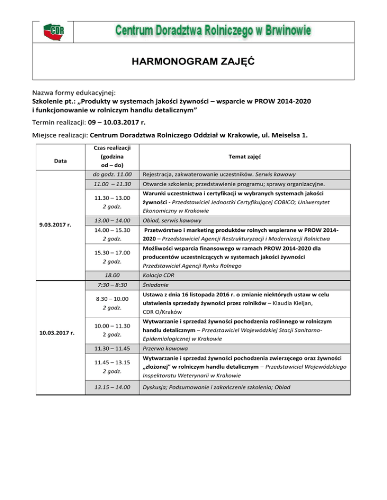 HARMONOGRAM ZAJĘĆ Nazwa formy edukacyjnej: Szkolenie pt.: „Produkty w systemach jakości żywności – wsparcie w PROW 2014-2020 i funkcjonowanie w rolniczym handlu detalicznym” Termin realizacji: 09 – 10.03.2017 r. Miejsce realizacji: Centrum Doradztwa Rolniczego Oddział w Krakowie, ul. Meiselsa 1. Data 9.03.2017 r. Czas realizacji (godzina od – do) do godz. 11.00 Rejestracja, zakwaterowanie uczestników. Serwis kawowy 11.00 – 11.30 Otwarcie szkolenia; przedstawienie programu; sprawy organizacyjne. 11.30 – 13.00 2 godz. Warunki uczestnictwa i certyfikacji w wybranych systemach jakości żywności - Przedstawiciel Jednostki Certyfikującej COBICO; Uniwersytet Ekonomiczny w Krakowie 13.00 – 14.00 Obiad, serwis kawowy 14.00 – 15.30 2 godz. Przetwórstwo i marketing produktów rolnych wspierane w PROW 20142020 – Przedstawiciel Agencji Restrukturyzacji i Modernizacji Rolnictwa 15.30 – 17.00 2 godz. Możliwości wsparcia finansowego w ramach PROW 2014-2020 dla producentów uczestniczących w systemach jakości żywności Przedstawiciel Agencji Rynku Rolnego 18.00 10.03.2017 r. Temat zajęć Kolacja CDR 7:30 – 8:30 Śniadanie 8.30 – 10.00 2 godz. Ustawa z dnia 16 listopada 2016 r. o zmianie niektórych ustaw w celu ułatwienia sprzedaży żywności przez rolników – Klaudia Kieljan, CDR O/Kraków 10.00 – 11.30 2 godz. Wytwarzanie i sprzedaż żywności pochodzenia roślinnego w rolniczym handlu detalicznym – Przedstawiciel Wojewódzkiej Stacji SanitarnoEpidemiologicznej w Krakowie 11.30 – 11.45 Przerwa kawowa 11.45 – 13.15 2 godz. Wytwarzanie i sprzedaż żywności pochodzenia zwierzęcego oraz żywności „złożonej” w rolniczym handlu detalicznym – Przedstawiciel Wojewódzkiego Inspektoratu Weterynarii w Krakowie 13.15 – 14.00 Dyskusja; Podsumowanie i zakończenie szkolenia; Obiad