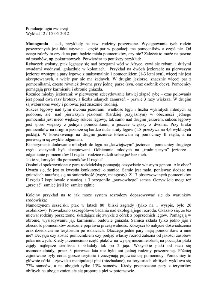 Populacjologia zwierząt Wykład 12 / 15-05-2012 Monogamia – c.d., przykłady na tzw. rodziny poszerzone. Występowanie tych rodzin poszerzonych jest fakultatywne – część par w populacji ma pomocników a część nie. Od czego zależy to czy dana para będzie miała pomocników, czy nie? Zależeć to może na pewno od zasobów, np. pokarmowych. Potwierdza to poniższy przykład: Rybaczek srokaty, ptak lęgnący się nad brzegami wód w Afryce, żywi się rybami i dużymi owadami wodnymi, gniazduje w koloniach. Przykład na dwóch jeziorach: na pierwszym jeziorze występują pary lęgowe z maksymalnie 1 pomocnikiem (1-3 letni syn), więcej nie jest akceptowanych, a wiele par nie ma żadnych. W drugim jeziorze, znacznie więcej par z pomocnikami, często również dwoma przy jednej parze (syn, oraz osobnik obcy). Pomocnicy pomagają przy karmieniu i obronie gniazda. Różnice między jeziorami: w pierwszym zdecydowanie łatwiej złapać rybę – czas polowania jest ponad dwa razy krótszy, a liczba udanych zanurzeń – prawie 3 razy większa. W drugim są wzburzone wody i polować jest znacznie trudniej. Sukces lęgowy nad tymi dwoma jeziorami: wielkość lęgu i liczba wyklutych młodych są podobne, ale: nad pierwszym jeziorem (bardziej przyjaznym) w obecności jednego pomocnika jest nieco większy sukces lęgowy, tak samo nad drugim jeziorem, sukces lęgowy jest sporo większy z jednym pomocnikiem, a jeszcze większy z dwoma. Przy braku pomocników na drugim jeziorze są bardzo duże straty lęgów (1.8 przeżywa na 4,6 wyklutych piskląt). W konsekwencji na drugim jeziorze tolerowani są pomocnicy II rzędu, a na pierwszym są zwykle odganiani. Eksperyment: dodawanie młodych do lęgu na „łatwiejszym” jeziorze – pomocnicy drugiego rzędu zaczynali być akceptowani. Odbieranie młodych na „trudniejszym” jeziorze – odganianie pomocników II rzędu – rodzice radzili sobie już bez nich. Jakie są korzyści dla pomocników II rzędu? Osobniki spokrewnione z parą rodzicielską pomagają oczywiście własnym genom. Ale obce? Uważa się, że jest to kwestia konkurencji o samice. Samic jest mało, ponieważ siedząc na gniazdach narażają się na śmiertelność (węże, mangusty). Z 17 obserwowanych pomocników II rzędu 7 kopulowało z samicą, a 3 przegoniło „prawowitego” samca. Oczywiście mogą też „przejąć” samicę jeśli jej samiec zginie. Kolejny przykład na to jak może system rozrodczy dopasowywać się do warunków środowiska: Namorzynem seszelski, ptak w latach 80’ bliski zagłady (tylko na 1 wyspie, było 26 osobników). Prowadzono szczegółowe badania nad ekologią jego rozrodu. Okazało się, że też miewał rodziny poszerzone, składające się zwykle z córek z poprzednich lęgów. Pomagają w obronie, wysiadywaniu jaj, karmieniu, budowie gniazda. Samica składa tylko jedno jajo i obecność pomocników znacznie poprawia przeżywalność. Korzyści to nabycie doświadczenia oraz dziedziczenie terytorium po rodzicach. Dlaczego jedne pary mają pomocników a inne nie? Decyzja czy zostać pomocnikiem czy podjąć własny rozród zależna od jakości zasobów pokarmowych. Kiedy przeniesiono część ptaków na wyspę niezamieszkałą na początku ptaki zajęły najlepsze siedliska i składały tak po 2 jaja. Wszystkie ptaki od razu się usamodzielniały, przez 3 pierwsze lata nie było ani jednej rodziny poszerzonej. Później zajmowane były coraz gorsze terytoria i zaczynają pojawiać się pomocnicy. Pomocnicy to głównie córki – zjawisko manipulacji płci (niezbadane), na terytoriach obfitych wykluwa się 77% samców, a na ubogich tylko 13% samców. Kiedy przenoszono pary z terytoriów obfitych na ubogie zmieniała się proporcja płci w potomstwie. Poligynia Wiąże się ze ścisłym terytorializmem samców. Na swoje terytorium zwabia kilka samic. Zwykle jest to system występujący fakultatywnie w populacji, w określonych warunkach. Najwięcej przykładów u ptaków wróblowych, np. u trzciniaka. Normalnie wykazuje on zwykłą monogamię, ale u części samic do jednego samca jest zwabianych więcej. Jednak nie jest tak, że samic jest w populacji za dużo w stosunku do samców, bo część samców pozostaje bez partnerek. Dlaczego? Terytoria są różnej wielkości, być może świadczy to o jakości samców. Samica ma więc dylemat czy wybrać samca który ma dobre terytorium ale ma już jakąś partnerkę, czy samca który ma słabe terytorium, ale jest sam, więc w sumie może pomóc przy odchowywaniu. Wg koncepcji Oriansa samica ocenia koszt dzielenia się samcem z inną samicą. Jeżeli różnica jakości terytoriów samca z partnerką i samotnego jest większy od kosztów wynikających z dzielenia się samcem z inną samicą – opłaca się zostać samicą II rzędu. To tzw. próg poligynii. Występowanie poligynii może więc zależeć od zasobności środowiska, zagęszczenia populacji. Potwierdzenie – udział samców poligynicznych w populacji jest zależny od warunków środowiska. Polska, i okolice: odstęp między złożeniem pierwszego jaja przez samicę II rzędu a samicę I rzędu jest bardzo krótki. Udział samców poligynicznych różny w 3 badanych siedliskach. U trzciniaków w Japonii stwierdzono udział poligynicznych samców rzędu 17-80%. Dlaczego tak dużo? Przedział między złożeniem jaja przez samicę I rzędu a drugiego rzędu jest znacznie większy niż w Polsce. A więc druga samica może liczyć na większą pomoc samca przy karmieniu. Jednak największe znaczenie ma prawdopodobnie to, że populacje lęgowe mają b. duże zagęszczenia, bo w pobliżu są bardzo obfite zasoby pokarmowe – pola ryżowe, bardzo dużo owadów. Nawet porzucone samice mogą samotnie wykarmić młode. Harem – koszty utrzymania haremu dla samca są bardzo duże – obrona i pilnowanie samic przed innymi samcami. Jeśli ruja jest u wszystkich samic jednocześnie, to na stałe nie opłaca się samcowi utrzymywać
