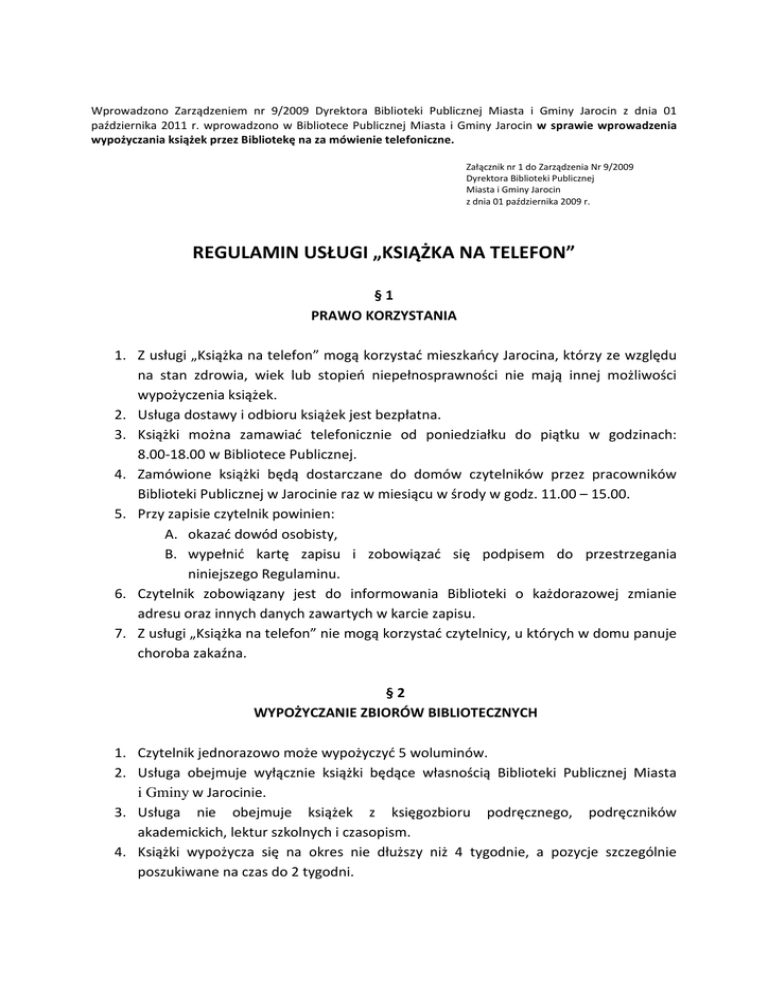 Wprowadzono Zarządzeniem nr 9/2009 Dyrektora Biblioteki Publicznej Miasta i Gminy Jarocin z dnia 01 października 2011 r. wprowadzono w Bibliotece Publicznej Miasta i Gminy Jarocin w sprawie wprowadzenia wypożyczania książek przez Bibliotekę na za mówienie telefoniczne. Załącznik nr 1 do Zarządzenia Nr 9/2009 Dyrektora Biblioteki Publicznej Miasta i Gminy Jarocin z dnia 01 października 2009 r. REGULAMIN USŁUGI „KSIĄŻKA NA TELEFON” §1 PRAWO KORZYSTANIA 1. Z usługi „Książka na telefon” mogą korzystać mieszkańcy Jarocina, którzy ze względu na stan zdrowia, wiek lub stopień niepełnosprawności nie mają innej możliwości wypożyczenia książek. 2. Usługa dostawy i odbioru książek jest bezpłatna. 3. Książki można zamawiać telefonicznie od poniedziałku do piątku w godzinach: 8.00-18.00 w Bibliotece Publicznej. 4. Zamówione książki będą dostarczane do domów czytelników przez pracowników Biblioteki Publicznej w Jarocinie raz w miesiącu w środy w godz. 11.00 – 15.00. 5. Przy zapisie czytelnik powinien: A. okazać dowód osobisty, B. wypełnić kartę zapisu i zobowiązać się podpisem do przestrzegania niniejszego Regulaminu. 6. Czytelnik zobowiązany jest do informowania Biblioteki o każdorazowej zmianie adresu oraz innych danych zawartych w karcie zapisu. 7. Z usługi „Książka na telefon” nie mogą korzystać czytelnicy, u których w domu panuje choroba zakaźna. §2 WYPOŻYCZANIE ZBIORÓW BIBLIOTECZNYCH 1. Czytelnik jednorazowo może wypożyczyć 5 woluminów. 2. Usługa obejmuje wyłącznie książki będące własnością Biblioteki Publicznej Miasta i Gminy w Jarocinie. 3. Usługa nie obejmuje książek z księgozbioru podręcznego, podręczników akademickich, lektur szkolnych i czasopism. 4. Książki wypożycza się na okres nie dłuższy niż 4 tygodnie, a pozycje szczególnie poszukiwane na czas do 2 tygodni. 5. Termin zwrotu wypożyczonych książek może zostać przesunięty tylko wówczas, gdy nie ma na nie zapotrzebowania ze strony innych czytelników. 6. Czytelnik może rezerwować książki aktualnie wypożyczone przez innych czytelników. §3 POSZANOWANIE I ZABEZPIECZENIE ZBIORÓW 1. Czytelnik powinien starannie obchodzić się z wypożyczonymi materiałami bibliotecznymi. Wszelkie zauważone uszkodzenia należy zgłosić bibliotekarzowi. 2. Czytelnik odpowiada za szkody wynikłe z zagubienia, uszkodzenia lub zniszczenia książek. 3. Wysokość odszkodowania ustalają pracownicy Biblioteki, w zależności od aktualnej wartości rynkowej książki i stopnia jej uszkodzenia. 4. Czytelnik może, za zgodą pracownika Biblioteki, dostarczyć zamiast zagubionej lub zniszczonej – inną książkę, jednak nie mniejszej wartości i przydatną dla Biblioteki. §4 POSTANOWIENIA KOŃCOWE 1. Pracownicy Biblioteki na prośbę czytelnika udzielają informacji o książkach oraz pomagają w doborze lektury. 2. Czytelnik nie stosujący się do przepisów niniejszego Regulaminu może być czasowo, a w szczególnie drastycznych przypadkach na stałe pozbawiony prawa korzystania z usługi „Książka na telefon”. 3. Decyzję w tej sprawie podejmują odpowiadający za prowadzenie usługi pracownicy Biblioteki. 4. Czytelnikowi przysługuje prawo odwołania się od tej decyzji do Dyrektora Biblioteki Publicznej Miasta i Gminy Jarocin. 5. W sprawach nie ujętych w niniejszym Regulaminie mają zastosowanie przepisy zawarte w Regulaminie Biblioteki Publicznej Miasta i Gminy Jarocin. 6. Niniejszy Regulamin obowiązuje od dnia 1 października 2009 r.