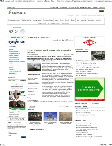 Muck Master, czyli rozrzutniki obornika Pichon - Maszyny rolnicze - F... 1 sur 2 GRUPA PTWP http://www.farmer.pl/technika-rolnicza/maszyny-rolnicze/muck-master-... GOSPODA RKA SA MORZĄ DY NIE RU CHOMOŚCI RYNE K SPOŻYWCZY HA NDE L ZDROWIE szukaj ogłoszenia Produkcja zwierzęca Produkcja roślinna Środki produkcji Technika rolnicza Maszyny rolnicze Finanse Prawo Serwis, części, osprzęt Energia Biznes forum newsletter Fakty Agroskop prenumerata Kalendarium konferencje Agrosfera Testy Farmera Warszawa 2012.02.13 poniedziałek -11°C -7°C min max Pogoda szczegółowa PARTNER PORTALU TECHNIKA ROLNICZA Maszyny rolnicze PARTNER SERWISU NA SKRÓTY Zboża Muck Master, czyli rozrzutniki obornika Pichon Środki produkcji Dopłaty i dotacje Autor: farmer.pl/kh Porady prawne Ceny nawozów Ceny w skupach Rejestr środków ochrony roślin Galerie Farmer.tv Praca w rolnictwie fot. Pichon Konferencje Przeczytaj również NEWSLETTER adres e-mail zamów zamów więcej o newsletterze » NOWY NUMER FARMERA FARMER NR 2/2012 Axion 900 – jeszcze większy uciąg Pomocne w żywieniu niewielkich stad bydła Zasada współzależności Prawo chroni glebę AGROTECH Złoto odebrane więcej Rajdowiec farmer 09-02-2012 10:52 Pierwsze rozrzutniki obornika Muck Master Pichon zaprezentował podczas ubiegłorocznych targów Sima w Paryżu. Po pozytywnych analizach i ocenach maszyn przez pierwszych użytkowników firma wprowadziła osiem modeli rozrzutników. Kalendarium Farmera AKTUALNOŚCI Muck Master, czyli rozrzutniki obornika Pichon Osiem modeli rozrzutników z serii Muck Master Axion 900 – jeszcze większy uciąg dysponuje pojemnościami od 12 do 24 m3. Okazją do zapoznania się z konstruckją nowych maszyn będą targi Polagra Premiery (16-19 luty), a później Agrotech Kielce (16-18 marca), gdzie firma przedstawi model M14. Traktorem szarżował w policjantów Konstrukcja M14 opiera się na ramie modelu M12 i jest wyposażona w nadstawkę i górną przykrywę Samasz zwiększa moce produkcyjne ochronną, umożliwiającą załadunek 14 m3 obornika. Rozrzutnik wyróżniają m.in. wałki adaptera o ponad metrowej średnicy z 46 odwróconymi nożami, umożliwiającymi równomierne rozrzucenie materiału z jednoczesnym zachowaniem jednakowej wydajności pracy. Nowe na topie, stagnacja w używanych Rok sukcesów w John Deere Steyr wkracza na Podlasie ATV do przeglądu M14, podobnie jak pozostałe rozrzutniki z tej serii, ma możliwość doposażenia w takie elementy jak: Ten nowy M14 może być wyposażony w różnego rodzaju opcje dodatkowe, które są również dostępne dla całej gamy rozrzutników, jak np. zasuwa gilotynowa, centrala hydrauliczna, sterowanie z kabiny, jeden lub dwa deflektory boczne oraz naprężenie hydrauliczne łańcucha taśmy. Więcej informacji: obornik | AGROTECH | rozrzutnik | Pichon | Polagra Premiery | nawożenie organiczne NAJCZĘŚCIEJ CZYTANE udostępnij Strategie w postępowaniu z mastitis farmer.pl na acebooku aktualności » 7 dni » miesiąc | artykuły Sam świni nie ubijesz POLECAMY Jeżdżenie po alkoholu na własnym polu dozwolone Nawozy cały czas drożeją Silny i komfortowy Nowe rekordy cen zbóż w Paryżu Mocznik z ureazą Najważniejsze odbudować rozetę ZAMÓW PRENUMERATĘ ARTYKUŁY SONDA zobacz wyniki Sejm głosami koalicji odrzucił możliwość zaliczkowego wypłacania płatności bezpośrednich. Czy rolnicy na tym stracą? nie Projekt nowelizacji ustawy o organizacji rynku mleka Różnice cen w Paryżu i w Polsce Tydzień spadków cen surowców rolnych więcej Nietypowe grzałki na tęgie mrozy Dobra beczka, czyli jaka? VRA, czyli oszczędzaj na nawożeniu Wasze komentarze Nowa technologia kiszenia kukurydzy a wydajność mleczna Uprawa w komplecie nie mam zdania Agro Show okiem Farmera tak głosuj Kontroler obrotów i wszystko pod nadzorem 13/02/2012 10:43