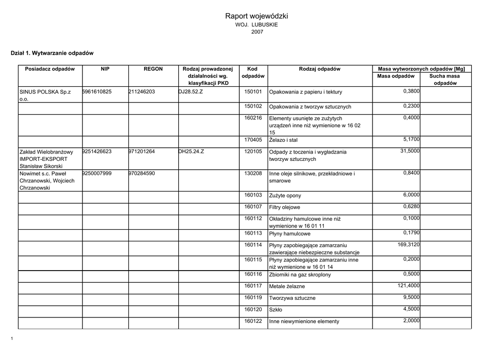 Raport wojewódzki WOJ. LUBUSKIE 2007 Dział 1. Wytwarzanie odpadów Posiadacz odpadów SINUS POLSKA Sp.z o.o. NIP 5961610825 REGON 211246203 Rodzaj prowadzonej działalności wg. klasyfikacji PKD DJ28.52.Z Kod odpadów 9251426623 971201264 9250007999 970284590 DH25.24.Z Opakowania z papieru i tektury 0,3800 150102 Opakowania z tworzyw sztucznych 0,2300 160216 Elementy usunięte ze zużytych urządzeń inne niż wymienione w 16 02 15 Żelazo i stal 0,4000 5,1700 31,5000 120105 Odpady z toczenia i wygładzania tworzyw sztucznych 130208 Inne oleje silnikowe, przekładniowe i smarowe 0,8400 160103 Zużyte opony 6,0000 160107 Filtry olejowe 0,6280 160112 Okładziny hamulcowe inne niż wymienione w 16 01 11 Płyny hamulcowe 0,1000 160113 0,1790 169,3120 160116 Płyny zapobiegające zamarzaniu zawierające niebezpieczne substancje Płyny zapobiegające zamarzaniu inne niż wymienione w 16 01 14 Zbiorniki na gaz skroplony 160117 Metale żelazne 121,4000 160119 Tworzywa sztuczne 9,5000 160120 Szkło 4,5000 160122 Inne niewymienione elementy 2,0000 160114 160115 1 Masa wytworzonych odpadów [Mg] Masa odpadów Sucha masa odpadów 150101 170405 Zakład Wielobranżowy IMPORT-EKSPORT Stanisław Sikorski Nowimet s.c. Paweł Chrzanowski, Wojciech Chrzanowski Rodzaj odpadów 0,2000 0,5000 970331438 Przedsiębiorstwo Handlowo-Produkcyjne "FERMPOL" Sp. z o.o. 160601 Baterie i akumulatory ołowiowe 5,9250 160801 0,2000 170401 Zużyte katalizatory zawierające złoto, srebro, ren, rod, pallad, iryd lub platynę (z wyłączeniem 16 08 07) Miedź, brąz, mosiądz 170402 Aluminium 1,2000 020102 Odpadowa tkanka zwierzęca 020106 Odchody zwierzęce 100101 Żużle, popioły paleniskowe i pyły z kotłów (z wyłączeniem pyłów z kotłów wymienionych w 10 01 04) Zużyte urządzenia zawierające niebezpieczne elementy inne niż wymienione w 16 02 09 do 16 02 12 Leki inne niż wymienione w 18 01 08 160213 Apteka MELISSA Małgorzata Wysoczańska BIOFAKTOR SP. Z O.O. 9270000405 970058209 8361667770 750703910 G52.31.Z 180109 2 210029024 DK29.22.Z 3,6000 12,0000 0,0080 0,0075 0,8320 150101 150102 Opakowania z tworzyw sztucznych 0,1500 150105 Opakowania wielomateriałowe 0,2100 150110 Opakowania zawierające pozostałości substancji niebezpiecznych lub nimi zanieczyszczone (np. środkami ochrony roślin I i II klasy toksyczności - bardzo toksyczne i toksyczne) Elementy usunięte ze zużytych urządzeń inne niż wymienione w 16 02 15 Leki inne niż wymienione w 18 02 07 0,0130 180208 5990009013 26,0000 Inne zużyte sorbenty i osady pofiltracyjne Opakowania z papieru i tektury 070510 160216 STAL-TECH SP.ZO.O. 0,5000 120101 150101 Odpady z toczenia i piłowania żelaza oraz jego stopów Opakowania z papieru i tektury 150104 Opakowania z metali 2,0600 0,0031 0,6800 46,0000 1,6000 0,1000 150110 Apteka "WEGA" Sp. z o.o. Gospodarstwo Drobiarskie Stanisław Bugaj 9281838721 977919838 G52.31.Z 970275562 170405 180109 Leki inne niż wymienione w 18 01 08 020102 Odpadowa tkanka zwierzęca 3 158,0000 020106 Odchody zwierzęce 5 095,0000 160113 Płyny hamulcowe 0,0040 Inne odpady, które zawierają żywe drobnoustroje chorobotwórcze lub ich toksyny oraz inne formy zdolne do przeniesienia materiału genetycznego, o których wiadomo lub co do których istnieją wiarygodne podstawy do sądzenia, że wywołują choroby u ludzi i zwi Odpady z toczenia i piłowania żelaza oraz jego stopów 0,0240 Odpady z toczenia i wygładzania tworzyw sztucznych Odpadowe emulsje i roztwory z obróbki metali niezawierające chlorowców Inne oleje silnikowe, przekładniowe i smarowe Sorbenty, materiały filtracyjne (w tym filtry olejowe nieujęte w innych grupach), tkaniny do wycierania (np. szmaty, ścierki) i ubrania ochronne zanieczyszczone substancjami niebezpiecznymi (np. PCB) Zużyte urządzenia zawierające niebezpieczne elementy inne niż wymienione w 16 02 09 do 16 02 12 Odpady z przetworzonych włókien tekstylnych 0,2000 Niepubliczny Zakład Opieki Zdrowotnej "Kolejarz" 5981067063 210161143 N85.12.Z 180103 PRZEDSIĘBIORSTWO WIELOBRANŻOWE "SYREX"CZESŁAW SYREK 5980000192 003157624 DH25.24.Z 120101 120105 120109 130208 150202 160213 "GAMA" S.J. 3 9730748112 978001321 0,1250 Opakowania zawierające pozostałości substancji niebezpiecznych lub nimi zanieczyszczone (np. środkami ochrony roślin I i II klasy toksyczności - bardzo toksyczne i toksyczne) Żelazo i stal 040222 274,2000 0,0089 5,0000 0,0400 0,0200 0,3000 0,0010 17,4000 Tabor Szynowy Opole S.A.-ZIELONA GÓRA 7541008666 530973880 030105 080199 108,8000 120102 Cząstki i pyły żelaza oraz jego stopów 13,7000 130208 0,1090 150101 Inne oleje silnikowe, przekładniowe i smarowe Opakowania z papieru i tektury 150102 Opakowania z tworzyw sztucznych 0,3000 150104 Opakowania z metali 150203 170401 Sorbenty, materiały filtracyjne, tkaniny do wycierania (np. szmaty, ścierki) i ubrania ochronne inne niż wymienione w 15 02 02 Odpady betonu oraz gruz betonowy z rozbiórek i remontów Miedź, brąz, mosiądz 170402 Aluminium 200121 Lampy fluorescencyjne i inne odpady zawierające rtęć Odpady farb i lakierów zawierających rozpuszczalniki organiczne lub inne substancje niebezpieczne Odpady z odtłuszczania zawierające substancje niebezpieczne Odpady z toczenia i piłowania żelaza oraz jego stopów Odpadowe emulsje i roztwory z obróbki metali niezawierające chlorowców Szlamy z obróbki metali zawierające substancje niebezpieczne Mineralne oleje hydrauliczne niezawierające związków chlorowcoorganicznych Opakowania z drewna 080118 170101 ThyssenKrupp Presta SteerTec Poland Sp. z o.o. 210347936 DM34.30.A 080111 110113 120101 120109 120114 130110 150103 4 0,1000 Trociny, wióry, ścinki, drewno, płyta wiórowa i fornir inne niż wymienione w 03 01 04 Odpady z usuwania farb i lakierów inne niż wymienione w 08 01 17 Inne niewymienione odpady 19,5000 0,3000 15,9000 1,7000 25,0000 0,4000 0,0000 148,1200 0,3350 1,9500 0,7000 8,5000 1,2700 2,9000 0,7000 Sorbenty, materiały filtracyjn