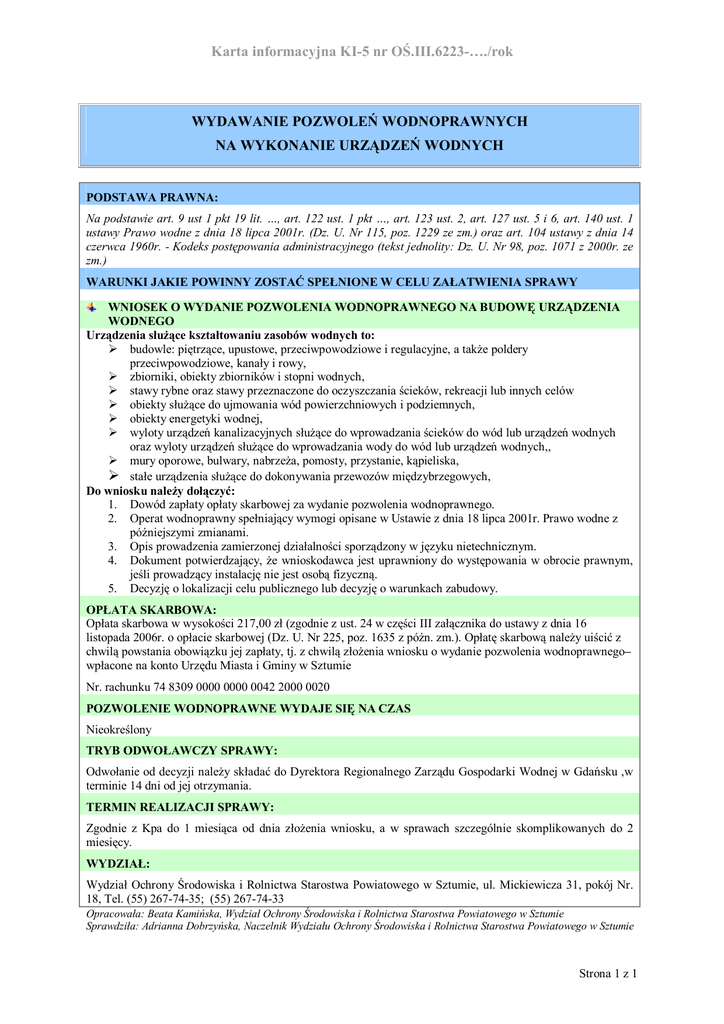 Karta informacyjna KI-5 nr OŚ.III.6223-…./rok WYDAWANIE POZWOLEŃ WODNOPRAWNYCH NA WYKONANIE URZĄDZEŃ WODNYCH PODSTAWA PRAWNA: Na podstawie art. 9 ust 1 pkt 19 lit. …, art. 122 ust. 1 pkt …, art. 123 ust. 2, art. 127 ust. 5 i 6, art. 140 ust. 1 ustawy Prawo wodne z dnia 18 lipca 2001r. (Dz. U. Nr 115, poz. 1229 ze zm.) oraz art. 104 ustawy z dnia 14 czerwca 1960r. - Kodeks postępowania administracyjnego (tekst jednolity: Dz. U. Nr 98, poz. 1071 z 2000r. ze zm.) WARUNKI JAKIE POWINNY ZOSTAĆ SPEŁNIONE W CELU ZAŁATWIENIA SPRAWY WNIOSEK O WYDANIE POZWOLENIA WODNOPRAWNEGO NA BUDOWĘ URZĄDZENIA WODNEGO Urządzenia służące kształtowaniu zasobów wodnych to: budowle: piętrzące, upustowe, przeciwpowodziowe i regulacyjne, a także poldery przeciwpowodziowe, kanały i rowy, zbiorniki, obiekty zbiorników i stopni wodnych, stawy rybne oraz stawy przeznaczone do oczyszczania ścieków, rekreacji lub innych celów obiekty służące do ujmowania wód powierzchniowych i podziemnych, obiekty energetyki wodnej, wyloty urządzeń kanalizacyjnych służące do wprowadzania ścieków do wód lub urządzeń wodnych oraz wyloty urządzeń służące do wprowadzania wody do wód lub urządzeń wodnych,, mury oporowe, bulwary, nabrzeża, pomosty, przystanie, kąpieliska, stałe urządzenia służące do dokonywania przewozów międzybrzegowych, Do wniosku należy dołączyć: 1. Dowód zapłaty opłaty skarbowej za wydanie pozwolenia wodnoprawnego. 2. Operat wodnoprawny spełniający wymogi opisane w Ustawie z dnia 18 lipca 2001r. Prawo wodne z późniejszymi zmianami. 3. Opis prowadzenia zamierzonej działalności sporządzony w języku nietechnicznym. 4. Dokument potwierdzający, że wnioskodawca jest uprawniony do występowania w obrocie prawnym, jeśli prowadzący instalację nie jest osobą fizyczną. 5. Decyzję o lokalizacji celu publicznego lub decyzję o warunkach zabudowy. OPŁATA SKARBOWA: Opłata skarbowa w wysokości 217,00 zł (zgodnie z ust. 24 w części III załącznika do ustawy z dnia 16 listopada 2006r. o opłacie skarbowej (Dz. U. Nr 225, poz. 1635 z późn. zm.). Opłatę skarbową należy uiścić z chwilą powstania obowiązku jej zapłaty, tj. z chwilą złożenia wniosku o wydanie pozwolenia wodnoprawnego– wpłacone na konto Urzędu Miasta i Gminy w Sztumie Nr. rachunku 74 8309 0000 0000 0042 2000 0020 POZWOLENIE WODNOPRAWNE WYDAJE SIĘ NA CZAS Nieokreślony TRYB ODWOŁAWCZY SPRAWY: Odwołanie od decyzji należy składać do Dyrektora Regionalnego Zarządu Gospodarki Wodnej w Gdańsku ,w terminie 14 dni od jej otrzymania. TERMIN REALIZACJI SPRAWY: Zgodnie z Kpa do 1 miesiąca od dnia złożenia wniosku, a w sprawach szczególnie skomplikowanych do 2 miesięcy. WYDZIAŁ: Wydział Ochrony Środowiska i Rolnictwa Starostwa Powiatowego w Sztumie, ul. Mickiewicza 31, pokój Nr. 18, Tel. (55) 267-74-35; (55) 267-74-33 Opracowała: Beata Kamińska, Wydział Ochrony Środowiska i Rolnictwa Starostwa Powiatowego w Sztumie Sprawdziła: Adrianna Dobrzyńska, Naczelnik Wydziału Ochrony Środowiska i Rolnictwa Starostwa Powiatowego w Sztumie Strona 1 z 1