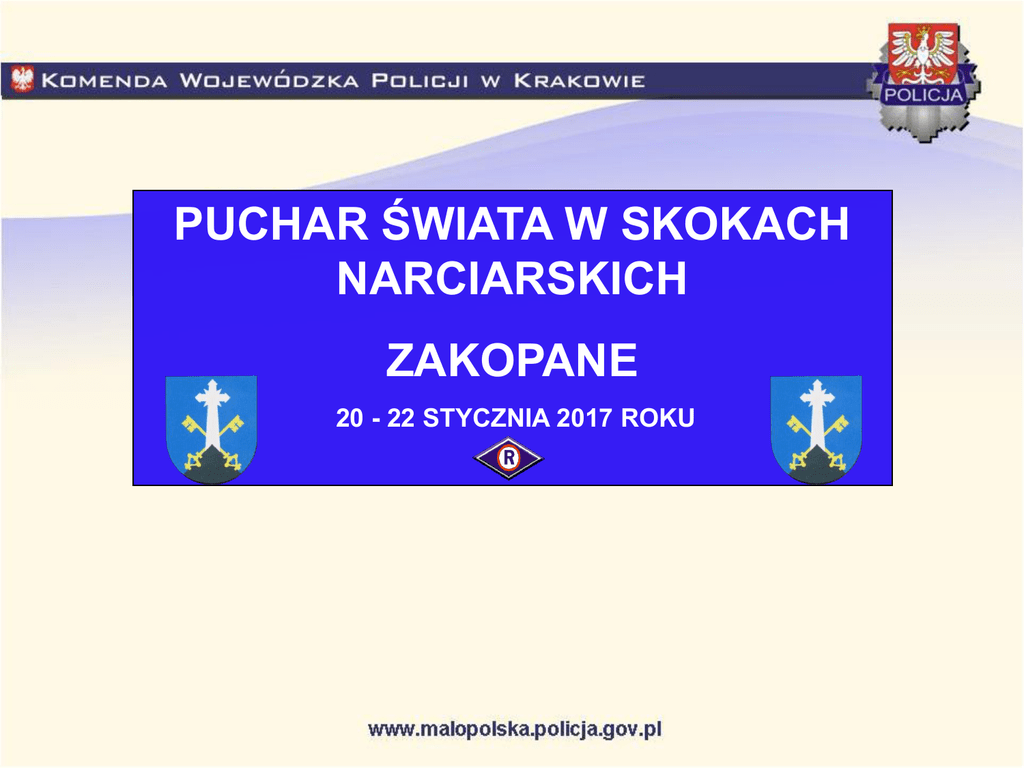 PUCHAR ŚWIATA W SKOKACH NARCIARSKICH ZAKOPANE 20 - 22 STYCZNIA 2017 ROKU Program Pucharu Świata Zakopane 2017 19.01.2017 r. (czwartek) • godz. 16:00 - przyjazd ekip do Zakopanego. 20.01.2017 r. (piątek) • • • godz. 11:00 - odprawa techniczna, godz. 16:00 - oficjalny trening (2 serie), godz. 18:00 - seria kwalifikacyjna. 21.01.2017 r. (sobota) • • godz. 14:45 - seria próbna, godz. 16:00 - drużynowy Konkurs Skoków Pucharu Świata. 22.01.2017 r. (niedziela) • • godz. 14:30 – seria próbna, godz. 16:00 – Konkurs Skoków Pucharu Świata. Udając się do Zakopanego na zawody Pucharu Świata w Skokach Narciarskich w dniach 20 – 22 stycznia 2017 r. Pamiętaj - stosuj się do przepisów ruchu drogowego, - nastąpią zmiany w organizacji ruchu, - stosuj się do poleceń policjantów, strażników miejskich i innych osób uprawnionych do wydawania poleceń na drodze, - samochód parkuj na wyznaczonym parkingu, na wielu ulicach obowiązywał będzie zakaz parkowania i zakaz ruchu pojazdów, - nie zostawiaj wartościowych przedmiotów w zaparkowanym samochodzie. Puchar Świata w Skokach Narciarskich w Zakopanem jest IMPREZĄ MASOWĄ w związku z tym zabrania się m.in.: - wnoszenia lub posiadania napojów alkoholowych, - rzucania przedmiotów, mogących stanowić zagrożenie dla życia, zdrowia lub bezpieczeństwa osób przebywających na terenie imprezy masowej, - wnoszenia lub posiadania broni, innych niebezpiecznych przedmiotów lub materiałów wybuchowych, - wnoszenia lub posiadania wyrobów pirotechnicznych lub materiałów pożarowo niebezpiecznych, Karze podlega również osoba, która nie wykonuje polecenia porządkowego, wydanego na podstawie regulaminu obiektu (terenu) lub regulaminu imprezy masowej, przez służby porządkowe lub służby informacyjnie. Ustawa z dnia 20 marca 2009 roku Dz. U 62 poz. 504 - o bezpieczeństwie imprez masowych z późn. zmianami DOJAZD I POWRÓT Z ZAKOPANEGO W związku z przewidywanym znaczącym wzrostem natężenia ruchu drogowego na drogach dojazdowych i wyjazdowych z Zakopanego w okresie Pucharu Świata kierujący powinni korzystać oprócz „zakopianki” również z dróg alternatywnych, szczególnie, jeżeli ze względu na cel podróży nie muszą kierować się bezpośrednio na Kraków. W przypadku znacznego pogorszenia warunków atmosferycznych, związanego z intensywnymi opadami śniegu, oblodzeniami, itp. proponuje się korzystać z dróg o najwyższym standardzie utrzymania – przede wszystkim dróg krajowych, w tym głównie z „zakopianki”. Trasy dojazdu do Zakopanego Kraków Tarnów Brzesko Głogoczów Wadowice Myślenice Mszana Dln. Nowy Sącz Skomielna Biała Rabka Jabłonka Nowy Targ Czarny Dunajec Zakopane Trasa główna: Trasy dojazdu do Zakopanego Kraków (Południowe Autostradowe Obejście Krakowa) – Myślenice (droga krajowa nr 7) – Skomielna Biała (droga krajowa nr 7) – Rabka (droga krajowa nr 47) – Nowy Targ (droga krajowa nr 47) - Zakopane Trasy alternatywne - dla samochodów osobowych: Kraków (Południowe Autostradowe Obejście Krakowa) – Wieliczka – droga wojewódzka nr 964 – Dobczyce – Kasina Wielka – droga krajowa nr 28 – Mszana Dolna - Rabka – droga krajowa nr 7 – droga krajowa nr 47 - Zakopane Rabka – droga krajowa nr 7 – Jabłonka – droga wojewódzka nr 957 – Czarny Dunajec – droga wojewódzka nr 958 - Zakopane Rabka – droga wojewódzka nr 958 – Czarny Dunajec – droga wojewódzka nr 958 - Zakopane Kraków (Południowe Autostradowe Obejście Krakowa) – droga krajowa nr 7 – Głogoczów – droga krajowa nr 52 – Wadowice – droga krajowa nr 28 - Sucha Beskidzka - Skomielna Biała - droga krajowa nr 7 - Zakopane Autostrada A4 – Chrzanów – droga wojewódzka nr 933 – Oświęcim – droga krajowa nr 44 – Zator - droga krajowa nr 44 i droga krajowa nr 28- Wadowice – droga krajowa nr 28 - Sucha Beskidzka - Skomielna Biała - droga krajowa nr 7 - Zakopane Tarnów – droga krajowa nr 4 – Brzesko – droga krajowa nr 75 - Nowy Sącz – droga wojewódzka nr 969 – Nowy Targ – droga krajowa nr 49 – Bukowina Tatrzańska - Droga wojewódzka nr 960 - Zakopane TRASA GŁÓWNA: Kraków (PAOK) – Myślenice – Skomielna Biała – Rabka – Nowy Targ - Zakopane Trasy alternatywne ( dla samochodów osobowych ): Trasy dojazdu do Zakopanego Kraków (PAOK) –Wieliczka – DW 964 – Dobczyce – Kasina Wlk.- DK 28 – Mszana Dln.- Rabka – DK7 Rabka DK7 –Jabłonka – DW 957 – Czarny Dunajec – DW 958 Zakopane Rabka DW 958 – Czarny Dunajec – DW 958 Zakopane Kraków (PAOK) – DK7 –Głogoczów – DK 52- Wadowice- DK28 Sucha Beskidzka- Skomielna Biała- DK7 A4 – Chrzanów – DW933 – Oświęcim DK 44 – Zator DK 44 i DK28 Wadowice- DK28 Sucha Beskidzka - Skomielna Biała- DK7 Tarnów DK4 – Brzesko DK75- Nowy Sącz DW 969 – Nowy Targ DK49 – Bukowina Tatrzańska DW 960 Kraków Tarnów Kraków Brzesko Głogoczów Wadowice Myślenice Mszana Dln. Nowy Sącz Skomielna Biała Rabka Jabłonka Nowy Targ Czarny Dunajec Zakopane TRASY GŁÓWNE I ALTERNATYWNE DO ZAKOPANEGO ZMIANY ORGANIZACJI RUCHU NA TERENIE ZAKOPANEGO NA CZAS PUCHARU ŚWIATA W SKOKACH NARCIARSKICH 20 – 22 stycznia 2017 roku. Termin zmian organizacji ruchu: Wprowadzenie czasowej zmiany organizacji ruchu nastąpi dnia 20.01.2017 r. (planowane) od godz. 8.00 w tzw. „strefie B-1”, na ulicach prowadzących w kierunku skoczni: -ul. B. Czecha - od. ul. Żeromskiego, z możliwością zatrzymania się na parkingach od Ronda Jana Pawła II do skrzyżowania z ul. Żeromskiego, a po ich zapełnieniu może nastąpić zamknięcie ul. Br. Czecha od Ronda Jana Pawła II, - ul. Piłsudskiego - od ul. Sabały, - od skrzyżowania ul. Szymanowskiego i Zwierzyniecka w kierunku ul. Piłsudskiego. W godzinach wieczorowo-nocnych po treningu i kwalifikacjach oraz po zawodach w sobotę (do godz. 8.00 dnia następnego) strefa ta obejmie mniejszy teren ulic prowadzących w kierunku skoczni: - 