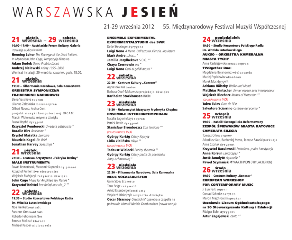 WARSZAWSK A JESIEŃ 21-29 września 2012 piątek sobota – 29 września 21 września 10:00–17:00 – Austriackie Forum Kultury, Galeria Instalacje audiowizualne Henning Loher The Revenge of the Dead Indians: In Memoriam John Cage, kompozycja filmowa Adam Dudek Opera Proibita /Jacek Andrzej Bielawski Atlasy 1995–2008 Wernisaż instalacji: 20 września, czwartek, godz. 18:00. piątek 21 września 19:30 – Filharmonia Narodowa, Sala Koncertowa OrKieStrA SymFOnicZnA FilhArmOnii nArODOWeJ Elena Vassilieva s o p r a n Lilianna Zalesińska m e z z o s o p r a n Gilbert Nouno, Arshia Cont p r o j e k t m u z y k i ko m p u t e r o w e j I R CA M Marcin Wolniewicz reżyseria dźwięku Pascal Rophé d y r y g e n t Krzysztof Penderecki Uwertura pittsburska * Rozalie Hirs Roseherte * Kryštof Mařatka Zverohra Mauricio Kagel Ein Brief Jonathan Harvey Speakings * piątek 21 września 22:30 – Centrum Artystyczne „Fabryka Trzciny” mAłe inStrUmenty: Paweł Romańczuk, Sławomir Kupczak t o y p i a n o s Krzysztof Knittel l i v e e l e c t r o n i c s Wojciech Błażejczyk r e ż y s e r i a d ź w i ę k u John Cage Music for Amplified Toy Pianos * Krzysztof Knittel free for(m) macwin_2 ** 22 września sobota 19:30 – Studio Koncertowe Polskiego Radia im. Witolda Lutosławskiego Noa Frenkel k o n t r a l t Susanne Otto k o n t r a l t Roberto Fabbriciani f l e t Ernesto Molinari k l a r n e t Michael Kasper w i o l o n c z e l a 55. Międzynarodowy Festiwal Muzyki Współczesnej enSemBle eXperimentAl eXperimentAlStUDiO des SWr Detlef Heusinger d y r y g e n t Luigi Nono A Pierre. Dell'azzurro silenzio, inquietum Mark Andre ...hoc... * Jamilia Jazylbekova S.O.G. ** Chaya Czernowin Ina * Luigi Nono Guai ai gelidi mostri * 22 września sobota 22:30 – Centrum Kultury „Koneser” Agnieszka Kuś t a n i e c Barbara Okoń-Makowska p r o j e k c j a Karlheinz Stockhausen INORI dźwięku niedziela 23 września 19:30 – Uniwersytet Muzyczny Fryderyka Chopina enSemBle intercOntempOrAin Natalia Zagorinskaya s o p r a n Patrick Davin d y r y g e n t Stanisław Bromboszcz Con tensione ** (zamówienie wJ) György Kurtág Cztery Kaprysy Lidia Zielińska Ukiya ** (zamówienie wJ) Tadeusz Wielecki Punkty słyszenia ** György Kurtág Cztery pieśni do poematów Anny Achmatowej * niedziela 23 września 22:30 – Filharmonia Narodowa, Sala Kameralna neUe VOcAlSOliSten Galin Stoev l i b r e t t o Titus Selge r e ż y s e r i a Astrid Eisenberger k o s t i u m y Wojciech Błażejczyk r e ż y s e r i a d ź w i ę k u Oscar Strasnoy Geschichte* operetka a cappella na podstawie Historii Witolda Gombrowicza (nowa wersja) poniedziałek 24 września 19:30 – Studio Koncertowe Polskiego Radia im. Witolda Lutosławskiego AUKSO – OrKieStrA KAmerAlnA miAStA tychy Anna Radziejewska m e z z o s o p r a n tWOgether Duo: Magdalena Bojanowicz w i o l o n c z e l a Maciej Frąckiewicz a k o r d e o n Marek Moś dyrygent Adriana Hölszky Wolke und Mond Matthias Pintscher dernier espace avec introspecteur Wojciech Blecharz Means of Protection ** (zamówienie wJ) Toivo Tulev Gare de l’Est Salvatore Sciarrino Cantiere del poema * wtorek 25 września 19:30 – Kościół Ewangelicko-Reformowany ZeSpół ŚpieWAKóW miAStA KAtOWice cAmerAtA SileSiA Tomasz Orlow o r g a n y Arkadiusz Kuc, Bartłomiej Merta, Tomasz Rawski p e r k u s j a Anna Szostak d y r y g e n t Krzysztof Baculewski Preludium, psalm i medytacja Anna Korsun Landscapes * Justė Janulytė Aquarelle * Paweł Szymański ΦΥΛΑΚΤΗΡΙΟΝ (PHYLAKTERION) środa 26 września 19:30 – Centrum Kultury „Koneser” eUrOpeAn WOrKShOp FOr cOntempOrAry mUSic Ji Eun Park s o p r a n Conrad Schmitz b a r y t o n Marcin Majchrowski s p e a k e r Uczniowie liceum Ogólnokształcącego nr 50 Stowarzyszenia Kultury i edukacji Rüdiger Bohn d y r y g e n t Artur Zagajewski canto ** (zamówienie Programu 2 PolSkiego raDia i wJ) Jagoda Szmytka happy deaf people ** (zamówienie euroPeJSkiego centrum muzyki krzySztofa PenDereckiego i wJ ) Manos Tsangaris Vivarium – Reisen, Kochen, Zoo... ** (nowa wersja) zamówienie niemieckieJ raDy muzyczneJ czwartek 27 września 19:30 – Filharmonia Narodowa, Sala Koncertowa ORKIESTRA SYMFONICZNA FILHARMONII NARODOWEJ Łukasz Owczynnikow k o n t r a b a s Ken Ueno ś p i e w a l i k w o t o w y Aneta Kapla-Marszałek, Magdalena Dobrowolska s o p r a n y Kari Kriikku k l a r n e t Rafał Janiak d y r y g e n t Witold Szalonek Musica concertante Ken Ueno On a Sufficient Condition for the Existence of Most Specific Hypothesis * Beat Furrer canti notturni * Kaija Saariaho D’OM LE VRAI SENS * czwartek 27 września 22:30 – Teatr Imka Johanne Saunier t a n i e c , g ł o s Eva Furrer f l e t s u b k o n t r a b a s o w y, g ł o s Michael Schmid f l e t b a s o w y, g ł o s Richard Dubelski p e r k u s j a , g ł o s Georges Aperghis i n s c e n i z a c j a Daniel Lévy s c e n o g r a f i a i w i d e o Georges Aperghis, François Regnault t e k s t y Grégory Beller p r o j e k t m u z y k i ko m p u t e r o w e j I R CA M émilie Morin w s p ó ł p r a c a artystyczna ircAm: Maxime Le Saux r e ż y s e r d ź w i ę k u Yann Philippe p r o j e k t w i d e o Frédéric Vandromme s t a g e m a n a g e r Hervé Frichet o ś w i e t l e n i e Georges Aperghis Luna Park * (zamówienie ircam – centre PomPiDou i wJ) piątek 28 września 19:30 – Filharmonia Narodowa, Sala Kameralna OrKieStrA mUZyKi nOWeJ Agata Zubel r e c y t a c j a Sławomir Pacek a k t o r Beata Chwedorzewska r e ż y s e r Gabriel Gietzky r e ż y s e r Julia Bui-Ngoc w i z u a l i z a c j e Adam Błaszczyk p r o j e k c j e w i d e o Maciej Jabłoński, Michał Pawełek l i v e e l e c t r o n i c s Zbigniew Akonom o ś w i e t l e n i e Szymon Bywalec d y r y g e n t Arnold Schönberg Pierrot lunaire Maciej Jabłoński, Przemysław Fiugajski Księżycowy Pierrot ** (zamówienie wJ) piątek 28 września 22:30 – Centrum Kultury „Koneser” DUO petrini–JÜnG