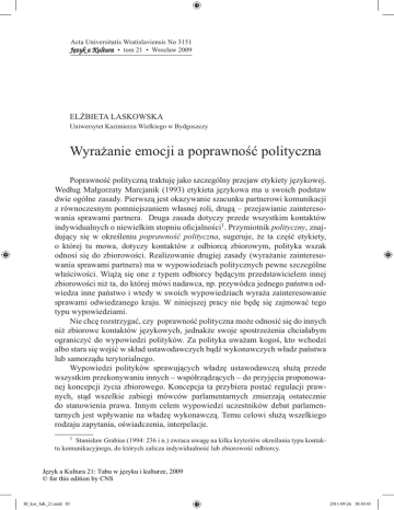 Acta Universitatis Wratislaviensis No 3151 Jêzyk a Kultura • tom 21 • Wrocław 2009 ELŻBIETA LASKOWSKA Uniwersytet Kazimierza Wielkiego w Bydgoszczy Wyrażanie emocji a poprawność polityczna Poprawność polityczną traktuję jako szczególny przejaw etykiety językowej. Według Małgorzaty Marcjanik (1993) etykieta językowa ma u swoich podstaw dwie ogólne zasady. Pierwszą jest okazywanie szacunku partnerowi komunikacji z równoczesnym pomniejszaniem własnej roli, drugą – przejawianie zainteresowania sprawami partnera. Druga zasada dotyczy przede wszystkim kontaktów indywidualnych o niewielkim stopniu oficjalności1. Przymiotnik polityczny, znajdujący się w określeniu poprawność polityczna, sugeruje, że ta część etykiety, o której tu mowa, dotyczy kontaktów z odbiorcą zbiorowym, polityka wszak odnosi się do zbiorowości. Realizowanie drugiej zasady (wyrażanie zainteresowania sprawami partnera) ma w wypowiedziach politycznych pewne szczególne właściwości. Wiążą się one z typem odbiorcy będącym przedstawicielem innej zbiorowości niż ta, do której mówi nadawca, np. przywódca jednego państwa odwiedza inne państwo i wtedy w swoich wypowiedziach wyraża zainteresowanie sprawami odwiedzanego kraju. W niniejszej pracy nie będę się zajmować tego typu wypowiedziami. Nie chcę rozstrzygać, czy poprawność polityczna może odnosić się do innych niż zbiorowe kontaktów językowych, jednakże swoje spostrzeżenia chciałabym ograniczyć do wypowiedzi polityków. Za polityka uważam kogoś, kto wchodzi albo stara się wejść w skład ustawodawczych bądź wykonawczych władz państwa lub samorządu terytorialnego. Wypowiedzi polityków sprawujących władzę ustawodawczą służą przede wszystkim przekonywaniu innych – współrządzących – do przyjęcia proponowanej koncepcji życia zbiorowego. Koncepcja ta przybiera postać regulacji prawnych, stąd wszelkie zabiegi mówców parlamentarnych zmierzają ostatecznie do stanowienia prawa. Innym celem wypowiedzi uczestników debat parlamentarnych jest wpływanie na władzę wykonawczą. Temu celowi służą wszelkiego rodzaju zapytania, oświadczenia, interpelacje. 1 Stanisław Grabias (1994: 236 i n.) zwraca uwagę na kilka kryteriów określania typu kontaktu komunikacyjnego, do których zalicza indywidualność lub zbiorowość odbiorcy. Język a Kultura 21: Tabu w języku i kulturze, 2009 © for this edition by CNS III_kor_JaK_21.indd 85 2011-09-26 10:10:43 86 ELŻBIETA LASKOWSKA Celem wypowiedzi polityków zmierzających do objęcia władzy jest przekonanie wyborców co do słuszności proponowanych programów rządzenia zbiorowością. Stąd – biorąc pod uwagę cele wypowiedzi – w dyskursie politycznym dałoby się wyróżnić dwie odmiany: parlamentarną i wyborczą (por. Laskowska 2002). Centrum swojego zainteresowania chciałabym uczynić wystąpienia posłów i senatorów, czyli wypowiedzi parlamentarne. Mimo wskazanej różnicy celów między wypowiedziami parlamentarnymi a wyborczymi mają one jednak pewne cechy wspólne. Należy do nich sposób wyrażania emocji oraz sposób realizowania zasad poprawności politycznej. Skomplikowana jest kwestia odbiorcy w dyskursie politycznym. Biorąc pod uwagę fakt, że potencjalnym odbiorcą wypowiedzi, zwłaszcza parlamentarnych, może być cała rządzona zbiorowość, tę zbiorowość właśnie należałoby uznać za odbiorcę wypowiedzi, przy czym jest to odbiorca pasywny. Mamy tu do czynienia z sytuacją masowego komunikowania (por. Głodowski 2001: 47 i n.), która powoduje, że między nadawcą i odbiorcą nie ma żadnej styczności, a zatem nadawca nie wie, jak odbiorca reaguje na jego wypowiedź2. Oprócz odbiorcy pasywnego rozpatrywane wypowiedzi mają jednak odbiorcę aktywnego, właściwego dla komunikowania publicznego (por. Głodowski 2001: 46–47). Odbiorca ten dostępny jest obserwacji nadawcy, a jego ewentualne reakcje mogą wpływać na nadawcę. Praktycznie chodzi tu o współuczestników debat parlamentarnych. Jeśli mówimy o przestrzeganiu bądź nieprzestrzeganiu zasad poprawności politycznej, to dotyczy ono przede wszystkim zachowań językowych nadawcy wobec odbiorców aktywnych. Wyrażanie emocji za pomocą językowych znaków emocjonalnych3 charakterystyczne jest dla języka potocznego i odmian środowiskowych. Wypowiedź: (1) Na rany Boga! Do końca roku zostało nam trzydzieści dni! Wszystko to musimy wydać! pochodzi z nagrania sesji Rady Miejskiej w Bydgoszczy i jest wyjątkowa wśród wypowiedzi publicznych. Warto dodać, że – w porównaniu z sytuacją formułowania tekstów parlamentarnych i innych wystąpień politycznych – na sesjach rad gminy więcej jest spontaniczności. Wypowiedzi parlamentarne w większości są przygotowane i należą do wtórnie mówionych. Wyrażenie emocji w tychże 2 Wypowiedzi, o których mowa, nie muszą być – rzecz jasna – transmitowane przez radio czy telewizję, są jednak zwykle utrwalane i mogą być udostępnione komuś, kto w obradach nie uczestniczył. Tak czy inaczej obrady parlamentu i rad gmin są – w zdecydowanej większości – jawne i mogą być obserwowane przez publiczność. 3 To znaczy indeksów przybierających postać nacechowanych leksemów, frazemów, morfemów oraz cech prozodycznych. Język a Kultura 21: Tabu w języku i kulturze, 2009 © for this edition by CNS III_kor_JaK_21.indd 86 2011-09-26 10:10:43 Wyrażanie emocji a poprawność polityczna 87 wypowiedziach nakłada się na poziom ideacyjny4, co oznacza, że zastosowane w tekście środki językowe pełnią podwójną funkcję: nazywają jakiś element rzeczywistości i jednocześnie służą wyrażaniu emocji. Jako emotywne traktuję wszystkie środki wartościujące. Stopień nacechowania emotywnością może być w tych środkach różny – od bliskiego (ale nie równego) zeru, jak na przykład w wypowiedzi: (2) Do zalet proponowanego tu rozwiązania należą m.in. powszechno