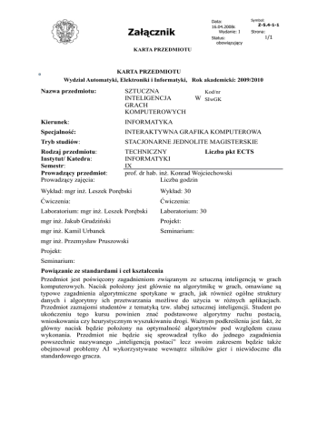 Data: 16.04.2008r. Wydanie: I Załącznik Symbol: Z-5.4-1-1 Strona: Status: obowiązujący 1/1 KARTA PRZEDMIOTU KARTA PRZEDMIOTU Wydział Automatyki, Elektroniki i Informatyki, Rok akademicki: 2009/2010 Nazwa przedmiotu: SZTUCZNA INTELIGENCJA GRACH KOMPUTEROWYCH Kod/nr W SIwGK Kierunek: INFORMATYKA Specjalność: INTERAKTYWNA GRAFIKA KOMPUTEROWA Tryb studiów: STACJONARNE JEDNOLITE MAGISTERSKIE Rodzaj przedmiotu: Instytut/ Katedra: Semestr: Prowadzący przedmiot: Prowadzący zajęcia: TECHNICZNY Liczba pkt ECTS INFORMATYKI IX prof. dr hab. inŜ. Konrad Wojciechowski Liczba godzin Wykład: mgr inŜ. Leszek Porębski Wykład: 30 Ćwiczenia: Ćwiczenia: Laboratorium: mgr inŜ. Leszek Porębski Laboratorium: 30 mgr inŜ. Jakub Grudziński Projekt: mgr inŜ. Kamil Urbanek Seminarium: mgr inŜ. Przemysław Pruszowski Projekt: Seminarium: Powiązanie ze standardami i cel kształcenia Przedmiot jest poświęcony zagadnieniom związanym ze sztuczną inteligencją w grach komputerowych. Nacisk połoŜony jest głównie na algorytmikę w grach, omawiane są typowe zagadnienia algorytmiczne spotykane w grach, jak równieŜ ogólne struktury danych i algorytmy ich przetwarzania moŜliwe do uŜycia w róŜnych aplikacjach. Przedmiot zaznajomi studentów z tematyką tzw. słabej sztucznej inteligencji. Student po ukończeniu tego kursu powinien znać podstawowe algorytmy ruchu postacią, wnioskowania czy heurystycznym wyszukiwaniu drogi. WaŜnym podkreślenia jest fakt, Ŝe główny nacisk będzie połoŜony na optymalność algorytmów pod względem czasu wykonania. Przedmiot nie będzie się sprowadzał tylko do jednego zagadnienia powszechnie nazywanego „inteligencją postaci” lecz swoim zakresem będzie takŜe obejmował problemy AI wykorzystywane wewnątrz silników gier i niewidoczne dla standardowego gracza. Załącznik Data: 16.04.2008r. Wydanie: I Status: obowiązujący Symbol: Z-5.4-1-1 Strona: 2/1 KARTA PRZEDMIOTU Przedmioty wprowadzające oraz wymagania wstępne Programowanie komputerów Algorytmy i struktury danych Programowanie gier komputerowych Treść wykładów: Algorytmika w grach komputerowych. Algorytmy sterowania grupą postaci, algorytmy zachowań stadnych. Wyszukiwanie i planowanie drogi. Siatki nawigacji. Skończone maszyny stanów. Mechanizmy oparte o stany w grach komputerowych. Kolejkowanie stanów. Sterowanie grą za pomocą zdarzeń, kolejka zdarzeń gry. Skryptowe wspomaganie sztucznej inteligencji. Języki skryptowe w grach. Kompilacja i interpretacja skryptów. Wsparcie składniowe dla typowych mechanizmów sztucznej inteligencji. Sztuczna inteligencja wirtualnych postaci. Algorytmy podejmowania decyzji. Sieci neuronowe w grach komputerowych. Mechanizmy wiedzy i wnioskowania. Zdobywanie wiedzy i nauka zachowań. Zaawansowane mechanizmy związane z wyszukiwaniem drogi. Analiza terenu w algorytmach poruszania. Dynamiczna aktualizacja wybranej ścieŜki. Wyszukiwanie miejsc spełniających określone kryteria. Treść/Tematy: Ćw./L./P./Sem. 1. A* 2. A* - wygładzanie drogi 3. Algorytmu ruchu grupowego (stadne) 4. Skończona maszyna stanów 5. NavMesh – automatyczna generacja 6. Języki skryptowe Metody dydaktyczne Wykład uzupełniany z rzadka slajdami. Materiały dodatkowe dla studentów do wszystkich wykładów zamieszczane na Platformie. Zadania na laboratorium ułoŜone w ten sposób, by studenci do wykonania mieli 5 małych, powiązanych ze sobą zadań. Obszerne instrukcje dostępne na Platformie, najpóźniej do dwóch dni przed zajęciami. Forma egzaminu/zaliczenia przedmiotu Średnia z ocen uzyskanych na laboratoriach. Egzamin opcjonalny Minimalne wymagania do egzaminu /zaliczenia Data: 16.04.2008r. Wydanie: I Załącznik Status: obowiązujący Symbol: Z-5.4-1-1 Strona: 3/1 KARTA PRZEDMIOTU Literatura (podstawowa i specjalistyczna) Literatura podstawowa: 1. „Perełki programowania gier” t.1-3, Helion 2. „Game Programming Gems” t.4-6, CHARLES RIVER MEDIA Literatura uzupełniająca: 1. Bolc L. „Metody przeszukiwania heurystycznego” t.1, PWN 1989 2. Goldberg D.E. „Algorytmy genetyczne i ich zastosowania”, WNT 1995 3. Ossowski S. „Sieci neuronowe w ujęciu algorytmicznym”, WNT 4. Cichosz P. „Systemy uczące się”, WNT 5. Aho A.V., Hopcroft J.E., Ullman J.D. „Algorytmy i struktury danych”, Helion 2003 6. Aho A.V., Sethi R., Ullman J.D. „Kompilatory. Reguły, metody i narzędzia” Zatwierdzono: ……………………………. ………………………………………………… (data i podpis prowadzącego) (data i podpis Dyrektora Instytutu/Kierownika Katedry)