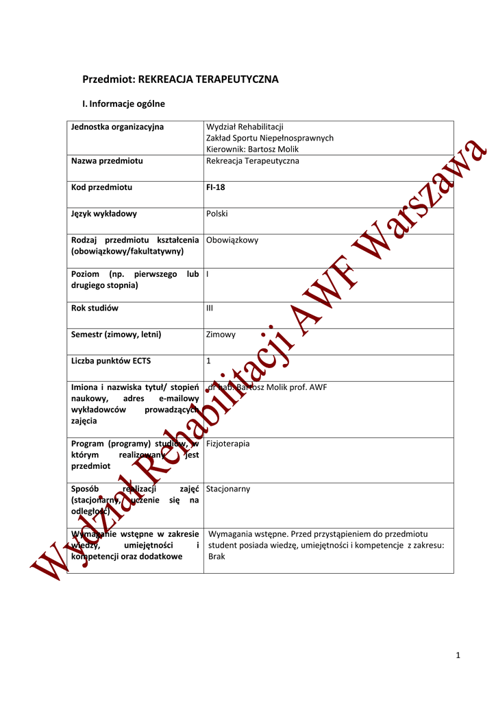 Przedmiot: REKREACJA TERAPEUTYCZNA I. Informacje ogólne Jednostka organizacyjna Nazwa przedmiotu Wydział Rehabilitacji Zakład Sportu Niepełnosprawnych Kierownik: Bartosz Molik Rekreacja Terapeutyczna Kod przedmiotu FI-18 Język wykładowy Polski Rodzaj przedmiotu kształcenia Obowiązkowy (obowiązkowy/fakultatywny) Poziom (np. pierwszego drugiego stopnia) lub I Rok studiów III Semestr (zimowy, letni) Zimowy Liczba punktów ECTS 1 Imiona i nazwiska tytuł/ stopień dr hab. Bartosz Molik prof. AWF naukowy, adres e-mailowy wykładowców prowadzących zajęcia Program (programy) studiów, w Fizjoterapia którym realizowany jest przedmiot Sposób realizacji (stacjonarny, uczenie odległość) się zajęć Stacjonarny na Wymaganie wstępne w zakresie Wymagania wstępne. Przed przystąpieniem do przedmiotu wiedzy, umiejętności i student posiada wiedzę, umiejętności i kompetencje z zakresu: kompetencji oraz dodatkowe Brak 1 II. Informacje szczegółowe Cele przedmiotu C1 C2 C3 Zapoznanie studenta z podstawowymi pojęciami z zakresu rekreacji osób niepełnosprawnych oraz rekreacji terapeutycznej Zapoznanie studenta ze specyfiką prowadzenia zajęć rekreacji rekreacyjnej w relacji do rodzaju niepełnosprawności klientów Zapoznanie studenta z podstawową wiedzą z zakresu teorii i praktyki rekreacji terapeutycznej Efekty kształcenia w zakresie wiedzy, umiejętności i kompetencji społecznych dla przedmiotu Efekt kształcenia Treść efektu kształcenia dla przedmiotu Odniesienie Odniesienie kierunkowy do celów do efektów obszarowych Wiedza K_W13 ma wiedzę z zakresu podstaw edukacji zdrowotnej, promocji zdrowia oraz profilaktyki z uwzględnieniem zjawiska niepełnosprawno ści K_W14 ma wiedzę w zakresie doboru różnych form aktywności dla osób ze specjalnymi potrzebami K_W21 zna terminologię i ma uporządkowaną wiedzę dotyczące niepełnosprawno ści, zna podstawowe pojęcia dotyczące całokształtu rehabilitacji medycznej i fizjoterapii oraz kultury fizycznej 1. Ma wiedzę na temat podstaw edukacji zdrowotnej, profilaktyki zdrowia prowadzonej w ramach rekreacji terapeutycznej. 2. Zna podstawy profilaktyki niepełnosprawności oraz zasad edukacji klientów (pacjentów) z różnymi rodzajami niepełnosprawności prowadzonymi w ramach rekreacji terapeutycznej. C1, C2, C3 M1A_W06, M1A_W10 1. Zna różne formy aktywności fizycznej przeznaczone dla osób ze specjalnymi potrzebami. 2. Zna wskazania i przeciwwskazania dotyczące zastosowania wybranych form aktywności fizycznej u osób z różnymi rodzajami niepełnosprawności. C2, C3 M1A_W05, M1A_W06 1. Zna pojęcia rekreacji i turystyki oraz rekreacji i turystyki osób niepełnosprawnych. 2. Zna pojęcie rekreacji terapeutycznej i jej związek z wychowaniem fizycznym, rekreacją oraz rehabilitacją. C1, C3 M1A_W10 K_U16 1. Potrafi konstruować ćwiczenia i C2, C3 M1A_U10 Umiejętności 2 potrafi planować i kontrolować oraz prowadzić proces nauczania i uczenia się ruchów z uwzględnieniem aspektów rozwojowych i metodyki nauczania ruchu z wykorzystaniem fachowego nazewnictwa ćwiczeń dla osób z różnymi możliwościami funkcjonalnymi wykorzystywać fachowe nazewnictwo ćwiczeń wykorzystywanych w rekreacji terapeutycznej z klientami (pacjentami) ze specjalnymi potrzebami. Kompetencje społeczne K_K12 1. Potrafi propagować i aktywnie kreować potrafi określić zdrowy styl życia i promocję zdrowia. poziom sprawności niezbędny do wykonywania zawodu fizjoterapeuty oraz aktywnie uczestniczyć w różnych formach działań z zakresu aktywności fizycznej i promocji zdrowia C1, C2, C3 M1A_K09 Treści programowe Treści programowe Tytuł wykładu Odniesienie do efektów kształcenia kierunkowych/ przedmiotowych Odniesienie do celów przedmiotu WYKŁADY TP1 TP2 TP3 Podstawowe pojęcia z zakresu teorii i metodyki rekreacji. Funkcje i cele rekreacji terapeutycznej. Czas wolny i rekreacja osób niepełnosprawnych. Formy spędzania czasu wolnego przez osoby niepełnosprawne oraz ich wartość rekreacyjna i autokreacyjna. Biologiczne podstawy rekreacji ruchowej. Społeczne podstawy uprawiania rekreacji ruchowej. K_W13/1,2 K_W21/1,2 K_W13/1,2 K_W21/1,2 K_W13/1,2 C1, C2, C3 C1, C2, C3 C1, C2, C3 3 K_W21/1,2 TP4 Proces rekreacji terapeutycznej. TP5 Rekreacja terapeutyczna w wybranych rodzajach schorzeń: dysfunkcje narządu ruchu. TP6 Rekreacja terapeutyczna w wybranych rodzajach schorzeń: uszkodzenia rdzenia kręgowego TP7 Rekreacja terapeutyczna w wybranych rodzajach schorzeń: zaburzenia neurologiczne TP8 Rekreacja terapeutyczna w wybranych rodzajach schorzeń: niepełnosprawność intelektualna. TP9 Rekreacja terapeutyczna w wybranych rodzajach schorzeń: uszkodzenia narządu wzroku TP10 Rekreacja terapeutyczna w wybranych rodzajach schorzeń: uszkodzenia narządu słuchu TP11 Rekreacja terapeutyczna w wybranych rodzajach schorzeń: autyzm i choroby psychiczne TP12 Rekreacja terapeutyczna w wybranych rodzajach schorzeń: zaburzenia funkcjonowania układu krążenia i oddechowego. TP13 Rekreacja terapeutyczna z osobami starszymi. TP14 Rekreacja terapeutyczna w chorobach nowotworowych i cywilizacyjnych. TP15 Najnowsze tendencje związane z rozwojem rekreacji terapeutycznej. Ocena znajomości podstaw rekreacji terapeutycznej. K_W13/1,2 K_W21/1,2 K_W14/1,2 K_W21/1,2 K_U16/1 K_K12/1 K_W14/1,2 K_W21/1,2 K_U16/1 K_W14/1,2 K_W21/1,2 K_U16/1 K_K12/1 K_W14/1,2 K_W21/1,2 K_U16/1 K_K12/1 K_W14/1,2 K_W21/1,2 K_U16/1 K_K12/1 K_W14/1,2 K_W21/1,2 K_U16/1 K_K12/1 K_W14/1,2 K_W21/1,2 K_U16/1 K_K12/1 K_W14/1,2 K_W21/1,2 K_U16/1 K_K12/1 K_W14/1,2 K_W21/1,2 K_U16/1 K_K12/1 K_W14/1,2 K_W21/1,2 K_U16/1 K_K12/1 K_W13/1,2 K_W14/1,2 K_W21/1,2 K_U16/1 K_K12/1 C1, C2, C3 C1, C2, C3 C1, C2, C3 C1, C2, C3 C1, C2, C3 C1, C2, C3 C1, C2, C3 C1, C2, C3 C1, C2, C3 C1, C2, C3 C1, C2, C3 C1, C2, C3 4 Planowane formy/działania/metody dydaktyczne Treści programowe TP1 - TP15, Metoda dydaktyczna wykład informacyjny, pokaz (film), dyskusja dydaktyczna Odniesien