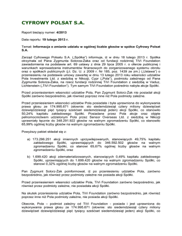 CYFROWY POLSAT S.A. Raport bieżący numer: 4/2013 Data raportu: 19 lutego 2013 r. Temat: Informacja o zmianie udziału w ogólnej liczbie głosów w spółce Cyfrowy Polsat S.A. Zarząd Cyfrowego Polsatu S.A. („Spółka”) informuje, iż w dniu 18 lutego 2013 r. Spółka otrzymała od Pana Zygmunta Solorza-Żaka oraz od fundacji rodzinnej TiVi Foundation zawiadomienia na podstawie art. 69 ustawy z dnia 29 lipca 2005 r. o ofercie publicznej i warunkach wprowadzania instrumentów finansowych do zorganizowanego systemu obrotu oraz o spółkach publicznych (j.t. Dz. U. z 2009 r. Nr 185, poz. 1439 ze zm.) („Ustawa”) o przeniesieniu na podstawie umowy zawartej w dniu 13 lutego 2013 roku własności udziałów Pola Investments Ltd. z siedzibą w Nikozji, Cypr („Pola”), podmiotu zależnego od Pana Zygmunta Solorza-Żaka, na rzecz fundacji rodzinnej TiVi Foundation z siedzibą w Vaduz, Lichtenstein („TiVi Foundation”). Tym samym TiVi Foundation pośrednio nabyła akcje Spółki. Przed przeniesieniem własności udziałów Pola, Pan Zygmunt Solorz-Żak nie posiadał akcji Spółki zarówno bezpośrednio, jak również poprzez inne niż Pola podmioty zależne. Przed przeniesieniem własności udziałów Pola posiadała i była uprawniona do wykonywania prawa głosu ze 174.995.671 (słownie: sto siedemdziesiąt cztery miliony dziewięćset dziewięćdziesiąt pięć tysięcy sześćset siedemdziesiąt jeden) akcji Spółki, co stanowiło 50,24% kapitału zakładowego Spółki. Posiadane przez Pola akcje oraz objęte pełnomocnictwem udzielonym Pola przez Sensor Overseas Ltd. z siedzibą w Nikozji uprawniały łącznie do 348.291.922 głosów na walnym zgromadzeniu Spółki, co stanowiło 65,99% ogólnej liczby głosów na walnym zgromadzeniu Spółki. Powyższy pakiet składał się z: a) 173.296.251 akcji imiennych uprzywilejowanych, stanowiących 49,75% kapitału zakładowego Spółki, uprawniających do 346.592.502 głosów na walnym zgromadzeniu Spółki, co stanowi 65,67% ogólnej liczby głosów na walnym zgromadzeniu Spółki, oraz b) 1.699.420 akcji zdematerializowanych, stanowiących 0,49% kapitału zakładowego Spółki, uprawniających do 1.699.420 głosów na walnym zgromadzeniu Spółki, co stanowi 0,32% ogólnej liczby głosów na walnym zgromadzeniu Spółki. Pan Zygmunt Solorz-Żak poinformował, iż po przeniesieniu udziałów Pola, zarówno bezpośrednio, jak również przez podmioty zależne nie posiada akcji Spółki. Przed przeniesieniem własności udziałów Pola, TiVi Foundation zarówno bezpośrednio, jak również przez podmioty zależne, nie posiadała akcji Spółki. Na skutek przeniesienia udziałów Pola, TiVi Foundation zarówno bezpośrednio, jak również poprzez inne niż Pola podmioty zależne, nie posiada akcji Spółki. Obecnie, Pola – podmiot zależny od TiVi Foundation - posiada i jest uprawniona do wykonywania prawa głosu ze 174.995.671 (słownie: sto siedemdziesiąt cztery miliony dziewięćset dziewięćdziesiąt pięć tysięcy sześćset siedemdziesiąt jeden) akcji Spółki, co stanowił 50,24% kapitału zakładowego Spółki. Posiadane przez Pola akcje oraz objęte pełnomocnictwem udzielonym Pola przez Sensor Overseas Ltd. z siedzibą w Nikozji uprawniają łącznie do 348.291.922 głosów na walnym zgromadzeniu Spółki, co stanowi 65,99% ogólnej liczby głosów na walnym zgromadzeniu Spółki. Powyższy pakiet składa się z: a) 173.296.251 akcji imiennych uprzywilejowanych, stanowiących 49,75% kapitału zakładowego Spółki, uprawniających do 346.592.502 głosów na walnym zgromadzeniu Spółki, co stanowi 65,67% ogólnej liczby głosów na walnym zgromadzeniu Spółki, oraz b) 1.699.420 akcji zdematerializowanych, stanowiących 0,49% kapitału zakładowego Spółki, uprawniających do 1.699.420 głosów na walnym zgromadzeniu Spółki, co stanowi 0,32% ogólnej liczby głosów na walnym zgromadzeniu Spółki. TiVi Foundation poinformowała, iż w okresie 12 miesięcy od złożenia zawiadomienia nie zamierza dalej zwiększać udziału w ogólnej liczbie głosów na walnym zgromadzeniu Spółki, z wyjątkiem zwiększenia, które wynika z treści art. 73 ust. 2 pkt 1 Ustawy. Podstawa prawna: § 70 pkt 1 Ustawy z dnia 29 lipca 2005 r. o ofercie publicznej i warunkach wprowadzania instrumentów finansowych do zorganizowanego systemu obrotu o spółkach Podpisano przez: /p/ Dominik Libicki Dominik Libicki, Prezes Zarządu