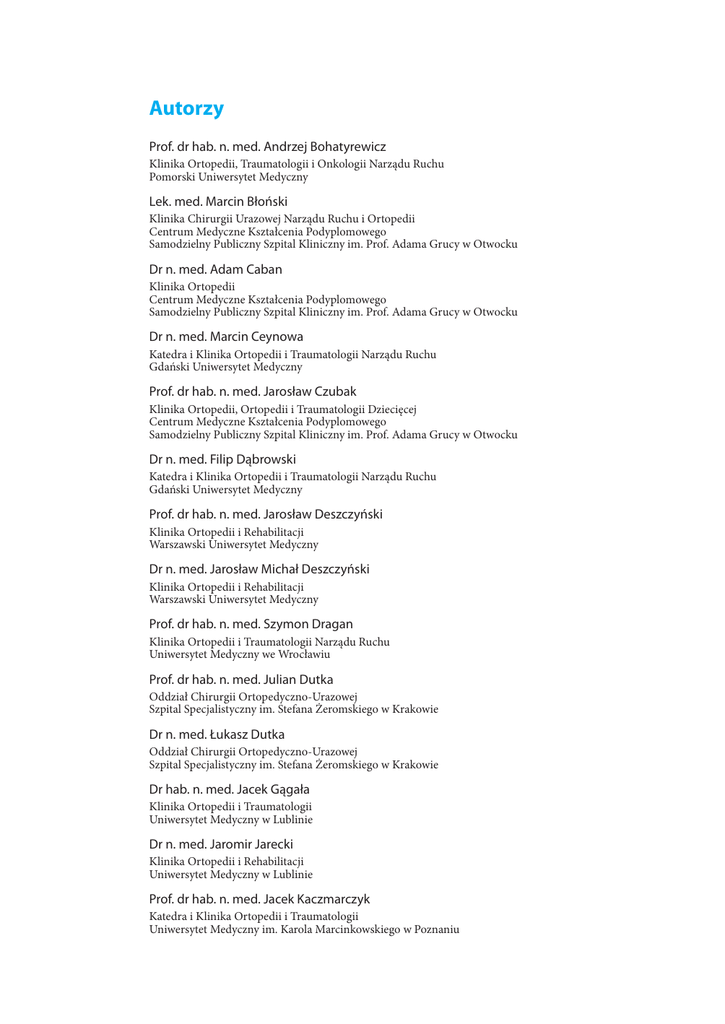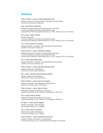 6 historia ortopedii Autorzy Prof. dr hab. n. med. Andrzej Bohatyrewicz Klinika Ortopedii, Traumatologii i Onkologii Narządu Ruchu Pomorski Uniwersytet Medyczny Lek. med. Marcin Błoński Klinika Chirurgii Urazowej Narządu Ruchu i Ortopedii Centrum Medyczne Kształcenia Podyplomowego Samodzielny Publiczny Szpital Kliniczny im. Prof. Adama Grucy w Otwocku Dr n. med. Adam Caban Klinika Ortopedii Centrum Medyczne Kształcenia Podyplomowego Samodzielny Publiczny Szpital Kliniczny im. Prof. Adama Grucy w Otwocku Dr n. med. Marcin Ceynowa Katedra i Klinika Ortopedii i Traumatologii Narządu Ruchu Gdański Uniwersytet Medyczny Prof. dr hab. n. med. Jarosław Czubak Klinika Ortopedii, Ortopedii i Traumatologii Dziecięcej Centrum Medyczne Kształcenia Podyplomowego Samodzielny Publiczny Szpital Kliniczny im. Prof. Adama Grucy w Otwocku Dr n. med. Filip Dąbrowski Katedra i Klinika Ortopedii i Traumatologii Narządu Ruchu Gdański Uniwersytet Medyczny Prof. dr hab. n. med. Jarosław Deszczyński Klinika Ortopedii i Rehabilitacji Warszawski Uniwersytet Medyczny Dr n. med. Jarosław Michał Deszczyński Klinika Ortopedii i Rehabilitacji Warszawski Uniwersytet Medyczny Prof. dr hab. n. med. Szymon Dragan Klinika Ortopedii i Traumatologii Narządu Ruchu Uniwersytet Medyczny we Wrocławiu Prof. dr hab. n. med. Julian Dutka Oddział Chirurgii Ortopedyczno-Urazowej Szpital Specjalistyczny im. Stefana Żeromskiego w Krakowie Dr n. med. Łukasz Dutka Oddział Chirurgii Ortopedyczno-Urazowej Szpital Specjalistyczny im. Stefana Żeromskiego w Krakowie Dr hab. n. med. Jacek Gągała Klinika Ortopedii i Traumatologii Uniwersytet Medyczny w Lublinie Dr n. med. Jaromir Jarecki Klinika Ortopedii i Rehabilitacji Uniwersytet Medyczny w Lublinie Prof. dr hab. n. med. Jacek Kaczmarczyk Katedra i Klinika Ortopedii i Traumatologii Uniwersytet Medyczny im. Karola Marcinkowskiego w Poznaniu Ortopedia i Traumatologia historia ortopedii Prof. dr hab. n. med. Bogdan Koczy Oddział Urazowo-Ortopedyczny Męski Samodzielny Publiczny Wojewódzki Szpital Chirurgii Urazowej im. dr Janusza Daaba w Piekarach Śląskich Dr n. med. Krzysztof Kolarz Katedra i Klinika Ortopedii i Traumatologii Narządu Ruchu Gdański Uniwersytet Medyczny Prof. dr hab. n. med. Maciej Kołban Klinika Ortopedii i Traumatologii Dziecięcej Pomorski Uniwersytet Medyczny Dr n. med. Łukasz Kołodziej Klinika Ortopedii, Traumatologii i Onkologii Narządu Ruchu Pomorski Uniwersytet Medyczny Dr n. med. Bartłomiej Kordasiewicz Klinika Chirurgii Urazowej Narządu Ruchu i Ortopedii Centrum Medyczne Kształcenia Podyplomowego Samodzielny Publiczny Szpital Kliniczny im. Prof. Adama Grucy w Otwocku Dr n. med. Daniel Kotrych Klinika Ortopedii, Traumatologii i Onkologii Narządu Ruchu Pomorski Uniwersytet Medyczny Dr hab. n. med. Łukasz Kubaszewski Klinika Ortopedii i Traumatologii Zakład Spondyloortopedii i Biomechaniki Kręgosłupa Uniwersytet Medyczny im. Karola Marcinkowskiego w Poznaniu Dr hab. n. med. Przemysław Lubiatowski Klinika Traumatologii, Ortopedii i Chirurgii Ręki Uniwersytet Medyczny im. Karola Marcinkowskiego w Poznaniu Dr n. med. Agnieszka Łabuć Katedra i Klinika Ortopedii i Traumatologii Narządu Ruchu Gdański Uniwersytet Medyczny Lek. med. Maciej Makowski Klinika Chirurgii Urazowej Narządu Ruchu i Ortopedii Centrum Medyczne Kształcenia Podyplomowego Samodzielny Publiczny Szpital Kliniczny im. Prof. Adama Grucy w Otwocku Prof. dr hab. n. med. Paweł Małdyk Klinika Ortopedii i Traumatologii Narządu Ruchu Warszawski Uniwersytet Medyczny Prof. dr hab. n. med. Wojciech Marczyński Klinika Ortopedii Centrum Medyczne Kształcenia Podyplomowego Samodzielny Publiczny Szpital Kliniczny im. Prof. Adama Grucy w Otwocku Dr hab. n. med. Łukasz Matuszewski Klinika Ortopedii i Rehabilitacji Dziecięcej Uniwersytet Medyczny w Lublinie Prof. dr hab. n. med. Tomasz Mazurek Katedra i Klinika Ortopedii i Traumatologii Narządu Ruchu Gdański Uniwersytet Medyczny Ortopedia i Traumatologia 7 8 historia ortopedii Prof. dr hab. n. med. Tomasz Mazurkiewicz Klinika Ortopedii i Traumatologii Uniwersytet Medyczny w Lublinie Lek. med. Dariusz Michalik Klinika Ortopedii i Traumatologii Zakład Spondyloortopedii i Biomechaniki Kręgosłupa Uniwersytet Medyczny im. Karola Marcinkowskiego w Poznaniu Dr n. med. Paweł Jerzy Michalski Oddziału Chirurgii Kręgosłupa i Ortopedii w Instytucie Matki i Dziecka w Warszawie Lek. med. Piotr Michniowski Oddział Urazowo-Ortopedyczny w Kwidzynie Dr n. med. Michał Mielnik Oddział Urazowo-Ortopedyczny z Pododdziałem Artroskopii i Chirurgii Kolana Samodzielny Publiczny Wojewódzki Szpital Chirurgii Urazowej im. dr Janusza Daaba w Piekarach Śląskich Dr n. med. Łukasz Niedźwiedzki Oddział Ortopedii i Traumatologii Narządu Ruchu Szpital Specjalistyczny im. Ludwika Rydygiera w Krakowie Prof. dr hab. n. med. Tadeusz Niedźwiedzki Oddział Ortopedii i Traumatologii Narządu Ruchu Szpital Specjalistyczny im. Ludwika Rydygiera w Krakowie Prof. dr hab. n. med. Andrzej Nowakowski Klinika Chirurgii Kręgosłupa, Ortopedii Onkologicznej i Traumatologii Zakład Spondyloortopedii i Biomechaniki Kręgosłupa Uniwersytet Medyczny im. Karola Marcinkowskiego w Poznaniu Dr hab. n. med. Rafał Pankowski Katedra i Klinika Ortopedii i Traumatologii Narządu Ruchu Gdański Uniwersytet Medyczny Dr n. med. Marek Paściak Oddział Urazów i Schorzeń Kręgosłupa i Paraplegii Urazowej Samodzielny Publiczny Wojewódzki Szpital Chirurgii Urazowej im. dr Janusza Daaba w Piekarach Śląskich Dr n. med. Szymon Pietrzak Klinika Ortopedii, Ortopedii i Traumatologii Dziecięcej Centrum Medyczne Kształcenia Podyplomowego Samodzielny Publiczny Szpital Kliniczny im. Prof. Adama Grucy w Otwocku Dr n. med. Maciej Piotrowski Katedra i Klinika Ortopedii i Traumatologii Narządu Ruchu Gdański Uniwersytet Medyczny Lek. med. Klaudiusz Pobłocki Katedra i Klinika Ortopedii i Traumatologii Narządu Ruchu Gdański Uniwersytet Medyczny Prof. dr hab. n. med. Stanisł