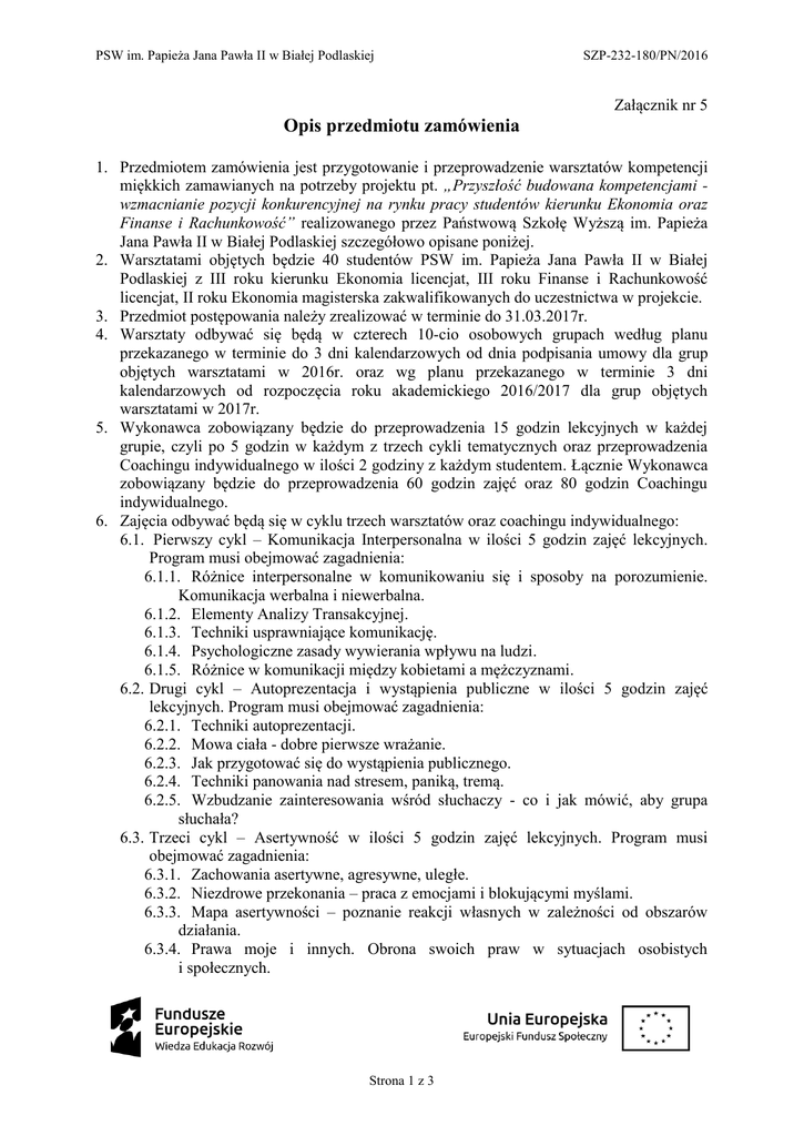 PSW im. Papieża Jana Pawła II w Białej Podlaskiej SZP-232-180/PN/2016 Załącznik nr 5 Opis przedmiotu zamówienia 1. Przedmiotem zamówienia jest przygotowanie i przeprowadzenie warsztatów kompetencji miękkich zamawianych na potrzeby projektu pt. „Przyszłość budowana kompetencjami wzmacnianie pozycji konkurencyjnej na rynku pracy studentów kierunku Ekonomia oraz Finanse i Rachunkowość” realizowanego przez Państwową Szkołę Wyższą im. Papieża Jana Pawła II w Białej Podlaskiej szczegółowo opisane poniżej. 2. Warsztatami objętych będzie 40 studentów PSW im. Papieża Jana Pawła II w Białej Podlaskiej z III roku kierunku Ekonomia licencjat, III roku Finanse i Rachunkowość licencjat, II roku Ekonomia magisterska zakwalifikowanych do uczestnictwa w projekcie. 3. Przedmiot postępowania należy zrealizować w terminie do 31.03.2017r. 4. Warsztaty odbywać się będą w czterech 10-cio osobowych grupach według planu przekazanego w terminie do 3 dni kalendarzowych od dnia podpisania umowy dla grup objętych warsztatami w 2016r. oraz wg planu przekazanego w terminie 3 dni kalendarzowych od rozpoczęcia roku akademickiego 2016/2017 dla grup objętych warsztatami w 2017r. 5. Wykonawca zobowiązany będzie do przeprowadzenia 15 godzin lekcyjnych w każdej grupie, czyli po 5 godzin w każdym z trzech cykli tematycznych oraz przeprowadzenia Coachingu indywidualnego w ilości 2 godziny z każdym studentem. Łącznie Wykonawca zobowiązany będzie do przeprowadzenia 60 godzin zajęć oraz 80 godzin Coachingu indywidualnego. 6. Zajęcia odbywać będą się w cyklu trzech warsztatów oraz coachingu indywidualnego: 6.1. Pierwszy cykl – Komunikacja Interpersonalna w ilości 5 godzin zajęć lekcyjnych. Program musi obejmować zagadnienia: 6.1.1. Różnice interpersonalne w komunikowaniu się i sposoby na porozumienie. Komunikacja werbalna i niewerbalna. 6.1.2. Elementy Analizy Transakcyjnej. 6.1.3. Techniki usprawniające komunikację. 6.1.4. Psychologiczne zasady wywierania wpływu na ludzi. 6.1.5. Różnice w komunikacji między kobietami a mężczyznami. 6.2. Drugi cykl – Autoprezentacja i wystąpienia publiczne w ilości 5 godzin zajęć lekcyjnych. Program musi obejmować zagadnienia: 6.2.1. Techniki autoprezentacji. 6.2.2. Mowa ciała - dobre pierwsze wrażanie. 6.2.3. Jak przygotować się do wystąpienia publicznego. 6.2.4. Techniki panowania nad stresem, paniką, tremą. 6.2.5. Wzbudzanie zainteresowania wśród słuchaczy - co i jak mówić, aby grupa słuchała? 6.3. Trzeci cykl – Asertywność w ilości 5 godzin zajęć lekcyjnych. Program musi obejmować zagadnienia: 6.3.1. Zachowania asertywne, agresywne, uległe. 6.3.2. Niezdrowe przekonania – praca z emocjami i blokującymi myślami. 6.3.3. Mapa asertywności – poznanie reakcji własnych w zależności od obszarów działania. 6.3.4. Prawa moje i innych. Obrona swoich praw w sytuacjach osobistych i społecznych. Strona 1 z 3 PSW im. Papieża Jana Pawła II w Białej Podlaskiej SZP-232-180/PN/2016 6.3.5. Asertywne techniki wyrażania oczekiwań. Model wyrażania uczuć negatywnych. 6.4. Coaching indywidualny. 6.4.1. Każda osoba/student będzie uczestniczyła w 2 godzinach coachingu indywidualnego. 6.4.2. Zakres coachingu indywidualnego: 6.4.2.1. Omówienie pracy grupowej na warsztatach 6.4.2.2. Analiza potencjału osobowościowego, wskazanie obszarów potencjału zawodowego i obszarów wymagających pracy 6.4.2.3. Opracowanie indywidulanego planu działania 6.4.2.4. Stworzenie profesjonalnego portfolio zawodowego 6.4.3. Poszczególne terminy Coachingu indywidualnego zostaną ustalone po indywidualnych konsultacjach ze studentami w terminie do 10 dni kalendarzowych od dnia podpisania umowy. II edycja wg planu przekazanego w terminie 5 dni kalendarzowych od rozpoczęcia roku akademickiego 2016/2017. 7. Warsztaty i coaching indywidualny odbywać się będą w pomieszczeniach zlokalizowanych w obiektach Zamawiającego w Białej Podlaskiej. 8. Zajęcia odbywać się będą we wszystkie dni tygodnia z wyłączeniem świąt z uwzględnieniem planu zajęć studentów. 9. Wykonawca zobowiązany jest zapewnić każdemu uczestnikowi na własność niezbędne materiały dydaktyczne potrzebne do przyswajania wiedzy teoretycznej, tzn. materiały szkoleniowe, segregator, kartki do segregatora, długopis. 10. Wykonawca zobowiązany jest wydać każdemu studentowi na zakończenie zaświadczenie potwierdzające nabyte kompetencje. 11. Zamawiający zobowiązuje się do nieodpłatnego udostępniania środków dydaktycznych / materialnych będących w jego dyspozycji koniecznych do wykonania przedmiotu zamówienia (sale wykładowe, laboratoria komputerowe, urządzenia audiowizualne, podręczniki itp.). W sytuacji gdy do prowadzenia szkolenia wymagane będą pomoce naukowe lub sprzęt nie będący w dyspozycji Zamawiającego lub będą wykorzystywane do innych celów, Wykonawca na własny koszt i własnym staraniem zapewni na czas realizacji przedmiotu umowy wszystkie niezbędne urządzenia i pomoce i poniesie związane z tym koszty. 12. W ramach realizacji przedmiotu zamówienia Wykonawca będzie zobowiązany do: 12.1. Udziału w spotkaniach koordynujących, związanych z realizacją przedmiotu zamówienia odbywającego się w siedzibie Zamawiającego, termin spotkań uzależniony jest od bieżących potrzeb wynikających z prowadzonych zajęć i o jego wyznaczaniu Wykonawca będzie informowany na minimum 2 dni przed spotkaniem. 12.2. Informowania Zamawiającego o przebiegu realizacji zajęć i ewentualnych nieprawidłowościach związanych z jego realizacją. 12.3. Bieżącej współpracy z Zamawiającym w zakresie związanym z realizacją zajęć. 12.4. Nadzoru nad przestrzeganiem wytycznych dotyczących promocji projektu w zakresie prowadzonych zajęć (oznakowanie materiałów wykorzystywanych podczas zajęć, prezentacji itp.). 13. Wykonawca zobowiązany jest do sporządzania i prowadzenia dokumentacji wykonanych 