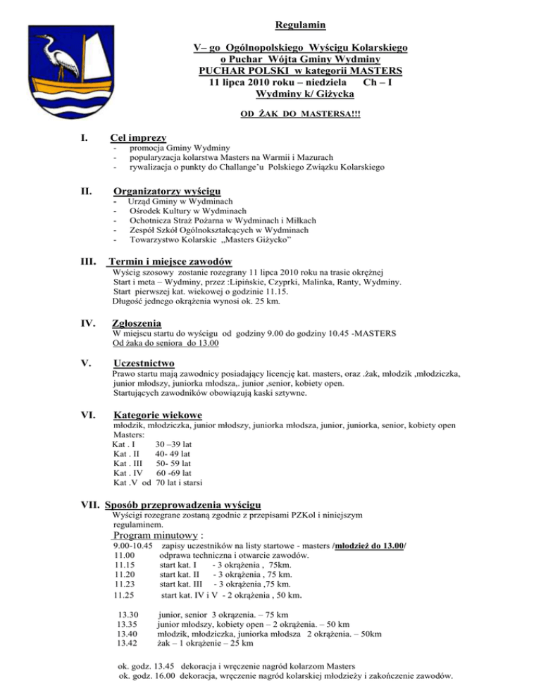 Regulamin V– go Ogólnopolskiego Wyścigu Kolarskiego o Puchar Wójta Gminy Wydminy PUCHAR POLSKI w kategorii MASTERS 11 lipca 2010 roku – niedziela Ch – I Wydminy k/ Giżycka OD ŻAK DO MASTERSA!!! I. Cel imprezy - II. Organizatorzy wyścigu - III. promocja Gminy Wydminy popularyzacja kolarstwa Masters na Warmii i Mazurach rywalizacja o punkty do Challange’u Polskiego Związku Kolarskiego Urząd Gminy w Wydminach Ośrodek Kultury w Wydminach Ochotnicza Straż Pożarna w Wydminach i Miłkach Zespół Szkół Ogólnokształcących w Wydminach Towarzystwo Kolarskie „Masters Giżycko” Termin i miejsce zawodów Wyścig szosowy zostanie rozegrany 11 lipca 2010 roku na trasie okrężnej Start i meta – Wydminy, przez :Lipińskie, Czyprki, Malinka, Ranty, Wydminy. Start pierwszej kat. wiekowej o godzinie 11.15. Długość jednego okrążenia wynosi ok. 25 km. IV. Zgłoszenia W miejscu startu do wyścigu od godziny 9.00 do godziny 10.45 -MASTERS Od żaka do seniora do 13.00 V. Uczestnictwo Prawo startu mają zawodnicy posiadający licencję kat. masters, oraz .żak, młodzik ,młodziczka, junior młodszy, juniorka młodsza,. junior ,senior, kobiety open. Startujących zawodników obowiązują kaski sztywne. VI. Kategorie wiekowe młodzik, młodziczka, junior młodszy, juniorka młodsza, junior, juniorka, senior, kobiety open Masters: Kat . I 30 –39 lat Kat . II 40- 49 lat Kat . III 50- 59 lat Kat . IV 60 -69 lat Kat .V od 70 lat i starsi VII. Sposób przeprowadzenia wyścigu Wyścigi rozegrane zostaną zgodnie z przepisami PZKol i niniejszym regulaminem. Program minutowy : 9.00-10.45 11.00 11.15 11.20 11.23 11.25 13.30 13.35 13.40 13.42 zapisy uczestników na listy startowe - masters /młodzież do 13.00/ odprawa techniczna i otwarcie zawodów. start kat. I - 3 okrążenia , 75km. start kat. II - 3 okrążenia , 75 km. start kat. III - 3 okrążenia ,75 km. start kat. IV i V - 2 okrążenia , 50 km. junior, senior 3 okrązenia. – 75 km junior młodszy, kobiety open – 2 okrążenia. – 50 km młodzik, młodziczka, juniorka młodsza 2 okrążenia. – 50km żak – 1 okrążenie – 25 km ok. godz. 13.45 dekoracja i wręczenie nagród kolarzom Masters ok. godz. 16.00 dekoracja, wręczenie nagród kolarskiej młodzieży i zakończenie zawodów. VIII . Zasady finansowania Koszty organizacyjne wyścigu pokrywają organizatorzy. Koszty uczestnictwa : dojazd, wyżywienie , zakwaterowanie i opłata startowego w wysokości 30 zł. dla kat. I – III i 15 zł. dla kat. IVi V, oraz pozostali wg stawek PZKol. pokrywają uczestnicy. IX. Nagrody I -III miejsca w każdej kategorii wiekowej : puchar , dyplom, IV – VI – medal i dyplom X. Postanowienia końcowe . Wyścigi klasyfikowane są do Challange’u PZKol - zgodnie z kalendarzem imprez kolarzy Masters na rok 2010. Wyścigi odbędą się na trasie okrężnej przy „częściowo ograniczonym ruchu drogowym” dla zasadniczej grupy . Pozostali kolarze zobowiązani są do przestrzegania przepisów ruchu drogowego Obowiązuje uczestników ruch tylko i wyłącznie prawostronny - . Każdy zawodnik ubezpiecza się od następstw nieszczęśliwych wypadków we własnym zakresie / OC i NW/ i uczestniczy w wyścigu na własną odpowiedzialność. Organizator nie odpowiada za szkody wyrządzone przez lub na rzecz uczestników wyścigów i osób towarzyszących . Komisję Sędziowską zaprasza organizator, wytypowaną przez Warmińsko-Mazurski Związek Kolarski w Olsztynie . Organizator zastrzega sobie prawo do interpretacji niniejszego regulaminu w porozumieniu Sędzią Głównym wyścigu . Odpowiedzialnym za przebieg i bezpieczeństwo imprezy z ramienia organizatora jest Jerzy Gawarecki – Prezes Towarzystwa Kolarskiego „ Masters Giżycko” tel. 0 – 502 84 10 33, e – mail : masters7@ wp.pl Adres szpitala : Samodzielny Publiczny Zakład Opieki Zdrowotnej w Giżycku ul.Warszawska 41 tel. centrali : 0 – 87 428 52 71 START I META Bazy noclegowa dostępna na terenie Gminy Wydminy Nazwa obiektu Telefon, osoba do kontaktu Liczba miejsc noclegowych Usługi dodatkowe Pensjonat „Skorpion” 087 4210 518 087 4210 296 Antoni Garbowski 19 miejsc Barek, kawiarnia Bilard, grill Pensjonat „Mazur” 0 512 144 295 Aneta Chruściel 20 miejsc restauracja dyskoteka, bilard Dom wczasowy „Pod bocianem” 0 510 651 820 Tadeusz Ostrowski 60 miejsc w budynku 20 miejsc w domkach campingowych możliwość wyżywienia Rodzaj, atrakcje, charakter Pensjonat Rybak Pensjonat nad jeziorem Pecjonat Victoria Pensjonat z restauracją, nad jeziorem, domki letniskowe Pensjonat ze stołówką, nad jeziorem Pensjonat „Szostak” Pensjonat „Sielanka” Pensjonat „Placówka” Pensjonat ze stołówką, nad jeziorem, przy wyciągu narciarskim Pensjonat Położenie Kontakt tel. (87) 421 02 95 www.pensjonat-rybak.com Chmielewska Alicja Krzyczewska Janina tel. 502 515 410, 513 078 778 tel. 87 42 12 162 www.gosciniecszostak.republika.pl Peter Andrzej tel. 87 42 10 615 Świątkowski Janusz tel. (87) 421 09 09 www.placowka.com.pl Rudnicka Agata Wydminy, ul. Suwalska 11a Wydminy ul. Grunwaldzka Czarnówka 6a 9km do Wydmin Talki Okrągłe 10 15km do Wydmin Wężowka 20 2km do Wydmin Majatek Kryjany Pensjonat ze stołówką, konie tel. 87 42 10 350 Piołunowicz Janina Wężówka 18 2km do Wydmin Domki letniskowe Z liną brzegową jeziora tel. 698 123 705 Zabielska Waleria Wydminy, ul. Suwalska Domki 300m do jeziora Wydminy, ul. Kajki 26 Domki letniskowe 300m do jeziora Domki całoroczne Domki letniskowe Domki przy polu golfowym agroturystyka tel. 888 013 581 www.umarcina.wydminy.com Marcin Polak tel. (87) 42 10 210 www.atium.of.pl Teresa Luto tel. 87 420 92 41 www.talkigolf.pl tel. 87 42 10 216 Stasiakiewicz Helena Pokoje gościnne agroturystyka tel. 87 42 10 340 Kraj Helena Pokoje gościnne agroturystyka Pokoje gościnne agroturystyka Pokoje gościnne agroturystyka tel. 87 42 10 329 Stefaniak Roman tel. 87 42 10 096 Chitruszko Grażyna tel. 87 42 10 135 Samborski Waldemar P