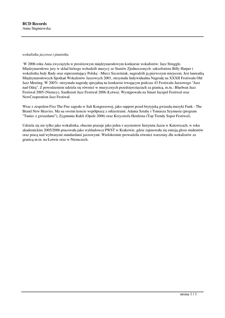 BCD Records Anna Stępniewska wokalistka jazzowa i pianistka W 2006 roku Ania zwyciężyła w prestiżowym międzynarodowym konkursie wokalistów: Jazz Struggle. Międzynarodowe jury w skład którego wchodzili muzycy ze Stanów Zjednoczonych: saksofonista Billy Harper i wokalistka Judy Bady oraz reprezentujący Polskę - Miecz Szcześniak, nagrodzili ją pierwszym miejscem. Jest laureatką Międzynarodowych Spotkań Wokalistów Jazzowych 2001, otrzymała Indywidualna Nagrodę na XXXII Festiwalu Old Jazz Meeting. W 2007r. otrzymała nagrodę specjalną na konkursie trwającym podczas 43 Festiwalu Jazzowego "Jazz nad Odrą". Z powodzeniem udziela się również w muzycznych przedsięwzięciach za granicą, m.in.: Blueboat Jazz Festiwal 2005 (Niemcy), Saulkrasti Jazz Festiwal 2006 (Łotwa). Występowała na Smart Jazzpol Festiwal oraz NewCooperation Jazz Festiwal. Wraz z zespolem Fizz The Fire zagrała w Sali Kongresowej, jako support przed brytyjską gwiazdą muzyki Funk - The Brand New Heavies. Ma na swoim koncie współpracę z orkiestrami: Adama Sztaby i Tomasza Szymusia (program "Taniec z gwiazdami"), Zygmunta Kukli (Opole 2006) oraz Krzysztofa Herdzina (Top Trendy Sopot Festiwal). Udziela się nie tylko jako wokalistka, obecnie pracuje jako jeden z asystentow Instytutu Jazzu w Katowicach, w roku akademickim 2005/2006 pracowała jako wykładowca PWST w Krakowie, gdzie zajmowała się emisją głosu studentów oraz pracą nad wybranymi standardami jazzowymi. Wielokrotnie prowadziła również warsztaty dla wokalistów za granicą m.in. na Łotwie oraz w Niemczech. strona 1 / 1