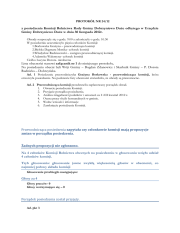 PROTOKÓŁ NR 24/12 z posiedzenia Komisji Rolnictwa Rady Gminy Dobrzyniewo Duże odbytego w Urzędzie Gminy Dobrzyniewo Duże w dniu 30 listopada 2012r. Obrady rozpoczęły się o godz. 9.00 a zakończyły o godz. 10.30 W posiedzeniu uczestniczyło pięciu członków Komisji: 1.Borkowska Grażyna – przewodnicząca komisji 2.Bielska Dagmara Monika- członek komisji 3.Władysław Radziszewski – zastępca przewodniczącej komisji. 4.Adamska Walentyna- członek komisji Ciołko Lucyna Dorota- nieobecna Lista obecności stanowi załącznik nr 1 do niniejszego protokołu. Na posiedzeniu obecni byli Wójt Gminy – Bogdan Zdanowicz i Skarbnik Gminy – P. Dorota Rudnicka – Dobrzyńska. Ad. 1 Posiedzeniu przewodniczyła Grażyna Borkowska - przewodnicząca komisji, która otworzyła posiedzenie. Na podstawie listy obecności stwierdziła, że obrady są prawomocne. Ad. 2 Przewodnicząca komisji przedstawiła zaplanowany porządek obrad. 1. Otwarcie posiedzenia Komisji. 2. Przyjęcie porządku posiedzenia. 3. Analiza ściągalności podatków i umorzeń za I i III kwartał 2012 r. 4. Ocena pracy służb komunalnych w gminie. 5. Wolne wnioski i informacje 6. Zamknięcie posiedzenia Komisji. Przewodnicząca posiedzenia zapytała czy członkowie komisji mają propozycje zmian w porządku posiedzenia. Żadnych propozycji nie zgłoszono. Na 4 członków Komisji Rolnictwa obecnych na posiedzeniu w głosowaniu wzięło udział 4 członków komisji. Tryb głosowania: głosowanie jawne zwykłą większością głosów w obecności, co najmniej połowy składu komisji Głosowanie przebiegło następująco: Głosy za 4 Głosy przeciw- 0 Głosy wstrzymujące się – 0 Porządek posiedzenia został przyjęty. Ad. pkt 3 Przewodnicząca posiedzenia poprosiła Skarbnika Gminy o informację na temat ściągalności podatków i umorzeń za I i III kwartał 2012 r. Skarbnik Gminy wyjaśniła te zagadnienia na podstawie przygotowanego zestawienia zaległości stanowiącego załącznik Nr 2 do niniejszego protokołu i analizy ściągalności stanowiącego załącznik Nr 3 do niniejszego protokołu. Radna Grażyna Borkowska zapytała, dlaczego jest tak wielu dłużników. Skarbnik Gminy wyjaśniła, że istnieją trudności w ściągalności, ponieważ najczęściej dłużnicy nie posiadają majątku, który można by zająć. Zadłużenia szczególnie pochodzą z braku opłat za korzystanie z sieci wodno – kanalizacyjnej oraz alimentów. Radna Dagmara Bielska zapytała o % ściągalności. Skarbnik Gminy powiedziała, że wystawiono 1093 upomnienia, kwota upomnień -128 130,00 zł. Tytuły dłużne to kwota 60 tys. zł. Radna Grażyna Borkowska zapytała, czy gmina może sięgać do rejestru dłużników. Skarbnik Gminy wyjaśniła, że najprawdopodobniej te dane są szczególnie chronione, ale należy to sprawdzić w ordynacji podatkowej. Radna Dagmara Bielska zapytała o straty gminy z powodu utrudnionej ściągalności długów. Skarbnik Gminy poinformowała, że w ciągu roku średnio straty wynosiły” 200 tys. zł. z funduszu alimentacyjnego 200 tys. zł. zaliczka z funduszu alimentacyjnego 5-6 tys. - wpłaty Radna Grażyna Borkowska, czy są inne możliwości ściągnięcia zaległości np. przejmowanie gruntów, odmowa wydawania zaświadczeń o posiadaniu gruntów. Radna Dagmara Bielska zaproponowała, żeby podjąć próbę mediacji z dłużnikami Skarbnik Gminy wyjaśniła, że gmina stosuje taką formę m.in. rozłożenie na raty. Następnie podjęto temat pobierania opłat za posiadanie psów. Radna Dagmara Bielska i Grażyna Borkowska nadmieniły, że na terenie gminy są hodowle psów. Zapytały, czy właściciele wnoszą opłaty za posiadanie tych psów. Skarbnik Gminy wyjaśniła, że właściciel powinien płacić, ale nie wnoszą do gminy takich opłat. Rolnik, który jest posiadaczem do dwóch psów jest zwolniony z opłaty. Radna Grażyna Borkowska zaproponowała, aby do decyzji o podatku dochodowym dołączyć informację o obowiązku wnoszenia opłat za posiadanie psów. Wójt Gminy poinformował, że Komendant Policji w Mońkach zaproponował, aby utworzyć straż międzygminną np. z gminami Krypno, Knyszyn. W każdej gminie zatrudniona byłaby 1 osoba. Wystąpił z propozycją przedstawienia planu funkcjonowania jednostki ( utrzymania czystości na posesjach, chodnikach). Rada Gminy podejmie decyzję o tworzeniu lub zaniechaniu tworzenia tego typu jednostki. Ad. pkt 4 Przewodnicząca posiedzenia zaprosiła na posiedzenie komisji Pana Marka Niewińskiegospecjalistę ds. utrzymania dróg. Pan Marek Niewiński poinformował, że w roku bieżącym na utrzymanie dróg wydatkowano kwotę 56 tys. zł ( 35 tys. – środki gminne, 21 – środki powiatu białostockiego). Na zimowe utrzymanie dróg został ogłoszony przetarg. W przetargu wyłonione zostały następujące firmy, które zajmą się zimowym utrzymaniem dróg na terenie naszej gminy tj. firma TRANS – KOP Waldemar Adamski, PROBET Fasty oraz Spółdzielnia Usług Rolniczych w Dobrzyniewie Dużym ( posypywanie ). Pozostałe wydatki na utrzymanie dróg ( 381 tys. zł.): równanie, obkaszanie poboczy, posypywanie kruszywem, destruktem betonowym, robienie przepustów, konserwacje dokonywane przez Spółkę Wodną „Jedność” budowa kanałów deszczowych na ul. Białostockiej w Fastach, uszczelnianie dróg, asfaltowanie ( ul. Spacerowa w Nowym Aleksandrowie, droga w Zalesiu.) Wykonano także 3 inwestycje: Budowy dróg z asfaltowaniem: Obrubniki, Nowe Aleksandrowo, Bohdan – Letniki. Radna Dagmara Bielska zaproponowała, aby gmina ogłosiła zbiórkę gruzu od mieszkańców gminy oraz aby corocznie przed i po zimie dokonywać kontroli przepustów i poboczy z uwagi, że zamulają się studzienki. Należy także dokonywać odkrzaczania dróg. Zwróciła uwagę na złą współpracę powiatu w zakresie utrzymania dróg. Radna Grażyna Borkowska poprosiła o naprawę drogi prowadzącej do cmentarza grzebalnego w Dobrzyniewie Kościel