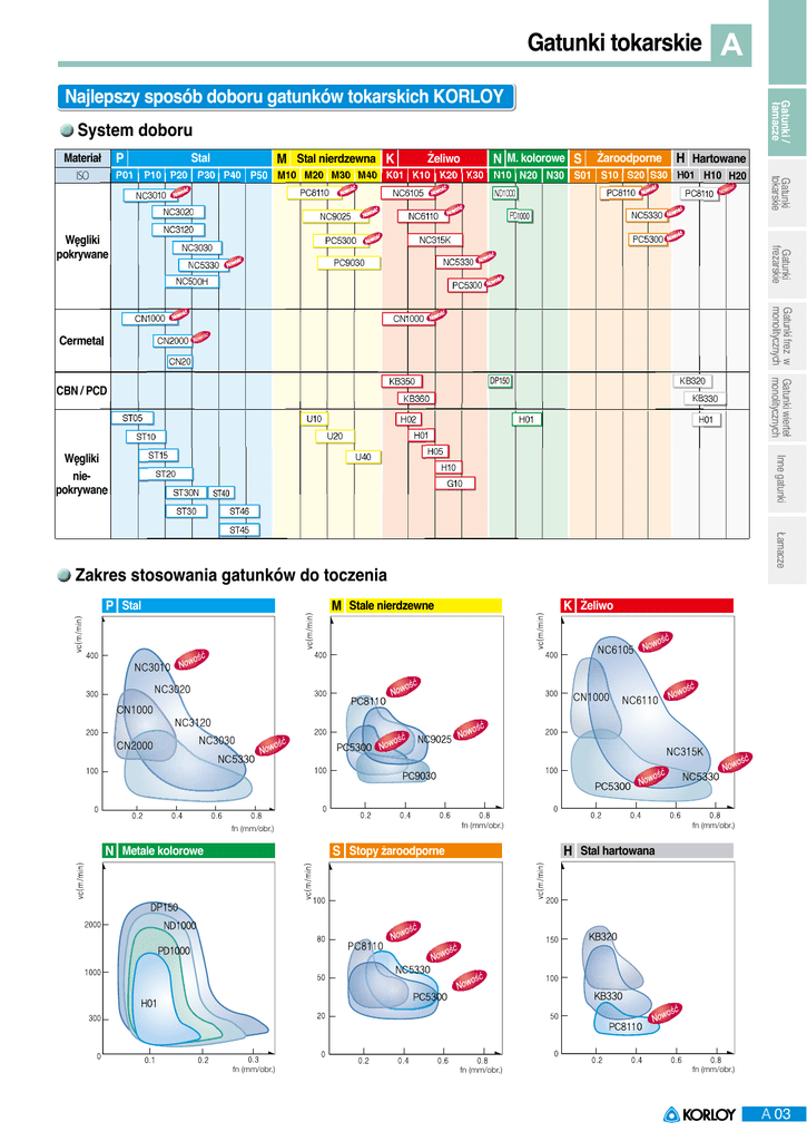 Gatunki tokarskie A Gatunki / łamacze Najlepszy sposób doboru gatunków tokarskich KORLOY System doboru P M Stal nierdzewna K Stal Żeliwo N M. kolorowe S Żaroodporne H Hartowane P01 P10 P20 P30 P40 P50 M10 M20 M30 M40 K01 K10 K20 K30 N10 N20 N30 S01 S10 S20 S30 H01 H10 H20 PC8110 NC3010 NC3020 Gatunki frezarskie NC500H PC5300 Gatunki frez— w monolitycznych CN1000 Cermetal PC5300 NC5330 PC9030 NC5330 PC8110 NC5330 PD1000 NC315K PC5300 NC3030 PC8110 ND1000 NC6110 NC9025 NC3120 Węgliki pokrywane NC6105 CN1000 CN2000 CN20 DP150 KB320 KB360 ST05 U10 ST15 U40 H05 ST20 ST30N ST30 H01 H01 H01 Inne gatunki Węgliki niepokrywane H02 U20 ST10 KB330 H10 G10 ST40 Gatunki wierteł monolitycznych KB350 CBN / PCD Gatunki tokarskie Materiał ISO ST46 Łamacze ST45 Zakres stosowania gatunków do toczenia P Stal M Stale nierdzewne K Żeliwo fnfn (mm/obr.) fn (mm/obr.) (mm/obr.) fnfn (mm/obr.) fn (mm/obr.) (mm/obr.) fnfn (mm/obr.) fn (mm/obr.) (mm/obr.) fnfn(mm/obr.) (mm/obr.) fn (mm/obr.) fnfn(mm/obr.) (mm/obr.) fn (mm/obr.) fnfn(mm/obr.) (mm/obr.) fn (mm/obr.) N Metale kolorowe S Stopy żaroodporne H Stal hartowana fnfn (mm/obr.) fn (mm/obr.) (mm/obr.) fn (mm/obr.) fnfn (mm/obr.) (mm/obr.) fn (mm/obr.) fnfn (mm/obr.) (mm/obr.) (mm/obr.) fnfn(mm/obr.) fn (mm/obr.) (mm/obr.) fnfn(mm/obr.) fn (mm/obr.) (mm/obr.) fnfn(mm/obr.) fn (mm/obr.) A 03 Łamacze Inne gatunki Gatunki wierteł monolitycznych Gatunki frez— w monolitycznych Gatunki frezarskie Gatunki tokarskie Gatunki / łamacze A Gatunki tokarskie Gatunki z pokryciem CVD Gatunki z pokryciem CVD do stali nierdzewnych i miękkich NC9025, NC5330 • • • • • Struktura pokrycia Warstwa TiN : Niska chropowatość powierzchni i krawędź zapobiegająca tworzeniu się narostów. Kolumnowa drobnoziarnista warstwa TiCN: Optymalna wytrzymałość i twardość. Twardy węglik, nałożona gładka powłoka. Poprawa odporności na narost na ostrzu, odporności na ścieranie i wytrzymałości. Doskonała wydajność obróbki stali nierdzewnej. Doskonała do obróbki stali klejącej się, miękkiej i stali kutej. Wyjątkowa żywotność przy obróbce materiałów trudnoskrawalnych (Inconel, stellit). Użycie bardzo wytrzymałego dedykowanego podłoża z węglika. Warstwa Aℓ2O3: Doskonała odporność na utlenianie. Sposób doboru Materiał obrabiany P Zalecana płytka Obr— bka ciągła NC3010 300 (200~400) NC3020 NC3120 NC3030 NC5330 NC500H 270 (170~370) 250 (150~350) NC9025 140 (80~220) NC6105 NC6110 NC315K NC5330 270 (150~300) NC5330 40 (20~60) Stal Obr— bka przerywana Obróbka ciągła Stal M nierdzewna Obr— bka przerywana K Żeliwo Zalecana prędkość skrawania (m/min) ISO Typ obróbki Obr— bka ciągła Obr— bka przerywana Obróbka ciągła Stopy S żaroodporne Obr— bka przerywana 200 (150~250) 190 (100~230) 100 (50~150) 350 (250~450) 200 (150~250) 180 (130~230) Zakres stosowania P01 P10 P15 NC3010 NC3020 P20 NC3120 P30 P35 P40 M30 M40 K05 K10 K20 K30 S20 S30 NC3030 NC5330 NC500H NC9025 NC6105 NC6110 NC315K NC5330 NC5330 Właściwości gatunków z pokryciem CVD Gatunki z pokr. CVD NC3010 P05 ~ P15 NC3020 P15 ~ P25 NC3120 P15 ~ P30 NC3030 P25 ~ P35 NC5330 P30~P40 M25~M35 K15~K25 S15~S25 Właściwości • Wysoka prędkość skrawania stali. • Doskonała odporność podłoża na zużycie z odpornością na wykruszenie, odporność termiczna Al2O3 większa stabilność. • MT-TiCN + Al2O3 + TiN • Wysoka prędkość skrawania stali. • Doskonała odporność podłoża na zużycie z odpornością na wykruszenie, odporność termiczna Al2O3 większa stabilność. • MT-TiCN + Al2O3 + TiN • Obróbka średnia i zgrubna stali. • Doskonała odporność podłoża na zużycie z odpornością na wykruszenie, odporność termiczna Al2O3 większa stabilność. • MT-TiCN + TiC + Al2O3 • Do ogólnego skrawania, przerywanego skrawania i obróbki zgrubnej stali i stali nierdzewnej. • Łączy doskonałą odporność podłoża na pękanie z odpornością na wykruszenie i odporność termiczną Al2O3 wraz z większą stabilnością w szerokiej gamie warunków skrawania. • MT-TiCN + TiC + Al2O3 + TiN • Stale nierdzewne/Typowa obróbka stali miękkich i stali do obróbki plastycznej • MT-TiCN + Al2O3 + TiN M25 ~ M35 • Typowe stale nierdzewne • MT-TiCN + Aℓ2O3 + TiN NC500H P25 ~ P35 • Ciężka przerywana obróbka stali • Podłoże odporne na odkształcenia plastyczne i odporność na narosty wraz z odpornością na tworzenie się narostów i i odporność termiczną Al2O3 wraz z większą stabilnością w szerokiej gamie warunków skrawania. • MT-TiCN + TiC + Al2O3 + TiN NC6105 K01 ~ K10 • Wysokowydajna obróbka żeliwa • MT-TiCN + Al2O3 NC6110 K05 ~ K15 • Typowe skrawanie żeliwa szarego i sferoidalnego. • Wytrzymałe podłoże i polepszona przyczepność grubych Al2O3 wykazują doskonałą odporność na zużycie. • MT-TiCN + Al2O3 NC315K K10 ~ K20 NC9025 A 04 ISO • Przerywane skrawanie i wysoko wydajna obróbka żeliwa. • Wytrzymałe podłoże i polepszona przyczepność grubych Al2O3 wykazują doskonałą odporność na zużycie. • MT-TiCN + Al2O3 + TiN Gatunki tokarskie Gatunki / łamacze Wydajność obróbki (NC9025 / NC5330) Stal nierdzewna (STS316) Konkurent A 5,3min Czas obróbki (min) : vc(m/min)=200 fn(mm/obr.)=0.25 ap(mm)=1.5 chłodzenie Badanie wytrzymałości NC9025 : Płytka CNMG120408-HS Oprawka PCLNR2525-M12 Konkurent A 1 ap(mm)=0,5 bez chłodzenia Oznaczenie : Płytka TNMG160408-HS Oprawka PTGNR2525-M16 2 3 Średnia 1 2 3 Średnia Średnia 1 2 3 Średnia 200sec 2 3 Konkurent Konkurent Parametry skrawania Konkurent Przejść Konkurent Przejść Konkurent Konkurent Konkurent CNMG120408-HS Oprawka DCLNR2525-M12 Konkurent Konkurent : vc(m/min)=32 fn(mm/obr.)=0.14 ap(mm)=5.0 chłodzenie Konkurent Oznaczenie : Płytka CNMG190612-GS Oprawka PCLNR4040-P19 Odkuwka (SCM420HV) Konkurent Parametry skrawania Oznaczenie Konkurent : vc(m/min)=286 fn(mm/obr.)=0.15 ap(mm)=2.0 chłodzenie : Płytka DNMG150608-