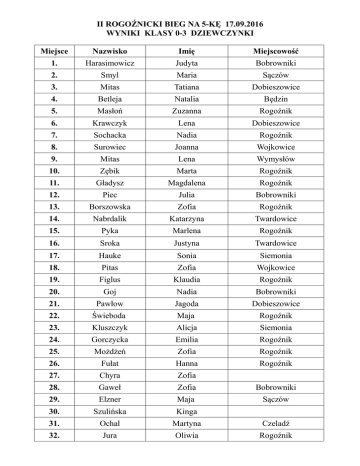 II ROGOŹNICKI BIEG NA 5-KĘ 17.09.2016 WYNIKI KLASY 0-3 DZIEWCZYNKI Miejsce Nazwisko Imię Miejscowość 1. Harasimowicz Judyta Bobrowniki 2. Smyl Maria Sączów 3. Mitas Tatiana Dobieszowice 4. Betleja Natalia Będzin 5. Masłoń Zuzanna Rogoźnik 6. Krawczyk Lena Dobieszowice 7. Sochacka Nadia Rogoźnik 8. Surowiec Joanna Wojkowice 9. Mitas Lena Wymysłów 10. Zębik Marta Rogoźnik 11. Gładysz Magdalena Rogoźnik 12. Piec Julia Bobrowniki 13. Borszowska Zofia Rogoźnik 14. Nabrdalik Katarzyna Twardowice 15. Pyka Marlena Rogoźnik 16. Sroka Justyna Twardowice 17. Hauke Sonia Siemonia 18. Pitas Zofia Wojkowice 19. Figlus Klaudia Rogoźnik 20. Goj Nadia Bobrowniki 21. Pawłow Jagoda Dobieszowice 22. Świeboda Maja Rogoźnik 23. Kluszczyk Alicja Siemonia 24. Gorczycka Emilia Rogoźnik 25. Możdżeń Zofia Rogoźnik 26. Fułat Hanna Rogoźnik 27. Chyra Zofia 28. Gaweł Zofia Bobrowniki 29. Elzner Maja Sączów 30. Szulińska Kinga 31. Ochal Martyna Czeladź 32. Jura Oliwia Rogoźnik 33. Bujak Julia 34. Baranowska Hanna Siemonia 35. Pracka Weronika Miasteczko Śląskie 36. Jacykowska Kalina Sączów 37. Pracka Małgorzata Miasteczko Śląskie 38. Owczarek Paulina 39. Czapla Maja Twardowice 40. Jura Jagoda Rogoźnik 41. Zydek Maja Dobieszowice 42. Musiał Julia Myszkowice 43. Gałęza Roksana Siemonia 44. Najbor Rozalia 45. Owczarek Hanna