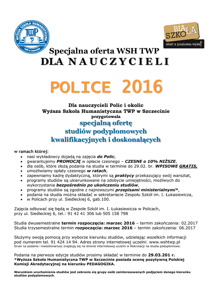 Specjalna oferta WSH TWP DLA N A U C Z Y C I E L I POLICE 2016 Dla nauczycieli Polic i okolic Wyższa Szkoła Humanistyczna TWP w Szczecinie przygotowała specjalną ofertę studiów podyplomowych kwalifikacyjnych i doskonalących w ramach której: nasi wykładowcy dojadą na zajęcia do Polic, gwarantujemy PROMOCJĘ w opłacie czesnego – CZESNE o 10% NIŻSZE, dla osób, które złożą podania na studia w terminie do 29.02. br. WPISOWE GRATIS, umożliwiamy opłaty czesnego w ratach, zapewniamy kadrę dydaktyczną, którymi są praktycy przekazujący swój warsztat, programy studiów są ukierunkowane na zdobycie umiejętności, możliwych do wykorzystania bezpośrednio po ukończeniu studiów, programy studiów są zgodne z najnowszymi przepisami ministerialnymi*, podania na studia można składać w sekretariacie Zespołu Szkół im. I. Łukasiewicza, w Policach przy ul. Siedleckiej 6, gab.100. Zajęcia odbywać się będą w Zespole Szkół im. I. Łukasiewicza w Policach, przy ul. Siedleckiej 6, tel.: 91 42 41 306 lub 505 158 798 Studia dwusemestralne termin rozpoczęcia: marzec 2016 – termin zakończenia: 02.2017 Studia trzysemestralne termin rozpoczęcia: marzec 2016 – termin zakończenia: 06.2017 Służymy swoją pomocą przy wyborze kierunku studiów, udzielając wszelkich informacji pod numerem tel. 91 424 14 94. Adres strony internetowej uczelni: www.wshtwp.pl Druki na podanie i kwestionariusz znajdują się na stronie internetowej uczelni w Rekrutacji na studia podyplomowe. Podania na pierwsze edycje studiów prosimy składać w terminie do 29.03.201 r. *Wyższa Szkoła Humanistyczna TWP w Szczecinie posiada ocenę pozytywną Polskiej Komisji Akredytacyjnej na kierunku PEDAGOGIKA. Warunkiem uruchomienia studiów jest zebranie się grupy osób zainteresowanych podjęciem danego kierunku studiów podyplomowych. Wyższa Szkoła Humanistyczna TWP w Szczecinie Wysokość czesnego na studiach podyplomowych dla nauczycieli w roku akademickim 2015/2016 L.p. Kierunek studiów Czesne za 1 sem. Promocja dla Gminy Police Czesne 10% niższe Czas trwania studiów 1 Bibliotekoznawstwo i edukacja biblioteczna 1500 1350 2 semestry 2 Diagnoza i terapia pedagogiczna 1200 1080 3 semestry 3 Edukacja i rehabilitacja osób z niepełnosprawnością intelektualną 1500 1350 2 semestry 4 Edukacja przedszkolna i wczesnoszkolna 1300 1170 3 semestry 5 Informatyka i zajęcia komputerowe dla nauczycieli 1300 1170 3 semestry 6 Logopedia szkolna – terapia dzieci z zaburzeniami komunikacji językowej 1400 1260 3 semestry 7 Praca z dzieckiem zdolnym i utalentowanym 1300 1170 2 semestry 8 Przygotowanie pedagogiczne 1200 1080 3 semestry 9 Resocjalizacja i socjoterapia 1400 1260 3 semestry 10 Surdopedagogika 1500 1350 2 semestry 11 Tyflopedagogika 1500 1350 2 semestry 12 Wczesne nauczanie języka angielskiego 1200 1080 3 semestry 13 Wczesne nauczanie języka niemieckiego 1200 1080 3 semestry 14 Wczesne wspomaganie rozwoju dziecka 1400 1260 3 semestry 15 Zarządzanie oświatą 1200 1080 2 semestry W ramach promocji: nasi wykładowcy dojadą na zajęcia do Polic, gwarantujemy – 10% zniżki w opłacie czesnego, umożliwiamy opłaty czesnego w ratach, zapewniamy kadrę dydaktyczną, którymi są praktycy przekazujący swój warsztat, programy studiów są ukierunkowane na zdobycie umiejętności, możliwych do wykorzystania bezpośrednio po ukończeniu studiów, programy studiów są zgodne z najnowszymi przepisami ministerialnymi*. *Wyższa Szkoła Humanistyczna TWP w Szczecinie posiada ocenę pozytywną Polskiej Komisji Akredytacyjnej na kierunku PEDAGOGIKA.