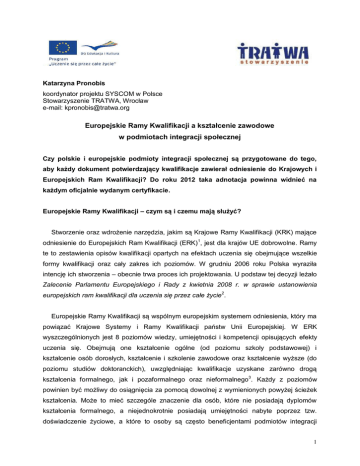 Katarzyna Pronobis koordynator projektu SYSCOM w Polsce Stowarzyszenie TRATWA, Wrocław e-mail: [email protected] Europejskie Ramy Kwalifikacji a kształcenie zawodowe w podmiotach integracji społecznej Czy polskie i europejskie podmioty integracji społecznej są przygotowane do tego, aby każdy dokument potwierdzający kwalifikacje zawierał odniesienie do Krajowych i Europejskich Ram Kwalifikacji? Do roku 2012 taka adnotacja powinna widnieć na każdym oficjalnie wydanym certyfikacie. Europejskie Ramy Kwalifikacji – czym są i czemu mają służyć? Stworzenie oraz wdrożenie narzędzia, jakim są Krajowe Ramy Kwalifikacji (KRK) mające odniesienie do Europejskich Ram Kwalifikacji (ERK) 1, jest dla krajów UE dobrowolne. Ramy te to zestawienia opisów kwalifikacji opartych na efektach uczenia się obejmujące wszelkie formy kwalifikacji oraz cały zakres ich poziomów. W grudniu 2006 roku Polska wyraziła intencję ich stworzenia – obecnie trwa proces ich projektowania. U podstaw tej decyzji leżało Zalecenie Parlamentu Europejskiego i Rady z kwietnia 2008 r. w sprawie ustanowienia europejskich ram kwalifikacji dla uczenia się przez całe życie 2. Europejskie Ramy Kwalifikacji są wspólnym europejskim systemem odniesienia, który ma powiązać Krajowe Systemy i Ramy Kwalifikacji państw Unii Europejskiej. W ERK wyszczególnionych jest 8 poziomów wiedzy, umiejętności i kompetencji opisujących efekty uczenia się. Obejmują one kształcenie ogólne (od poziomu szkoły podstawowej) i kształcenie osób dorosłych, kształcenie i szkolenie zawodowe oraz kształcenie wyższe (do poziomu studiów doktoranckich), uwzględniając kwalifikacje uzyskane zarówno drogą kształcenia formalnego, jak i pozaformalnego oraz nieformalnego3. Każdy z poziomów powinien być możliwy do osiągnięcia za pomocą dowolnej z wymienionych powyżej ścieżek kształcenia. Może to mieć szczególe znaczenie dla osób, które nie posiadają dyplomów kształcenia formalnego, a niejednokrotnie posiadają umiejętności nabyte poprzez tzw. doświadczenie życiowe, a które to osoby są często beneficjentami podmiotów integracji 1 społecznej. W praktyce system ten ma spowodować, że kwalifikacje i systemy ich nadawania staną się bardziej czytelne, co pomoże osobom uczącym się i pracującym nie tylko sprawnie podejmować naukę i pracę w krajach UE, ale i zmieniać pracę lub instytucję edukacyjną we własnym kraju4. Krajowe Ramy Kwalifikacji – zrealizowane projekty i bieżące działania W ramach Programu Operacyjnego Kapitał Ludzki (Priorytet III: Wysoka jakość oświaty, Działanie 3.4. Otwartość systemu edukacji w kontekście uczenia się przez całe życie, Poddziałanie 3.4.1. Opracowanie i wdrożenie Krajowego Systemu Kwalifikacji – projekty systemowe), powstaje obecnie raport opracowywany przez Zespół Ekspertów zaangażowanych w realizację projektu systemowego MEN pn. "Opracowywanie bilansu kwalifikacji i kompetencji dostępnych na rynku pracy w Polsce oraz modelu Krajowych Ram Kwalifikacji". Zakończenie prac planowane jest na koniec 2009 roku. Raport ten, po jego akceptacji, będzie miał charakter oficjalny. Wtedy także przeprowadzona zostanie ogólnopolska kampania informacyjna – wydane zostaną ulotki i broszury, stworzona zostanie strona internetowa oraz odbędą się spotkania informacyjne. W latach ubiegłych realizowane były już projekty dotyczące szkoleń i kwalifikacji zawodowych, m.in. w latach 1998–2004 ze środków PHARE (z inicjatywy MPiPS, MEN oraz MGiP) oraz w latach 2006–2007 ze środków EFS w ramach projektu MPiPS. W sumie powstały opisy 240 krajowych standardów kwalifikacji zawodowych dla wybranych specjalności. Są one dostępne w internetowej bazie danych Ministerstwa Pracy i Polityki Społecznej, zawierającej również technologię szkoleń, pod adresem: www.standardyiszkolenia.praca.gov.pl. Projekt SYSCOM – cele, bieżące i planowane działania Ponadnarodowy Projekt SYSCOM (Systematic Competency Documentation in Social Integration Enterprises)5 wychodzi naprzeciw potrzebie dostosowania krajowych systemów opisywania i nadawania kwalifikacji zawodowych do europejskiego procesu, aby móc jak najlepiej wykorzystać możliwości, jakie proces ten ze sobą niesie. Projekt jest współfinansowany przez Komisję Europejską, w ramach programu Uczenie się przez całe życie, i stanowi partnerstwo organizacji z Flandrii (Belgii), Austrii, Niemiec i Polski oraz współpracuje z Europejską Siecią Przedsiębiorstw Integracji Społecznej (European Network for Social Integration Entreprises – ENSIE). Rozpoczął się w styczniu 2009 r. i potrwa do grudnia 2010 r. 2 Grupą docelową Projektu są podmioty integracji społecznej, np.: instytucje prowadzące warsztaty społeczne w Belgii, zakłady integracji społecznej i kwalifikacji w Niemczech, przedsiębiorstwa integracji społecznej w Austrii, różne podmioty w Polsce (głównie działające w ramach III sektora, czyli organizacje pozarządowe, lub o zbliżonej charakterystyce) oferujące działania mające na celu integrację zawodową oraz podniesienie kwalifikacji osób doświadczających trudności w funkcjonowaniu na otwartym rynku pracy. Celem Projektu jest zarówno informowanie podmiotów integracji społecznej oraz instytucji z nimi współpracujących o postępach w planowaniu i wdrażaniu ERK / KRK jak i, co bardzo istotne, włączenie ich do europejskiej dyskusji na temat standardów szkoleń zawodowych i certyfikacji umiejętności uczestników. Dzięki temu zaangażowane w działania projektowe podmioty, mają możliwość wypowiedzenia się jeszcze na etapie planowania ERK / KRK na temat ich kształtu, czyli szans i zagrożeń w odniesieniu do swojej działalności. W Projekcie zaplanowano wykonanie trzech analiz. Dokonaniu pierwszej analizy, przeprowadzonej w tym roku w maju, służyła runda spotkań, podczas których zebrano informacje na temat rodzaju organizowanych
