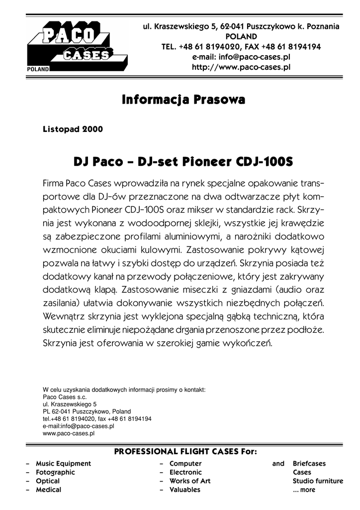 ul. Kraszewskiego 5, 62-041 Puszczykowo k. Poznania POLAND TEL. +48 61 8194020, FAX +48 61 8194194 e-mail: [email protected] http://www.paco-cases.pl Informacja Prasow a Prasowa Listopad 2000 DJ Paco – DJ−se t Pioneer CDJ−100S DJ−set Firma Paco Cases wprowadziła na rynek specjalne opakowanie trans− portowe dla DJ−ów przeznaczone na dwa odtwarzacze płyt kom− paktowych Pioneer CDJ−100S oraz mikser w standardzie rack. Skrzy− nia jest wykonana z wodoodpornej sklejki, wszystkie jej krawędzie są zabezpieczone profilami aluminiowymi, a narożniki dodatkowo wzmocnione okuciami kulowymi. Zastosowanie pokrywy kątowej pozwala na łatwy i szybki dostęp do urządzeń. Skrzynia posiada też dodatkowy kanał na przewody połączeniowe, który jest zakrywany dodatkową klapą. Zastosowanie miseczki z gniazdami (audio oraz zasilania) ułatwia dokonywanie wszystkich niezbędnych połączeń. Wewnątrz skrzynia jest wyklejona specjalną gąbką techniczną, która skutecznie eliminuje niepożądane drgania przenoszone przez podłoże. Skrzynia jest oferowania w szerokiej gamie wykończeń. W celu uzyskania dodatkowych informacji prosimy o kontakt: Paco Cases s.c. ul. Kraszewskiego 5 PL 62-041 Puszczykowo, Poland tel.+48 61 8194020, fax +48 61 8194194 e-mail:[email protected] www.paco-cases.pl PROFESSIONAL FLIGHT CASES For: – – – – Music Equipment Fotographic Optical Medical – – – – Computer Electronic Works of Art Valuables and Briefcases Cases Studio furniture … more ul. Kraszewskiego 5, 62-041 Puszczykowo k. Poznania POLAND TEL. +48 61 8194020, FAX +48 61 8194194 e-mail: [email protected] http://www.paco-cases.pl DJ Paco – DJ−se t Pioneer CDJ−100S DJ−set PROFESSIONAL FLIGHT CASES For: – – – – Music Equipment Fotographic Optical Medical – – – – Computer Electronic Works of Art Valuables and Briefcases Cases Studio furniture … more