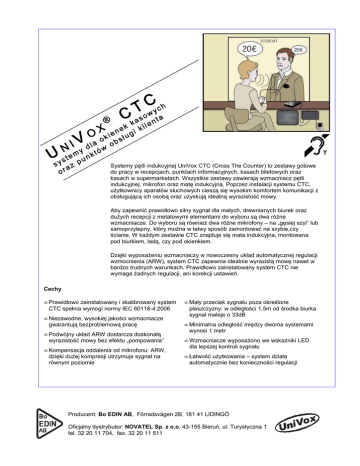 Systemy pętli indukcyjnej UniVox CTC (Cross The Counter) to zestawy gotowe do pracy w recepcjach, punktach informacyjnych, kasach biletowych oraz kasach w supermarketach. Wszystkie zestawy zawierają wzmacniacz pętli indukcyjnej, mikrofon oraz matę indukcyjną. Poprzez instalacji systemu CTC, uŜytkownicy aparatów słuchowych cieszą się wysokim komfortem komunikacji z obsługującą ich osobą oraz uzyskują idealną wyrazistość mowy. Aby zapewnić prawidłowo silny sygnał dla małych, drewnianych biurek oraz duŜych recepcji z metalowymi elementami do wyboru są dwa róŜne wzmacniacze. Do wyboru są równieŜ dwa róŜne mikrofony – na „gęsiej szyi” lub samoprzylepny, który moŜna w łatwy sposób zamontować na szybie,czy ścianie. W kaŜdym zestawie CTC znajduje się mata indukcyjna, montowana pod biurkiem, ladą, czy pod okienkiem. Dzięki wyposaŜeniu wzmacniaczy w nowoczesny układ automatycznej regulacji wzmocnienia (ARW), system CTC zapewnia idealnie wyrazistą mowę nawet w bardzo trudnych warunkach. Prawidłowo zainstalowany system CTC nie wymaga Ŝadnych regulacji, ani korekcji ustawień. Cechy • Prawidłowo zainstalowany i skalibrowany system CTC spełnia wymogi normy IEC 60118-4:2006 • Niezawodne, wysokiej jakości wzmacniacze gwarantują bezproblemową pracę • Podwójny układ ARW dostarcza doskonałą wyrazistość mowy bez efektu „pompowania” • Kompensacja oddalenia od mikrofonu: ARW, dzięki duŜej kompresji utrzymuje sygnał na równym poziomie • Mały przeciek sygnału poza określone płaszczyzny: w odległości 1,5m od środka biurka sygnał maleje o 33dB • Minimalna odległość między dwoma systemami wynosi 1 metr • Wzmacniacze wyposaŜono we wskaźniki LED dla lepszej kontroli sygnału • Łatwość uŜytkowania – system działa automatycznie bez konieczności regulacji Producent: Bo EDIN AB, Förradsvägen 2B, 181 41 LIDINGÖ Oficjalny dystrybutor: NOVATEL Sp. z o.o. 43-155 Bieruń, ul. Turystyczna 1 tel. 32 20 11 704, fax. 32 20 11 511 UniVox® CTC dla okienek kasowych i punktów informacyjnych Opis produktu ® Numer katalogowy 202025 UniVox CTC 202027 UniVox CTC-121: UniVox DLS-50 wzmacniacz pętli indukcyjnej UniVox 13E mikrofon pulpitowy Mata indukcyjna 202029 UniVox CTC-122: UniVox DLS-70 wzmacniacz pętli indukcyjnej UniVox 13V mikrofon samoprzylepny do szyb I ścian Mata indukcyjna 202031 UniVox CTC-123: UniVox DLS-70 wzmacniacz pętli indukcyjnej UniVox 13E mikrofon pulpitowy Mata indukcyjna DLS-50 wzmacniacz pętli indukcyjnej DLS-70 wzmacniacz pętli indukcyjnej Opis UniVox CTC-120: UniVox DLS-50 wzmacniacz pętli indukcyjnej UniVox 13V mikrofon samoprzylepny do szyb I ścian Mata indukcyjna Numer katalogowy 289015 Akcesoria Uchwyt montaŜowy ścienny: do wzmacniacza UniVox DLS-50 Mata indukcyjna Uwaga: Dane techniczne wzmacniaczy dostępne są w broszurach informacyjnych wzmacniaczy UniVox DLS-50 oraz UniVox DLS-70. UniVox 13V mikrofon samoprzylepny UniVox 13E mikrofon pulpitowy na “gęsiej szyi” Uchwyt montaŜowy - ścienny Producent: Bo EDIN AB, Förradsvägen 2B, 181 41 LIDINGÖ Oficjalny dystrybutor: NOVATEL Sp. z o.o. 43-155 Bieruń, ul. Turystyczna 1 tel. 32 20 11 704, fax. 32 20 11 511