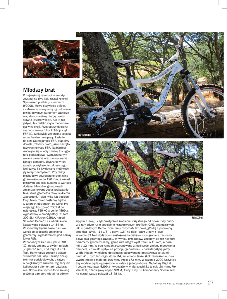 FSR XC Młodszy brat O największej rewolucji w amortyzowanej na dwa koła części kolekcji Specialized pisaliśmy w numerze 9/2008. Mowa oczywiście o Epicu z całkowicie nową ramą i gruntowanie przebudowanym systemem zawieszenia, które mieliśmy okazję przetestować jeszcze w lecie. Ale to nie jedyna, tak daleko idąca modernizacja w kolekcji. Przebudowy doczekał się podstawowy full w kolekcji, czyli FSR XC. Całkowicie zmieniona została rama, bardzo nawiązując kształtem do serii Stumpjumper FSR, stąd przydomek „młodszy brat”, jakim zaczęto nazywać nowego FSR. Najbardziej rzucające się w oczy zmiany to ciągła rura podsiodłowa i wymuszona tym zmiana ułożenia oraz zamocowania tylnego dampera. Uzyskano w ten sposób powiększenie zakresu regulacji sztycy i zlikwidowano możliwość jej kolizji z damperem. Przy okazji przebudowy powiększono skok tylnego zawieszenia do 120 mm, a wzrost prześwitu pod osią suportu to wartość dodana. Mimo tak gruntownych zmian zachowana został praktycznie taka sama geometria ramy, lekkiemu „zaostrzeniu” uległ tylko kąt podsiodłowy. Nowy rower dostępny będzie w czterech odsłonach, od wersji Pro mającego kosztować 7639 zł po najprostszy FSR XC w cenie 4599 zł, wyposażony w amortyzatory RS Tora 302 SL i X-Fusion O2RLA, napęd Shimano Deore/SLX i v-braki Avida. Nasza waga pokazała 14,34 kg. W sprzedaży będzie także damska wersja ze specjalnie zmienioną geometrią i wyposażeniem pod nazwą Myka FSR. W podobnym kierunku jak w FSR XC, poszły zmiany w dwóch fullach „ciężkich” serii, czyli Big Hit i SX Trail. Ramy także zostały przekonstruowane tak, aby uniknąć obciętych rur podsiodłowych, a sztyca o zwiększonym zakresie regulacji nie kolidowała z elementami zawieszenia. Oczywiście wymusiło to zmianę ułożenia dampera (detal na górnym Big Hit FSR III FSR SX Trail zdjęciu z lewej), czyli praktycznie zrobienie wszystkiego od nowa. Przy budowie ram użyto rur o specjalnie kształtowanych profilach ORE, analogicznych jak w zjazdowym Demo. Obie ramy otrzymały też nową główkę z podwójną średnicą łożysk - 1 i 1/8” u góry i 1,5” na dole (patrz u góry z lewej). W ramie SX Trail dodatkowo zastosowano ciekawe rozwiązanie z mimośrodową osią głównego zawiasu. W wyniku przebudowy zmieniły się też niektóre parametry geometrii ramy, górna rura uległa wydłużeniu o 13 mm, a baza kół o 12 mm. W obu ramach zrezygnowano z możliwości zmiany mocowania dampera, co miało wpływ na pozycję (geometrię) i charakterystykę jazdy. W Big Hitach, w miejsce dotychczas stosowanego podstawowego aluminium A1, użyto lepszego stopu M4, zmieniono także skok zawieszenia, dwa wyższe modele mają po 190 mm, trzeci 172 mm. W sezonie 2009 wszystkie trzy modele będą wyposażone w widelce jednopółkowe. Najtańszy Big Hit I będzie kosztował 6299 zł, wyposażony w Marzocchi Z1 (z osią 20 mm), Fox Vanilla R, 16-biegowy napęd SRAM, Avidy Juicy 3 i komponenty Specialized na naszej wadze pokazał 18,48 kg. bi k e Boa rd # 1 1 - 1 2 l i s t o p a d - gr u d z ie ń 2 0 0 8 27