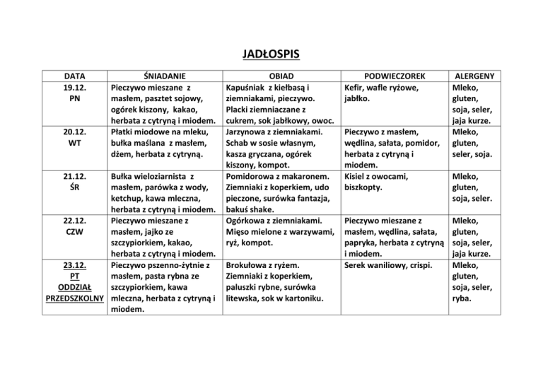 JADŁOSPIS DATA 19.12. PN 20.12. WT 21.12. ŚR ŚNIADANIE Pieczywo mieszane z masłem, pasztet sojowy, ogórek kiszony, kakao, herbata z cytryną i miodem. Płatki miodowe na mleku, bułka maślana z masłem, dżem, herbata z cytryną. Bułka wieloziarnista z masłem, parówka z wody, ketchup, kawa mleczna, herbata z cytryną i miodem. 22.12. Pieczywo mieszane z CZW masłem, jajko ze szczypiorkiem, kakao, herbata z cytryną i miodem. 23.12. Pieczywo pszenno-żytnie z PT masłem, pasta rybna ze ODDZIAŁ szczypiorkiem, kawa PRZEDSZKOLNY mleczna, herbata z cytryną i miodem. OBIAD Kapuśniak z kiełbasą i ziemniakami, pieczywo. Placki ziemniaczane z cukrem, sok jabłkowy, owoc. Jarzynowa z ziemniakami. Schab w sosie własnym, kasza gryczana, ogórek kiszony, kompot. Pomidorowa z makaronem. Ziemniaki z koperkiem, udo pieczone, surówka fantazja, bakuś shake. Ogórkowa z ziemniakami. Mięso mielone z warzywami, ryż, kompot. Brokułowa z ryżem. Ziemniaki z koperkiem, paluszki rybne, surówka litewska, sok w kartoniku. PODWIECZOREK Kefir, wafle ryżowe, jabłko. Pieczywo z masłem, wędlina, sałata, pomidor, herbata z cytryną i miodem. Kisiel z owocami, biszkopty. Pieczywo mieszane z masłem, wędlina, sałata, papryka, herbata z cytryną i miodem. Serek waniliowy, crispi. ALERGENY Mleko, gluten, soja, seler, jaja kurze. Mleko, gluten, seler, soja. Mleko, gluten, soja, seler. Mleko, gluten, soja, seler, jaja kurze. Mleko, gluten, soja, seler, ryba.