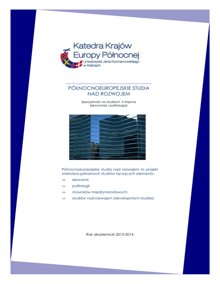 PÓŁNOCNOEUROPEJSKIE STUDIA NAD ROZWOJEM Specjalność na studiach II stopnia (ekonomia i politologia) Północnoeuropejskie studia nad rozwojem to projekt wielodyscyplinarnych studiów łączących elementy: ⇒ ekonomii ⇒ politologii ⇒ stosunków międzynarodowych ⇒ studiów nad rozwojem (development studies) Rok akademicki 2013-2014 STR. 2 O co chodzi z tymi studiami? Powód powołania przez KKEP UJK unikalnej, nowej specjalności na studiach magisterskich był trojaki. Po pierwsze, jesteśmy przekonani, że należy wyjść naprzeciw kluczowym problemom współczesności, jakimi są między innymi rozwój społeczno-gospodarczy i współpraca międzynarodowa. Po drugie, uważamy, iż należy zapewnić studentom możliwość dobrego kontaktu z wykładowcami, którzy zajmują się zawodowo tym, czego nauczają. Po trzecie, naszym zdaniem interdyscyplinarność jest ogromnym atutem nauk społecznych, co pozwala na szerszą formację intelektualną i zawodową naszych podopiecznych. Specjalność podejmuje: ⇒ problemy rozwoju nowoczesnych społeczeństw Zachodu ⇒ problemy nauki, gospodarki i polityki w ich kompleksowym ujęciu ⇒ kwestie praktycznego wykorzystania wiedzy teoretycznej Jeśli spojrzymy na ofertę edukacyjną UJK to okaże się, że nasza specjalność jest jedynym projektem studiów magisterskich na Wydziale Zarządzania i Administracji UJK, który podejmuje problematykę stosunków międzynarodowych, zarówno w aspekcie politycznym, jak i ekonomicznym. Naszym zdaniem perspektywa ta prowadzi studenta do twórczego konfrontowania ze sobą różnych sposobów myślenia, poszerza horyzonty, otwiera na nowe inspiracje, ukazuje ponadregionalne perspektywy kreowania swego rozwoju. Jako pracownicy KKEP UJK cieszymy się, że specjalność wzbudziła zainteresowanie uczelni, władz oraz pracodawców. Celem Katedry Krajów Europy Północnej jest wspieranie polskiego społeczeństwa na drodze rozwoju społecznego oraz gospodarczego. Profesjonalnie zajmujemy się analizą dobrych, sprawdzonych praktyk społecznych, politycznych i gospodarczych. Nasze doświadczenia odwołują się do przykładów, które zaobserwowaliśmy w najnowocześniejszych państwach świata - państwach nordyckich. Co więcej, możliwość dzielenia się tą wiedzą uważamy za nasz obowiązek. STR. 3 Analiza PEST naszej specjalności Nasza specjalność jest perspektywiczna z kilku powodów. Czynniki Polityczne • obserwujemy intensyfikację współpracy Polski z państwami Europy Północnej (Szwecją, Norwegią i in.) • Pojawiły się wspólne polsko-nordyckie projekty polityczne np. polskoszwedzka inicjatywa Partnerstwa Wschodniego Czynniki Ekonomiczne • Zauważalna jest wzmożona aktywność nowoczesnych skandynawskich firm na polskim rynku pracy • Państwa skandynawskie są liderami innowacyjności • Województwo Świętokrzyskie potrzebuje nowoczesnych kadr i rozwoju współpracy międzynarodowej Czynniki Społeczne • Postępuje wzrost poziomu wykształcenia ludności, co oznacza konieczność konkurowania na rynku pracy • Szersza współpraca międzynarodowa, migracje, większa ciekawość świata wśród młodych ludzi Czynniki Technologiczne • Internet staje się głównym źródłem informacji osób wykształconych, rozwija się gospodarka oparta na wiedzy oraz społeczeństwo informacyjne • Rozwijają się firmy i organizacje czerpiące z wzorców zaobserwowanych w państwach UE. KOMENTARZ: Liczne trendy odwołują się dziś do idei zrównoważonego rozwoju, wielu ekspertów potwierdza, iż jedynie kreatywność i innowacyjność pozwala być dziś konkurencyjnym państwem, regionem i... pracownikiem! Z naszych badań wynika, iż państwa Europy Północnej należą do najnowocześniejszych krajów świata. Skandynawia od wielu już lat pozostaje wiodącym obszarem świata w zakresie zrównoważonego rozwoju polityczno-gospodarczego, edukacji, ochrony środowiska, innowacji czy energetyki. Jak doszło do tego sukcesu? Co my możemy zrobić? I o tym są nasze studia... PRZEDMIOT Wprowadzenie do studiów nordyckich prof. zw. dr hab. Ryszard M. Czarny Nordycki model państwa dobrobytu (welfare state) S P E C Y FI K A I UM I E J ĘT N O Ś C I • zdobycie wiedzy na temat fundamentalnych zagadnień rozwoju państw nordyckich, takich jak: wzorce polityki, metody sprawowania władzy, organizacji państwa czy model demokracji w państwach nordyckich • student zapozna się z głównymi nurtami polityki gospodarczej, społecznej państw nordyckich oraz miejscem jakie zajmują w stosunkach międzynarodowych • zdobycie umiejętności samodzielnej analizy danych międzynarodowych, z uwzględnieniem Europy Północnej (area studies) • zapoznanie z mechanizmami rozwoju państwa dobrobytu • zdobycie umiejętności analizy kluczowych polityk gospodarczych współczesnego państwa • pozyskanie umiejętności analitycznych w zakresie analizy życia politycznego z perspektywy wybranych podejść teoretycznych dr Tomasz Jarocki Innowacyjność w krajach nordyckich dr Magdalena Tomala Korporacje nordyckie • poznanie fachowej terminologii związanej z innowacyjnością, gospodarką opartą na wiedzy i społeczeństwem informacyjnym • uzyskanie wiedzy nt. problemów zarządzania współczesnym przedsiębiorstwem w sytuacji szybkiego postępu technologicznego i innowacyjnego oraz postępującej globalizacji działalności gospodarczej. • zdobycie umiejętności w zakresie analizy przewag konkurencyjnych oraz rozwoju projektów innowacyjnych • zdobycie wiedzy nt. strategii i zasad funkcjonowania nowoczesnych nordyckich przedsiębiorstw. • przygotowanie studentów do samodzielnej analizy relacji mgr Tomasz Pawłuszko pomiędzy władzą a biznesem w państwach współczesnych • zdobycie umiejętności przygotowania i analizowania case study w zakresie zrównoważonego rozwoju i zarządzania • umiejętność analizy i oceny procesów podejmowania decyzji w otoczeniu polity