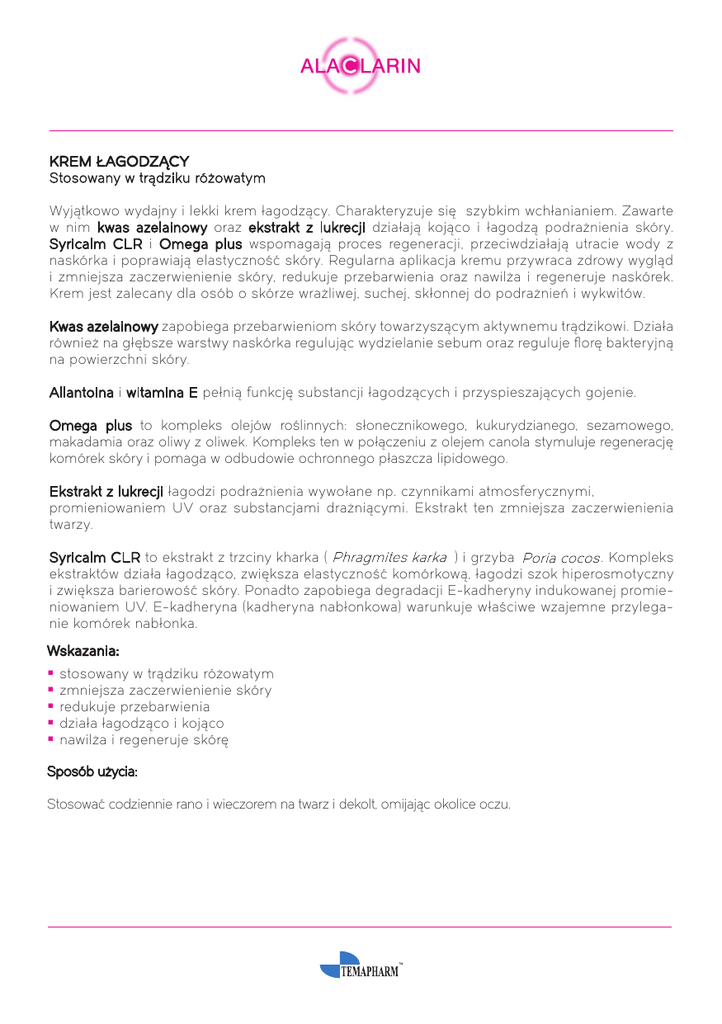 KREM ŁAGODZĄCY Stosowany w trądziku różowatym Wyjątkowo wydajny i lekki krem łagodzący. Charakteryzuje się szybkim wchłanianiem. Zawarte w nim kwas azelainowy oraz ekstrakt z lukrecji działają kojąco i łagodzą podrażnienia skóry. Syricalm CLR i Omega plus wspomagają proces regeneracji, przeciwdziałają utracie wody z naskórka i poprawiają elastyczność skóry. Regularna aplikacja kremu przywraca zdrowy wygląd i zmniejsza zaczerwienienie skóry, redukuje przebarwienia oraz nawilża i regeneruje naskórek. Krem jest zalecany dla osób o skórze wrażliwej, suchej, skłonnej do podrażnień i wykwitów. Kwas azelainowy zapobiega przebarwieniom skóry towarzyszącym aktywnemu trądzikowi. Działa również na głębsze warstwy naskórka regulując wydzielanie sebum oraz reguluje florę bakteryjną na powierzchni skóry. Allantoina i witamina E pełnią funkcję substancji łagodzących i przyspieszających gojenie. Omega plus to kompleks olejów roślinnych: słonecznikowego, kukurydzianego, sezamowego, makadamia oraz oliwy z oliwek. Kompleks ten w połączeniu z olejem canola stymuluje regenerację komórek skóry i pomaga w odbudowie ochronnego płaszcza lipidowego. Ekstrakt z lukrecji łagodzi podrażnienia wywołane np. czynnikami atmosferycznymi, promieniowaniem UV oraz substancjami drażniącymi. Ekstrakt ten zmniejsza zaczerwienienia twarzy. Syricalm CLR to ekstrakt z trzciny kharka ( ) i grzyba . Kompleks ekstraktów działa łagodząco, zwiększa elastyczność komórkową, łagodzi szok hiperosmotyczny i zwiększa barierowość skóry. Ponadto zapobiega degradacji E-kadheryny indukowanej promieniowaniem UV. E-kadheryna (kadheryna nabłonkowa) warunkuje właściwe wzajemne przyleganie komórek nabłonka. Wskazania: stosowany w trądziku różowatym zmniejsza zaczerwienienie skóry redukuje przebarwienia działa łagodząco i kojąco nawilża i regeneruje skórę Sposób użycia: Stosować codziennie rano i wieczorem na twarz i dekolt, omijając okolice oczu. Aqua, PEG-100 Stearate, Glyceryl Stearate, Isohexadecane, Isopropyl Palmitate, Glycerin, Cyclopentasiloxane, Propylene Glycol, Cetearyl Alcohol, Stearic Acid, Canola Oil, Ethoxydiglycol, Azelaic Acid, Phragmites Kharka Extract, Poria Cocos Extract, Glycyrrhiza Glabra Root Extract, Polyacrylate-13, Polyisobutene, Polysorbate 20, Helianthus Annuus Seed Oil, Zea Mays Oil, Sesamum Indicum Seed Oil, Macadamia Integrifolia Seed Oil, Olea Europæa Fruit Oil, Allantoin, Tocopheryl Acetate, Phenoxyethanol, Methylparaben, Propylparaben, Etylparaben, Butylparaben, Sodium Benzoate, Xanthan Gum, Disodium EDTA.