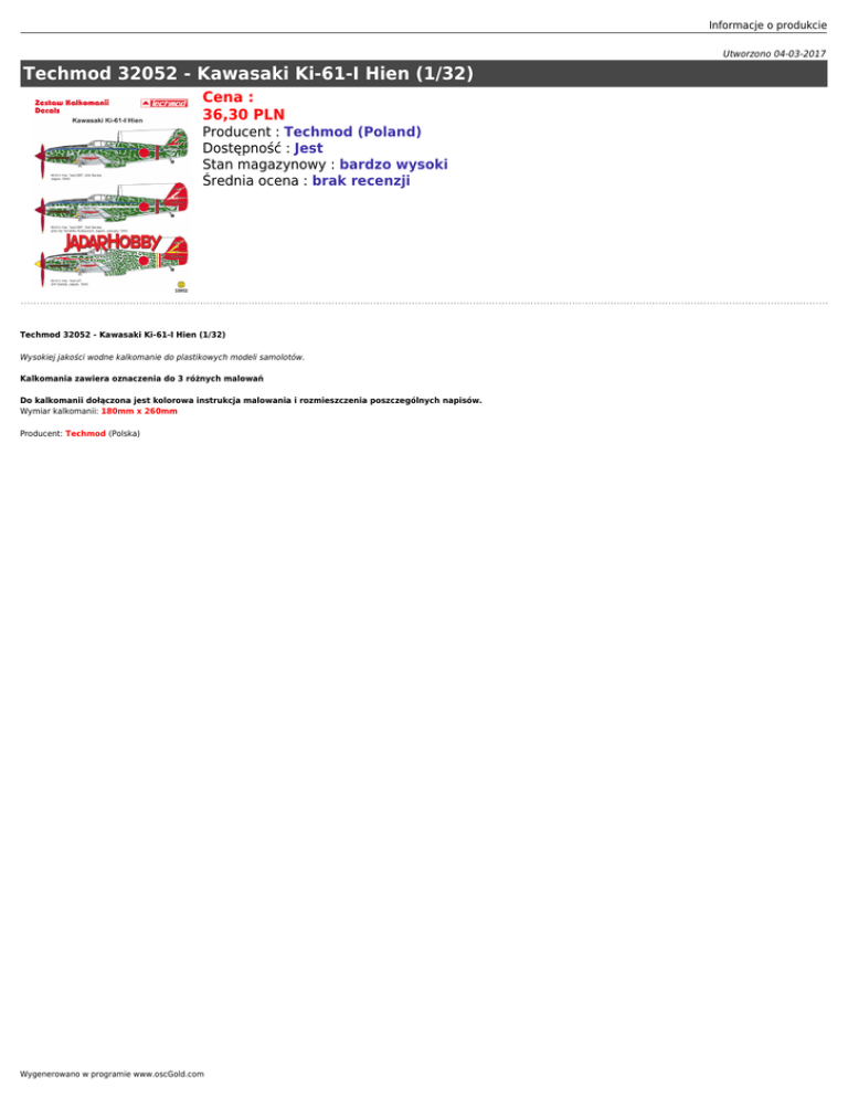 Informacje o produkcie Utworzono 04-03-2017 Techmod 32052 - Kawasaki Ki-61-I Hien (1/32) Cena : 36,30 PLN Producent : Techmod (Poland) Dostępność : Jest Stan magazynowy : bardzo wysoki Średnia ocena : brak recenzji Techmod 32052 - Kawasaki Ki-61-I Hien (1/32) Wysokiej jakości wodne kalkomanie do plastikowych modeli samolotów. Kalkomania zawiera oznaczenia do 3 różnych malowań Do kalkomanii dołączona jest kolorowa instrukcja malowania i rozmieszczenia poszczególnych napisów. Wymiar kalkomanii: 180mm x 260mm Producent: Techmod (Polska) Wygenerowano w programie www.oscGold.com Informacje o produkcie Ważne informacje: Prosimy o dokładne zapoznanie się z zasadami działania naszego sklepu. To bardzo ważne i pozwoli na uniknięcie nieporozumień związanych z koniecznością oczekiwania na przesyłkę. Wszystkie zamówienia realizujemy w kolejności zgłoszeń. Wybranie "przesyłka priorytetowa" jako sposobu wysyłki nie oznacza, że paczka zostanie wysłana na drugi dzień. To tylko rodzaj usługi pocztowej. Firma Jadar-Model jest właścicielem dwóch sklepów. Jeden z nich to sklep internetowy, drugi zaś jest prawdziwy i mieści się w Warszawie, stolicy Polski. Te same modele i akcesoria oferowane w sklepie internetowym sprzedawane są w jednocześnie w obu sklepach. Ponieważ nasza oferta jest bardzo duża nie mamy magazynu z wielką ilością tych samych przedmiotów. Może zdarzyć się, że model, który chcesz kupić został sprzedany w drugim sklepie. Wtedy zostaniesz powiadomiony emailem, że realizacja Twojego zamówienia będzie dłuższa, ponieważ musimy uzupełnić magazyn i czekamy na dostawę od producenta. Prosimy o cierpliwość i wyrozumiałość. Nie ponosimy odpowiedzialności za różnicę w zawartości pudełka w stosunku do prezentowanego zdjęcia. Zdjęcia są zazwyczaj reklamówkami i mogą zawierać również inne części, które nie wchodzą w skład danego produktu. Salon Modelarski Jadar-Model Wygenerowano w programie www.oscGold.com Ul. Jagiellońska 58, 03-468 Warszawa (przy Pl.Hallera) tel.(0 22) 403-34-30 (w sprawie zamówień prosimy dzwonić: (0 22) 620-05-39) Tutaj jesteśmy - kliknij poniższy link: Warszawa, Jagiellońska 58 sklep jest czynny w godz.: pon.-pt. 11.oo 19.oo sobota 10.oo 14.oo