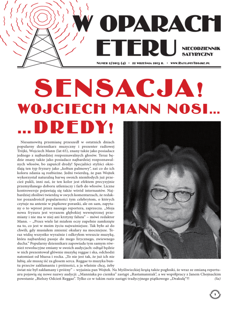 W oparach eteru NIECODZIENNIK SATYRYCZNY Numer 2/2013 (4) • 22 września 2013 r. • www.RatujmyTrojke.pl SENSACJA! WOJCIECH MANN NOSI… …DR EDY! Niesamowitą przemianę przeszedł w ostatnich dniach popularny dziennikarz muzyczny i prezenter radiowej Trójki, Wojciech Mann (lat 65), znany także jako posiadacz jednego z najbardziej rozpoznawalnych głosów. Teraz będzie znany także jako posiadacz najbardziej rozpoznawalnych włosów, bo zapuścił dredy! Specjaliści styliści określają ten typ fryzury jako „kołtun palmowy”, zaś co do ich koloru zdania są rozbieżne. Jedni twierdzą, że pan Wojtek wykorzystał naturalną barwę swoich niemłodych już przecież pukli, inni zaś, że ten kolor jest efektem precyzyjnie przemyślanego doboru utleniaczy i farb do włosów. Liczne kontrowersje pojawiają się także wśród internautów. Najbardziej złośliwi twierdzą w swych komentarzach, że redaktor pozazdrościł popularności tym celebrytom, o których czytuje na antenie w piątkowe poranki, ale on sam, zapytany o to wprost przez naszego reportera, zaprzecza. „Moja nowa fryzura jest wyrazem głębokiej wewnętrznej przemiany i nie ma w niej ani krztyny fałszu” – mówi redaktor Mann. – „Przez wiele lat miałem oczy zupełnie zamknięte na to, co jest w moim życiu najważniejsze. Tak było aż do chwili, gdy musiałem zmienić okulary na mocniejsze. Teraz widzę wszystko wyraźnie i odkryłem wreszcie muzykę, która najbardziej pasuje do mego lirycznego, zwiewnego ducha.” Popularny dziennikarz zapowiada tym samym również rewolucyjne zmiany w swoich audycjach: odtąd będzie w nich prezentował głównie muzykę reggae i ska, odchodzi natomiast od bluesa i rocka. „To nie jest tak, że już ich nie lubię, ale muszę iść za głosem serca. Reggae to muzyka buntu przeciw zakłamaniu i próżności, a ja właśnie chcę, żeby świat nie był zakłamany i próżny” – wyjaśnia pan Wojtek. Na Myśliwieckiej krążą także pogłoski, że wraz ze zmianą repertuaru pojawią się nowe nazwy audycji: „Manniaka po ciemku” zastąpi „Rastamanniak”, a we współpracy z Janem Chojnackim powstanie „Bielszy Odcień Reggae”. Tylko co w takim razie zastąpi tradycyjnego piątkowego „Drakulę”?! (ła) 1 Drodzy Czytelnicy, Drodzy Słuchacze! Udało się i oto jest: czwarty numer naszego niecodziennika „W oparach eteru”! Publikujemy go z nadzieją, że spodoba się Wam kierunek, w jakim postanowiliśmy podążyć przygotowując jego treść. Lojalnie uprzedzamy, że łatwo nie będzie, bowiem są w naszym zespole osoby, które lubią głaskać pod włos, a takie pieszczoty nie zawsze przynoszą ukojenie nerwów. Z drugiej strony staraliśmy się, aby ten numer nie był najeżony satyrą, od której włos jeży się na głowie. Na pewno miłym dla wielu Czytelników akcentem będzie kolejna porcja wywiadów. Tym razem wybraliśmy rozmowy z dwiema największymi osobowościami Polskiego Radia: Haliną Wachowicz (znaną jako Helen) i Wojciechem Mannem (znanym jako Pan Wojtek). Różni ich niemal wszystko: wiek, płeć, głos i włos, ale to właśnie oni trzęsą polską radiofonią, a może i całą polską gospodarką. Gdy w piątek rano Pan Wojtek budzi słuchaczy do życia, to właśnie dzięki niemu Polacy ochoczo ruszają do pracy, zaś piątkowym wieczorem, gdy na antenie na ulotną chwilę pojawia się Helen, ruch na ulicach zamiera, milkną syreny pociągów i statków, zatrzymują się fabryki i właśnie dzięki niej obywatele naszego kraju mogą w spokoju rozpocząć tradycyjny staropolski zapiątek (zwany też z angielska łikendem). Gdyby nie tych dwoje, kto wie, jaka byłaby kondycja naszej ojczyzny? Zapewne wisiałaby na włosku, ale nie jest celem naszej gazetki roztrząsanie problemów gospodarki, ani tym bardziej (tfu! tfu! tfu! przez lewe ramię) polityki. Od tego uciekamy czym prędzej w rejony bardziej przyjazne Czytelnikom spragnionym poezji i prozy. Specjalnie dla nich przygotowaliśmy dwa opowiadania oraz zestaw wierszy, niektórych nawet okraszonych muzyką. Zauważyliśmy, że dziwnym trafem większość z tych tekstów krąży gdzieś w okolicach owłosienia, co dało do myślenia zwłaszcza naszemu redakcyjnemu psychologowi. Próbował on nawet namówić nas na grupową terapię, ale uznaliśmy, że nie ma co dzielić włosa na czworo. Roztrząsanie wspomnień z dzieciństwa i hipnoza mogłyby tylko zaszkodzić, bo działalność naszej eterycznej redakcji nie może mieścić się w granicach zdrowego rozsądku. Gdyby tak było, to nie dotrwalibyśmy nawet do drugiego numeru naszej gazetki, a jednak jesteśmy już przy czwartym i nadal uparcie pchamy ten nasz redakcyjny wózek, choćby czasem grzązł w oporach eteru i internetu. Pchamy go zawsze z nadzieją, że z chaosu wielu różnych wypowiedzi uda się po raz kolejny złożyć jakąś spójną wizję i staramy się jakoś poukładać nasze nieuczesane myśli tak, by miały one satyryczną formę. Nawet jeśli w naszej satyrze jesteśmy nieobiektywni, to i tak możemy zagwarantować, że nikomu włos z głowy nie spadnie – mamy zbyt mały nakład, by rozbijać rodziny i strącać dyrektorów ze stołków, jak to robią poczytne kolorowe magazyny. Co najwyżej komuś będzie łyso – ale za to na twarzy kogoś innego pojawi się szczery uśmiech. I o to właśnie chodzi. (ła) 2 Kącik karaoke Na fali kontrowersyjnej popularności pewnego przeboju powstały jego alternatywne wersje, które plenią się po internecie. Poniżej przytaczamy dwie z nich: Grażyna Grażka plecie androny Nocą jak również rano Jak Ciotka Dobra Rada O wszystkim wie niemało. Grażka tak plecie w Trójce Antenie radia polskiego A ludzie jej słuchają I bladzi są od tego (ref.) Grażka, Grażka Weź przestań, to w eterze nie ujdzie Grażka, Grażka Na fali daj siebie unieść C C F F G C C F F G C F G C F G Trójczyna Trójka zrobiła audycje, A teraz chce je wywalić Ze swojej ramówki
