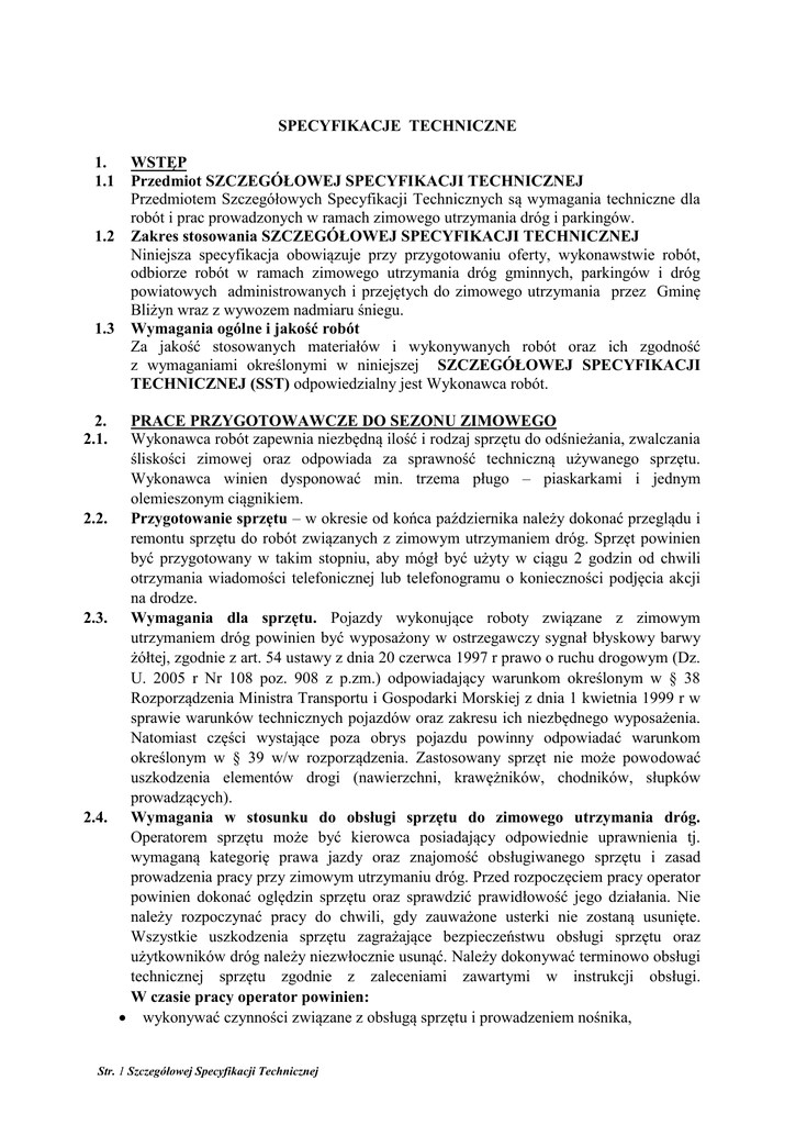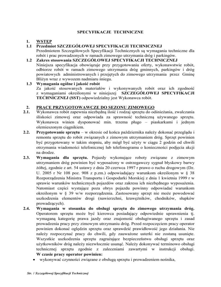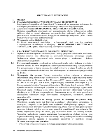 SPECYFIKACJE TECHNICZNE 1. 1.1 1.2 1.3 WSTĘP Przedmiot SZCZEGÓŁOWEJ SPECYFIKACJI TECHNICZNEJ Przedmiotem Szczegółowych Specyfikacji Technicznych są wymagania techniczne dla robót i prac prowadzonych w ramach zimowego utrzymania dróg i parkingów. Zakres stosowania SZCZEGÓŁOWEJ SPECYFIKACJI TECHNICZNEJ Niniejsza specyfikacja obowiązuje przy przygotowaniu oferty, wykonawstwie robót, odbiorze robót w ramach zimowego utrzymania dróg gminnych, parkingów i dróg powiatowych administrowanych i przejętych do zimowego utrzymania przez Gminę Bliżyn wraz z wywozem nadmiaru śniegu. Wymagania ogólne i jakość robót Za jakość stosowanych materiałów i wykonywanych robót oraz ich zgodność z wymaganiami określonymi w niniejszej SZCZEGÓŁOWEJ SPECYFIKACJI TECHNICZNEJ (SST) odpowiedzialny jest Wykonawca robót. 2. 2.1. PRACE PRZYGOTOWAWCZE DO SEZONU ZIMOWEGO Wykonawca robót zapewnia niezbędną ilość i rodzaj sprzętu do odśnieżania, zwalczania śliskości zimowej oraz odpowiada za sprawność techniczną używanego sprzętu. Wykonawca winien dysponować min. trzema pługo – piaskarkami i jednym olemieszonym ciągnikiem. 2.2. Przygotowanie sprzętu – w okresie od końca października należy dokonać przeglądu i remontu sprzętu do robót związanych z zimowym utrzymaniem dróg. Sprzęt powinien być przygotowany w takim stopniu, aby mógł być użyty w ciągu 2 godzin od chwili otrzymania wiadomości telefonicznej lub telefonogramu o konieczności podjęcia akcji na drodze. 2.3. Wymagania dla sprzętu. Pojazdy wykonujące roboty związane z zimowym utrzymaniem dróg powinien być wyposażony w ostrzegawczy sygnał błyskowy barwy żółtej, zgodnie z art. 54 ustawy z dnia 20 czerwca 1997 r prawo o ruchu drogowym (Dz. U. 2005 r Nr 108 poz. 908 z p.zm.) odpowiadający warunkom określonym w § 38 Rozporządzenia Ministra Transportu i Gospodarki Morskiej z dnia 1 kwietnia 1999 r w sprawie warunków technicznych pojazdów oraz zakresu ich niezbędnego wyposażenia. Natomiast części wystające poza obrys pojazdu powinny odpowiadać warunkom określonym w § 39 w/w rozporządzenia. Zastosowany sprzęt nie może powodować uszkodzenia elementów drogi (nawierzchni, krawężników, chodników, słupków prowadzących). 2.4. Wymagania w stosunku do obsługi sprzętu do zimowego utrzymania dróg. Operatorem sprzętu może być kierowca posiadający odpowiednie uprawnienia tj. wymaganą kategorię prawa jazdy oraz znajomość obsługiwanego sprzętu i zasad prowadzenia pracy przy zimowym utrzymaniu dróg. Przed rozpoczęciem pracy operator powinien dokonać oględzin sprzętu oraz sprawdzić prawidłowość jego działania. Nie należy rozpoczynać pracy do chwili, gdy zauważone usterki nie zostaną usunięte. Wszystkie uszkodzenia sprzętu zagrażające bezpieczeństwu obsługi sprzętu oraz użytkowników dróg należy niezwłocznie usunąć. Należy dokonywać terminowo obsługi technicznej sprzętu zgodnie z zaleceniami zawartymi w instrukcji obsługi. W czasie pracy operator powinien: wykonywać czynności związane z obsługą sprzętu i prowadzeniem nośnika, Str. 1 Szczegółowej Specyfikacji Technicznej w sposób ciągły obserwować sprzęt roboczy, zwracać baczną uwagę na bezpieczeństwo osób oraz pojazdów znajdujących się w pobliżu, przestrzegać zasad Kodeksu Drogowego. PRZYGOTOWANIE I SKŁADOWANIE MATERIAŁÓW DO ZAPOBIEGANIA POWSTANIU ŚLISKOŚCI ZIMOWEJ. 3.1. Środki chemiczne stosowane do zwalczania śliskości zimowej powinny posiadać atesty (badania techniczne) dopuszczające do stosowania przy zimowym utrzymaniu dróg. Sól (chlorek sodu – NaCl) stanowiąca element technologii stosowanych przy zwalczaniu śliskości zimowej powinna spełniać warunki określone w normie: sól (NaCl) PN-86/C-84081/02 oraz posiadać pozytywną opinię wydaną przez Instytut badawczy Dróg i Mostów w Warszawie i Państwowy Zakład Higieny w Warszawie. 3.2. Materiały uszorstniające stosowane do zwalczania śliskości zimowej powinny posiadać atesty (badania techniczne i odpowiadać następującym warunkom: piasek: nie może być zanieczyszczony związkami organicznymi (np. trawa, szczątki korzeni itp.) oraz nie może zawierać żadnych zanieczyszczeń gliniastych lub iglastych zawartość ziaren mniejszych niż 0,075 mm nie większa niż 5% uziarnienie do 2 mm, nadziana nie więcej niż 15% (nie dopuszcza się w nadzianie ziaren większych niż 4 mm) wskaźnik piaskowy ma być większy niż 65%. 3.3. Materiały do zimowego utrzymania gromadzi Wykonawca we własnym zakresie na bazie, z której będzie prowadził zimowe utrzymanie dróg w ilości zapewniającej ciągłość wykonywanych robót. Materiały powinny być składowane w magazynach, pod wiatą lub na wolnym powietrzu tak, aby nie prowadziły do degradacji środowiska naturalnego oraz mogły być użyte niezależnie od panujących warunków pogodowych. 3.4. Na wszystkie materiały stosowane do zimowego utrzymania Wykonawca zobowiązany jest posiadać świadectwo dopuszczenia do stosowania w budownictwie wydane przez Instytut Budowy Dróg i Mostów, a na środki chemiczne dodatkowo Państwowego Zakładu Higieny w Warszawie . Ponadto używane materiały powinny spełniać warunki Ustawy o odpadach (Dz. U. Nr 96 poz.592 z 1997r. z późn. zmianami). 3.5. Odpowiedzialność za stosowanie materiałów niezgodnych z wymogami ciąży na Wykonawcy. W przypadku stwierdzenia, że Wykonawca stosuje materiały niezgodne ze specyfikacją lub uzgodnieniami Zamawiający w przypadkach spornych lub wątpliwych zleci badanie materiału niezależnemu Laboratorium, a koszty badania pokryje Wykonawca. W przypadku negatywnego wyniku koszt badania zostanie potrącony z faktury za wykonane roboty. 3.6. Gromadzenie materiałów - przed sezonem zimowym, do l listopada należy zgromadzić odpowiedni zapas materiałów o wielkości wystarczającej co najmniej do miesięcznego prowadzenia prac. W czasie sezonu zimowego należy 