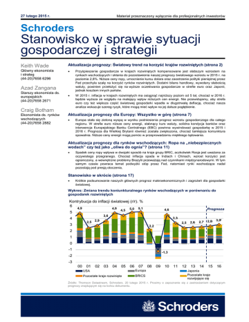 27 lutego 2015 r. Materiał przeznaczony wyłącznie dla profesjonalnych inwestorów Schroders Stanowisko w sprawie sytuacji gospodarczej i strategii Keith Wade Główny ekonomista i strateg (44-20)7658 6296 Aktualizacja prognozy: Światowy trend na korzyść krajów rozwiniętych (strona 2) • Przyśpieszenie gospodarcze w krajach rozwiniętych kompensowane jest słabszym wzrostem na rynkach wschodzących i skłania do pozostawienia naszej prognozy światowego wzrostu w 2015 r. na poziomie 2,8%. Niższe ceny ropy, umocnienie kursu dolara oraz zaostrzenie polityki pieniężnej przez Fed przechyla szalę na korzyść rynków rozwiniętych. Dodatni bilans handlowy, wywołany słabością waluty, powinien przełożyć się na wyższe oczekiwania gospodarcze w strefie euro oraz Japonii, jednak kosztem innych państw. • W 2015 r. inflacja w krajach rozwiniętych ma osiągnąć najniższy poziom od 5 lat, chociaż w 2016 r. będzie wyższa ze względu na malejący wpływ niższych cen energii. Nie przewidujemy, aby strefa euro czy też większa część światowej gospodarki wpadła w długotrwałą deflację, chociaż nasza analiza wskazuje szereg ryzyk, które mogą mieć wpływ na jej dalsze pogłębienie. Azad Zangana Starszy ekonomista ds. europejskich (44-20)7658 2671 Craig Botham Ekonomista ds. rynków wschodzących (44-20)7658 2882 Aktualizacja prognozy dla Europy: Wszystko w górę (strona 7) Europa stała się zieloną wyspą w wyniku podniesienia prognoz wzrostu gospodarczego dla całego regionu. W strefie euro niższe ceny energii, słabnący kurs waluty, solidna kondycja banków oraz interwencja Europejskiego Banku Centralnego (EBC) powinna wywindować gospodarkę w 2015 i 2016 r. Prognoza dla Wielkiej Brytanii również została zwiększona, chociaż tamtejsza koniunktura spowalnia. Niższe ceny energii mogą pomóc w przeprowadzeniu miękkiego lądowania. • Aktualizacja prognozy dla rynków wschodzących: Ropa na „niebezpiecznych wodach” czy też jako „oliwa do ognia”? (strona 11) Spadek ceny ropy wpływa w dwojaki sposób na kraje grupy BRIC, aczkolwiek Rosja jest uważana za oczywistego przegranego. Chociaż inflacja spada w Indiach i Chinach, wzrost korzyści jest ograniczony, a wewnętrzne problemy Brazylii przeważają nad czynnikami międzynarodowymi. W tym samym czasie powraca temat podwyżki stóp przez Fed, natomiast rynki wschodzące nadal pozostają pod presją otoczenia, • Stanowisko w skrócie (strona 17) Krótkie podsumowanie naszych głównych prognoz makroekonomicznych i zagrożeń dla gospodarki światowej. • Wykres: Zmiana trendu koniunkturalnego rynków wschodzących w porównaniu do gospodarek rozwiniętych Contributions to inflacji World GDP growth(r/r). (y/y), Kontrybucja do światowej %% 6 5 4.9 4,9 4,9 4.9 4,5 4.5 5,0 5.0 5.1 5,1 3,6 3.6 4 3,3 3.3 2.9 2.5 2,9 2,5 3 Forecast Prognoza 4,6 4.6 2,5 2.5 2,2 2.2 2 2,6 2.6 2,7 2.7 2,8 2.8 3.0 3,0 13 14 15 16 1 0 -1 -1.3 -1,3 -2 -3 00 01 USA US 02 03 04 05 Pozostałe kraje rozwinięte Rest of advanced 06 07 08 Europa Europe BRICS BRICS 09 10 11 12 Japonia Japan Pozostałe kraje Rest of emerging rozwijające się Źródło: Thomson Datastream, Schroders. 20 lutego 2015 r. Prosimy o zapoznanie się z zastrzeżeniem dotyczącym prognozy znajdującym się na końcu dokumentu. 27 lutego 2015 r. Materiał przeznaczony wyłącznie dla profesjonalnych inwestorów Aktualizacja prognozy: Światowy trend na korzyść krajów rozwiniętych Podniesienie prognozy wzrostu w krajach rozwiniętych kompensowane jest przez jej ograniczenie dla rynków wschodzących Zyski z niższych cen ropy wpłyną przede wszystkim na koniunkturę państw rozwiniętych. Podniesienie naszej prognozy wzrostu gospodarczego w tych ostatnich zostało skompensowane przez jej redukcję dla rynków wschodzących. W rezultacie nasze oczekiwania co do wzrostu światowej gospodarki pozostały na poziomie 2,8% r/r w 2015 r. Kraje rozwinięte mają uzyskać wzrost sięgający 2,2% r/r w tym roku, co oznacza skok o 0,5% w porównaniu do 2014, przy założeniu kontynuacji pozytywnych wiadomości płynących z USA. Jest szansa na najlepszy wynik od 2005 r. i uzyskanie poziomu 3,2% r/r (wcześniej założenia uwzględniały 2,8% r/r). W strefie euro i Japonii oczekuje się poprawy sytuacji. Podnieśliśmy nasze prognozy dla obu rynków o prawie 0,5% w 2015 r., do odpowiednio 1,3% r/r i 1,6% r/r. Jednak międzynarodowy poziom ożywienia rynków rozwiniętych jest ograniczany przez słabszą kondycję gospodarek wschodzących, w których wzrost ma spowolnić do 3,7% r/r z 4,2% r/r w 2014 r. Zmiany prognoz sprzyjają obecnie rynkom dojrzałym kosztem rozwijających się, co bezpośrednio wynika z kilku czynników. Po pierwsze, spadek cen ropy stymuluje koniunkturę państw rozwiniętych względem wschodzących, ponieważ te pierwsze są konsumentami netto ropy. Tymczasem w krajach wschodzących znajduje się kilku znaczących producentów ropy. W dodatku realny efekt niższej ceny ropy jest szybciej odczuwalny w krajach rozwiniętych, w których rząd w mniejszym stopniu oddziałuje na wartość ropy poprzez subsydiowanie. Jest to jednak pewne uogólnienie, ponieważ kilka gospodarek wschodzących korzysta z niższych cen ropy, np. wiele krajów azjatyckich, które są znaczącymi importerami surowca. Ponadto zakładamy skromny wzrost cen ropy na przestrzeni analizowanego okresu, chociaż według naszych ustaleń wartość pojedynczej baryłki wynosi obecnie około 20 dolarów poniżej naszej ostatniej prognozy z listopada minionego roku. Finalnie, gospodarki wschodzące tracą więcej niż kraje rozwinięte i tendencja ta w najbliższym czasie może się jeszcze bardziej uwidocznić, ponieważ z założenia gospodarki rozwijające się tracą szybciej niż zyskują dojrzałe. Po drugie, w ostatnich latach nie obserwujemy wzmożonego popytu (efektu spill-over) w krajach rozwiniętych względem państw rozwijających się. Naszym zdaniem ta sytuacja 