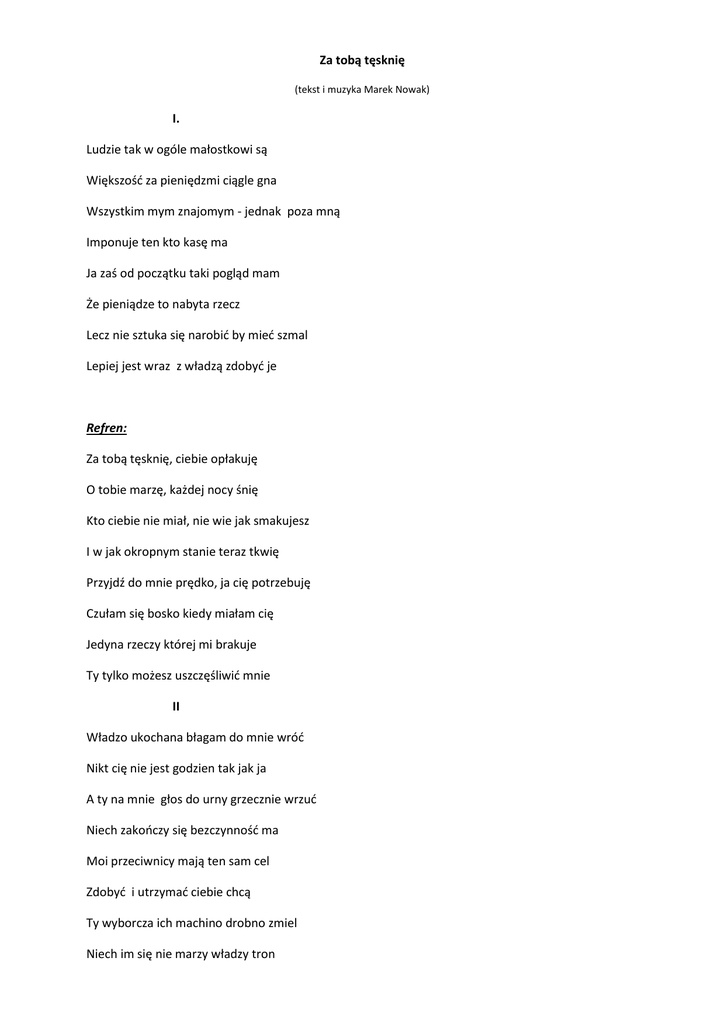 Za tobą tęsknię (tekst i muzyka Marek Nowak) I. Ludzie tak w ogóle małostkowi są Większość za pieniędzmi ciągle gna Wszystkim mym znajomym - jednak poza mną Imponuje ten kto kasę ma Ja zaś od początku taki pogląd mam Że pieniądze to nabyta rzecz Lecz nie sztuka się narobić by mieć szmal Lepiej jest wraz z władzą zdobyć je Refren: Za tobą tęsknię, ciebie opłakuję O tobie marzę, każdej nocy śnię Kto ciebie nie miał, nie wie jak smakujesz I w jak okropnym stanie teraz tkwię Przyjdź do mnie prędko, ja cię potrzebuję Czułam się bosko kiedy miałam cię Jedyna rzeczy której mi brakuje Ty tylko możesz uszczęśliwić mnie II Władzo ukochana błagam do mnie wróć Nikt cię nie jest godzien tak jak ja A ty na mnie głos do urny grzecznie wrzuć Niech zakończy się bezczynność ma Moi przeciwnicy mają ten sam cel Zdobyć i utrzymać ciebie chcą Ty wyborcza ich machino drobno zmiel Niech im się nie marzy władzy tron Refren: III Stroje, apanaże i służbowy wóz Hołdy i zaszczyty oraz dwór Rządzić swoim czasem i mieć pełen luz Tego mi nie zgarnie żaden gbur Tylko jedno ale w moim planie jest Demokracji zadość ma się stać Trzeba zatem wygrać ten wyborczy test O tą stawkę warto ostro grać Refren: