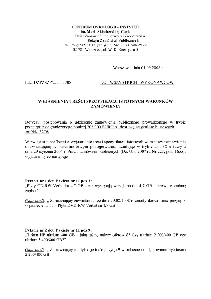 CENTRUM ONKOLOGII - INSTYTUT im. Marii Skłodowskiej-Curie Dział Zamówień Publicznych i Zaopatrzenia Sekcja Zamówień Publicznych tel. (022) 546 31 13 fax. (022) 546 22 53, 546 28 72 02-781 Warszawa, ul. W. K. Roentgena 5 _____________________________ Warszawa, dnia 01.09.2008 r. Ldz. DZPZSZP/............/08 DO WSZYSTKICH WYKONAWCÓW WYJAŚNIENIA TREŚCI SPECYFIKACJI ISTOTNYCH WARUNKÓW ZAMÓWIENIA Dotyczy: postępowania o udzielenie zamówienia publicznego prowadzonego w trybie przetargu nieograniczonego poniżej 206 000 EURO na dostawę artykułów biurowych, nr PN-132/08 W związku z prośbami o wyjaśnienie treści specyfikacji istotnych warunków zamówienia obowiązującej w przedmiotowym postępowaniu, działając w trybie art. 38 ustawy z dnia 29 stycznia 2004 r. Prawo zamówień publicznych (Dz. U. z 2007 r., Nr 223, poz. 1655), wyjaśniamy co następuje: Pytanie nr 1 dot. Pakietu nr 11 poz 3: „Płyty CD-RW Verbatim 4,7 GB - nie występują w pojemności 4,7 GB – proszę o zmianę zapisu.” Odpowiedź: „ Zamawiający zawiadamia, że dnia 29.08.2008 r. zmodyfikował treść pozycji 3 w pakiecie nr 11 – Płyta DVD-RW Verbatim 4,7 GB” Pytanie nr 2 dot. Pakietu nr 11 poz 9: „Taśma HP ultrium 400 GB – jaką taśmę należy oferować? Czy ultrium 2 200/400 GB czy ultrium 3 400/800 GB?” Odpowiedź: „ Zamawiający modyfikuje treść pozycji 9 w pakiecie nr 11, powinno być taśma 2 200/400 GB.” Pytanie nr 3 dot. Pakietu nr 11 poz 15: „DVD+R Verbatim do nadruku terma nie są dostępne na naszym rynku ( informacja od producenta), czy Zamawiający dopuści zaoferowanie DVD-R do nadruku terma, proszę o zmianę zapisu lub wykreślenie pozycji. ” Odpowiedź: „ Zamawiający modyfikuje treść pozycji 3 w pakiecie nr 11, powinno być płyta DVD-RW Verbatim 4,7”” Odpowiedź: „ Zamawiający nie dopuszcza oferowania DVD-R. Oferta musi być złożona zgodnie z SIWZ. Według Informacji, które posiada Zamawiający płyty DVD+R są dostępne na rynku polskim.” Pozostałe warunki Specyfikacji Istotnych Warunków Zamówienia pozostają bez zmian. Z poważaniem Dyrektor Centrum-Onkologii Instytutu Im. Marii Skłodowskiej – Curie Prof. dr hab. med. Marek P. Nowacki