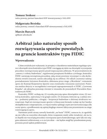 Tomasz Srokosz radca prawny, partner kancelarii KSP stowarzyszonej z SALANS Małgorzata Brzóska radca prawny, counsel z kancelarii KSP stowarzyszonej z SALANS Marcin Barczyk aplikant adwokacki Arbitraż jako naturalny sposób rozwiązywania sporów powstałych na gruncie kontraktów typu FIDIC Wprowadzenie Celem artykułu jest wykazanie, że przepisy o charakterze materialnym regulujące prawa i obowiązki stron kontraktu typu FIDIC rozciągają się także na obowiązki wyczerpania procedury rozwiązywania sporów przed rozpoczęciem arbitrażu. W przeciwieństwie do „umowy o roboty budowlane”, regulowanej przepisami Kodeksu cywilnego, kontrakty FIDIC zawierają wewnętrzną procedurę, jaką strony powinny wyczerpać w celu dochodzenia swoich roszczeń, zanim zdecydują się na arbitraż. Do takich czynności należą: powiadomienie Inżyniera Kontraktu, dokonane przez niego „Określenie”, wniesienie sporu do Komisji Rozjemstwa Sporów oraz ewentualne wnoszenie zastrzeżeń. Poniższa analiza dotyczy w szczególności rozwiązań zaproponowanych w FIDIC „Czerwona Książka”, ale aktualna pozostaje również w stosunku do pozostałych Warunków Kontraktowych FIDIC. Kontrakty FIDIC cechują się: (1) wysoką precyzją opisu obowiązków stron, (2) wartością kontraktu, najwyższą w tej grupie umów, (3) stronami, którymi są: z jednej strony − podmioty publiczne, z drugiej − korporacje budowlane o złożonej strukturze wewnętrznej. Stąd też rozwiązywanie sporów w klasycznej formule wydaje się być bardzo skomplikowane i nieprzejrzyste, co więcej wiedza sędziego często jest niewystarczająca dla oceny sporu, a posiłkowanie się opinią biegłego stanowi faktyczne przeniesienie na niego rozstrzygnięcia sporu. Natomiast jeżeli strony zawarły kontrakt „na bazie” FIDIC, oznacza to, że zgodziły się nie tylko na wszystkie obowiązki, które wzajemnie miały sobie świadczyć, ale na to, że dopóki nie wyczerpią procedury rozwiązania sporu kontraktowego, spór taki nie osiągnie zdatności arbitrażowej, a co za tym idzie − nie będzie mógł być przedmiotem postępowania przed sądem polubownym. Kwartalnik ADR • Nr 3(15)/2011 125 Srokosz, Brzóska, Barczyk Na marginesie należy tylko dodać, że zapis na sąd polubowny w kontrakcie typu FIDIC nakazywać będzie poprzedzenie wniesienia pozwu do sądu polubownego z wyczerpaniem procedury opisanej w klauzuli 20 (Roszczenia, spory i arbitraż) FIDIC „Czerwona Książka”. Poniższa analiza opiera się na rozróżnieniu pojęcia „Roszczenia” w rozumieniu subklauzuli 2.5 (Roszczenia Zamawiającego) oraz „roszczenia” w sensie potocznym, które zastąpimy synonimem „pretensja”. Analiza została oparta na założeniu pretensji Zamawiającego względem Wykonawcy, jednak wnioski będą, co do zasady, aktualne także dla pretensji odwrotnej. Zupełność regulacji Arbitraż Powiadomienie o niezadowoleniu FIDIC Komisja rozjemstwa w sporach Spór Roszczenie Określenie Pretensja KPC Czas na czynności procesowe, np. art. 497 12 KPC lub uznanie roszczenia Sprawa cywilna sporna Zdatność arbitrażowa Rys. 1. Ścieżka dochodzenia „Roszczenia” Zamawiającego (subklauzula 2.5) – procedura zgodna z subklauzulą 2.5 w zw. z 3.5 w zw. z klauzulą 20 126 Kwartalnik ADR • Nr 3(15)/2011 Arbitraż jako naturalny sposób rozwiązywania sporów Z przedstawionego powyżej wykresu wynika, iż „Roszczenie” Zamawiającego „określone” w trybie subklauzuli 3.5 (Określenia) stanowi warunek konieczny, ale niewystarczający do wszczęcia postępowania arbitrażowego w trybie subklauzuli 20.6 (Arbitraż). W celu uzupełnienia warunku koniecznego, ale niewystarczającego, istniejący spór dotyczący „Określonego” „Roszczenia” należy wnieść do Komisji Rozjemstwa w Sporach (dalej: KRS) celem uzyskania decyzji (subklauzula 20.4). Decyzja KRS może zostać uwzględniona bądź zakwestionowana poprzez przedłożenie przez którąś ze Stron „powiadomienia o niezadowoleniu”. Wówczas Strony w okresie 56 dni mogą załatwić sprawę polubownie, w przeciwnym razie spór będzie ostatecznie rozstrzygnięty w drodze arbitrażu. FIDIC 8.1 Data rozpoczęcia 20.2 Strony wyznaczają Komisję 20.4 Jedna ze Stron może wystawić „powiadomienie o niezadowoleniu” 20.4 Jedna ze Stron wnosi spór do Komisji Strony przedstawiają opinię Komisji < 28 dni < 84 dni 20.4 Jedna ze Stron może zapoczątkować arbitraż Załatwienie polubowne < 28 dni > 56 dni Komisja wydaje swoją decyzję Arbiter (-rzy) wyznaczony KPC Rys. 2. Chronologia postępowania w klauzuli 20 (FIDIC „Czerwona Książka”)1 Zakres klauzuli arbitrażowej Jak wskazuje C.R. Seppälä2: „zakres klauzuli arbitrażowej jest wąski, ponieważ żaden spór wynikający z kontraktów nie może być poddany arbitrażowi, jeżeli nie podjęto wyżej 1 Warunki Kontraktu FIDIC „Czerwona Książka”, Wprowadzenie, s. p−f. Seppälä, The Arbitration Clause in the FIDIC Contracts for Major Works, The International Construction Law Review, Londyn 2005, s. 5–6. 2 C.R. Kwartalnik ADR • Nr 3(15)/2011 127 Srokosz, Brzóska, Barczyk wymienionych sześciu kroków określonych w klauzuli 203. (…) Wszelkie inne spory pomiędzy stronami nie mogą być poddane arbitrażowi, jeżeli nie przeszły przez procedury Komisji określone w klauzuli 20. (…) Z tego wynika, że jedyną kwestią, która może być poddana pod arbitraż, jest „spór”, który: 1) został przekazany do KRS zgodnie z klauzulą 20 i 2) nie jest przedmiotem końcowej i wiążącej decyzji KRS, ponieważ zazwyczaj jedna ze stron nie zgadza się z decyzją KRS dotyczącą sporu w ciągu 28 dni (…). Jeżeli arbitrzy podejmą decyzję dotyczącą innych spraw bez zgody strony, wtedy przekroczą swoje kompetencje, a tym samym orzeczenie może być uchylone lub nieuznane i niezatwierdzone jako wykonalne”4. Tożsamą wykładnię zakresu klauzuli arbitrażowej zastosował Sąd 