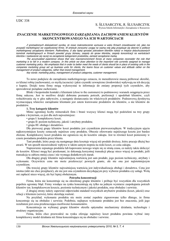 Економічні науки UDC 338 S. ŚLUSARCZYK, R. ŚLUSARCZYK Wyższa Szkoła Informatyki i Zarządzania w Rzeszowie ZNACZENIE MARKETINGOWEGO ZARZĄDZANIA ZACHOWANIEM KLIENTÓW SKONCENTROWANEGO NA ICH WARTOŚCIACH Z gromadzonych doświadczeń wynika, że nowe makrootoczenie wymusza w wielu firmach zrewidowanie roli, jaka ma przypaść marketingowi we współczesnej firmie. W artykule zwracamy uwagę na ważną rolę jaką przypisuje się obecnie w polityce marketingowej zarządzaniu klientami. Podkreślamy, iż aby lepiej sprostać potrzebom klientów należy w miejsce dotychczasowych komórek marketingowych w firmach powołać grupy biznesu, zespoły do spraw klientów, zespoły koncentracji na wartościach klientów i nastawienie się raczej na zarządzanie kategoriami produktów, zamiast zarządzania marką. The accumulated experience shows that new macroenvironment forces at many companies reconsider the role that marketing is to fall in a modern company. In this article we draw attention to the important role currently assigned to manage customer marketing policy. We emphasize that in order to better meet the needs of clients should be in place of existing cells in the companies marketing group set up business units for clients, the teams focus on customer values and attitude rather on the management of product categories, rather than brand management. Key words: marketing policy, management of product categories, customer management. To nowe podejście do zarządzania marketingowego oznacza, że menedżerowie muszą próbować określić, co klienci robią (zachowanie), co myślą (uczucia) i jakie czynniki zewnętrzne (środowisko) wpływają na ich decyzję o kupnie. Dzięki temu firmy mogą wykorzystać te informacje do zmiany proporcji tych czynników, aby spowodować pożądane zachowanie. Bliski i bezpośredni kontakt z klientami (close to the customers) to podstawowy warunek osiągnięcia przez firmę sukcesu. Jest to możliwe dzięki dobremu poznaniu potrzeb, preferencji i upodobań klientów, czyli wsłuchiwaniu się w głos nabywców, a następnie dostarczaniu im właściwych produktów. Podstawową dyrektywą wyznaczającą właściwe zarządzanie klientami jest zatem kierowanie produktów do klientów, a nie klientów do produktów. 1. Trzy kategorie klientów Mimo ogromnej liczby różnorakich firm i branż wszyscy klienci mogą być podzieleni na trzy grupy zgodnie z kryterium, co jest dla nich najważniejsze: • grupa I: kompleksowy koszt; • grupa II: poziom techniczny, jakość i atrybuty produktu; • grupa III: obsługa i doradztwo. Dla pierwszej grupy klientów koszt produktu jest czynnikiem pierwszorzędnym. W tradycyjnym ujęciu najkorzystniejsze koszty oznaczały najniższe ceny produktu. Obecnie oferowanie najniższego kosztu jest bardzo złożone. Kompleksowy koszt produktu nie ogranicza się do kosztów zakupu. Jest to również koszt poniesiony w czasie posiadania produktu przez klienta. Tani produkt, który psuje się następnego dnia kosztuje więcej niż produkt droższy, który pracuje dłużej bez awarii. W ten sposób niezawodność wpływa w takim samym stopniu na niski koszt, co cena zakupu. Naprawienie zepsutego produktu lub kupowanie nowego wiąże się ze stratą czasu, co należy także doliczyć do kosztów. Klienci mogą być przekonani, że dokonują korzystnej transakcji płacąc nieco więcej za produkt, jeśli transakcja ta zabiera mniej czasu i nie wymaga dodatkowych starań. Dla drugiej grupy klientów najważniejszą wartością jest sam produkt, jego poziom techniczny, atrybuty i wykonanie. Oczywiście cena nie może przekroczyć pewnych granic, ale nie ona jest najistotniejszym czynnikiem. Dla trzeciej grupy klientów najważniejszą wartością jest indywidualizacja obsługi i doradztwa. Cena jest istotna (nikt nie chce przepłacić), ale nie jest ona czynnikiem decydującym przy wyborze produktu czy usługi. Wolą oni zapłacić nieco więcej, ale być lepiej obsłużonym. Potrzeba koncentracji Firma, która nie koncentruje się na określonej grupie klientów i próbuje być wszystkim dla wszystkich popełnia ogromny błąd. Firmy wiodące na rynku koncentrują się tylko na jednym wymiarze zaspokajania potrzeb klientów tzn. kompleksowym koszcie, poziomie technicznym i jakości produktu, oraz obsłudze i serwisie. Z drugiej strony należy zapewnić odpowiedni standard wszystkich atrybutów produktu (koszt, jakość) oraz relacji z klientem (serwis), które określają wartość. Na przykład, wykonanie produktu nie może zostać zupełnie zignorowane tylko dlatego, że firma koncentruje się na obsłudze i serwisie. Podobnie, najlepsze wykonanie produktu jest bez znaczenia, jeśli jego rezultatem jest cena przekraczająca możliwości konsumentów. Koncentracja na wybranej grupie klientów określa optymalne mechanizmy działania, technologie i struktury organizacyjne. Firma, która chce przewodzić na rynku oferując najniższy koszt produktu powinna wybrać inny kompleksowy model działania niż firma koncentrująca się na obsłudze i serwisie. 130 Вісник Хмельницького національного університету 2010, № 5, T. 4 Економічні науки 2. Podstawowe elementy zarządzania zachowaniem klientów Zarządzanie zachowaniem klientów składa się z następujących elementów: • wiedzy na temat klientów, • zrozumienia ekonomiki relacji z klientem, • zarządzania procesem tworzenia wartości dla klienta. Potrzeba identyfikacji klientów, tj. oznaczenie ich tak, żeby można było każdego z nich zidentyfikować poprzez dowolny kanał dystrybucji, poprzez transakcje i interakcje w czasie. Pozwala to spojrzeć na pojedynczego klienta jak na kompleksowego klienta w ramach całej firmy i umożliwia przeprowadzenie ich zróżnicowania. Zróżnicowanie to zależy bowiem, zarówno od wartości, jakie klient wnosi do firmy, jak i unikalnych jego potrzeb, które firma zaspo