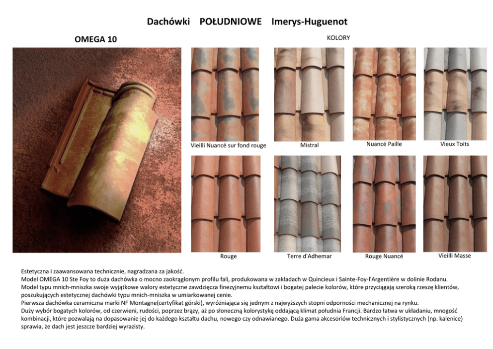 Dachówki POŁUDNIOWE Imerys-Huguenot KOLORY OMEGA 10 Vieilli Nuancé sur fond rouge Mistral Nuancé Paille Vieux Toits Rouge Terre d'Adhemar Rouge Nuancé Vieilli Masse Estetyczna i zaawansowana technicznie, nagradzana za jakośd. Model OMEGA 10 Ste Foy to duża dachówka o mocno zaokrąglonym profilu fali, produkowana w zakładach w Quincieux i Sainte-Foy-l'Argentière w dolinie Rodanu. Model typu mnich-mniszka swoje wyjątkowe walory estetyczne zawdzięcza finezyjnemu kształtowi i bogatej palecie kolorów, które przyciągają szeroką rzeszę klientów, poszukujących estetycznej dachówki typu mnich-mniszka w umiarkowanej cenie. Pierwsza dachówka ceramiczna marki NF Montagne(certyfikat górski), wyróżniająca się jednym z najwyższych stopni odporności mechanicznej na rynku. Duży wybór bogatych kolorów, od czerwieni, rudości, poprzez brązy, aż po słoneczną kolorystykę oddającą klimat południa Francji. Bardzo łatwa w układaniu, mnogośd kombinacji, które pozwalają na dopasowanie jej do każdego kształtu dachu, nowego czy odnawianego. Duża gama akcesoriów technicznych i stylistycznych (np. kalenice) sprawia, że dach jest jeszcze bardziej wyrazisty. CANAL-GIRONDE (mnich-mniszka) KOLORY Paysage Pastel Saintonge Rouge Styl południowy w najwyższej jakości, zadziwiająco stabilny model. CANAL GIRONDE 50 Poundex wykorzystuje wiedzę i umiejętności zakładu Saint-Geours d’Auribat w regionie Bordeaux. Stworzona dla dachów nowych i odnawianych. Tysiące obiektów zabytkowych pokrytych jest dachówką Canal Gironde 50 Postaw na kolor. Dzięki dużemu wyborowi kolorów możesz stworzyd dach swoich marzeo: oryginalny bądź typowy dla twojego regionu. Rose AQUITAINE KOLORY Rouge Saintonge Rose Pastel Paysage Vieux Saintonge Klasyka i zaawansowane rozwiązania techniczne. Dachówka malownicza , w stylu zachodnich wybrzeży Francji. AQUITAINE Poudenx to dachówka zakładkowa, o wysmukłym kształcie typowym dla zachodnich wybrzeży Francji. Pochodzi z zakładów w St Geours d'Auribat w Akwitanii. Mocne wybrzuszenie i rozmiar fali świadczą o pochodzeniu z zachodnich wybrzeży Francji. Autentyczny wygląd sprawia, że AQUITAINE Poudenx jest jedną z najczęściej wybieranych dachówek do dachów restaurowanych. AQUITAINE Poudenx jest ceniona również na dachach nowych, gdyż świetnie współgra z istniejącą architekturą. Każdy region ma swój własny charakter. AQUITAINE Poudenx to 6 kolorów, które wpisują się w różnorodnośd odcieni zdobiących dachy zachodnich wybrzeży Francji. MEDIANE KOLORY Rouergue Paysage Vieux Pastel Littoral Flamme Tradition Terroir Rouge Harmonia i elegancja. Model MEDIANE Plus, produkowany jest w zakładzie w Leguevin w rejonie Tuluzy. To dachówka o głębokiej fali , która idealnie odwzorowuje walory estetyczne tradycyjnych dachówek typu mnich-mniszka. Łatwa w układaniu na nowych dachach, z kolei na dachach restaurowanych bogactwo 9 odcieni kolorystycznych pozwala na dopasowanie jej wyglądu do nawet najbardziej unikalnej architektury. Duży wybór akcesoriów pozwala na kompletne wykooczenie newralgicznych punktów takich jak kalenica czy linie brzegowe. Dachówka MEDIANE Plus dzięki bogactwu odcieni i estetycznemu kształtowi swietnie współgra z otoczeniem. KOLORY PLEIN SUD Ventoux Mediterranea Terroir Paysage Rouge Tradition Antique Littoral Flamme Brun Rustique Vieux Pastel Wyrazista, łatwa i elastyczna w układaniu. Dachówka PLEIN SUD Gélis jest dużą dachówką zakładkową typu mnich-mniszka o mocno zaokrąglonym profilu fali. PLEIN SUD Gélis produkowana jest w zakładzie w Léguevin w rejonie Tuluzy. Jak wskazuje jej nazwa jest to dachówka typowa dla południa Francji. Wyjątkowa różnorodnośd dostępnych wykooczeo pozwala na dopasowanie wyglądu dachu do lokalnej architektury. Model PLEIN SUD Gélis wyróżnia się największym wyborem odcieni na rynku. Paleta odcieni szarości, czerwieni i brązów w połączeniu z efektami marmurkowymi dają piękny wygląd który nawiązuje do charakterystycznego stylu regionalnego. Model ten gwarantuje najwyższą jakośd wykooczenia. PLEIN SUD Gelis łączy tradycyjny wygląd i zaawansowane rozwiązania techniczne. Dachówka PLEIN SUD Gelis może byd dopasowywana poziomo i pionowo. Ta elastycznośd pozwala na szybkie układanie bez wielkiego wysiłku niezależnie od struktury dachu. ROMANE KOLORY Rouge Vieilli Vieux Pastel Terroir Paysage Calanque Patrimoine Brun Rustique Rose Flamme Vieilli Masse Rouge Klasyka i niezwykły wygląd. ROMANE Sans to dachówka ceramiczna produkowana we Francji, podobnie jak wszystkie dachówki z serii Imerys. Wytwarzana jest w Léguevin w rejonie Tuluzy. Jest to model charakteryzujący się mocnym wybrzuszeniem. ROMANE Sans to dachówka typu mnich-mniszka typowa dla południa Francji. Z upływem lat model ROMANE Sans zyskał niezrównaną renomę. Dachówka ROMANE Sans szczyci się jakością glin, z których jest zrobiona. Jeśli dodamy do tego doświadczenie i wiedzę przekazywane z pokolenia na pokolenie, otrzymamy dachówkę o doskonałym rodowodzie związaną z regionem, z którego pochodzi i o wyrobionej reputacji. Stylistyka nowoczesnej dachówki, zaadaptowana do dachów typu południowego. Jednak każde miejsce i każdy dach są wyjątkowe. Gama kolorów ROMANE Sans jest wyjątkowo szeroka, co pozwala na dowolny wybór. ROMANE Sans to elegancka linia, która współgra lub kontrastuje z otoczeniem. Dachówka ROMANE Sans to najwyższa jakośd, która sprawdzi się w renowacji zarówno starych domów jak i nowoczesnych budynków. Odnawiane dachy zyskują dzięki niej elegancką, klasyczną szatę. Przy nowoczesnych budowach ROMANE Sans połączy dawną i współczesną architekturę, aby idealnie wtopid się w styl lokalny. CANAL S KOLORY Saintonge Alezane Pastel Rouge Solidna, stylowa i zaskakująca. Harmonijna fala, płomienne odcienie… prawdziwie klasyczne piękno! W poszanowaniu tradycyjnych wartości IMERYS Toiture stw