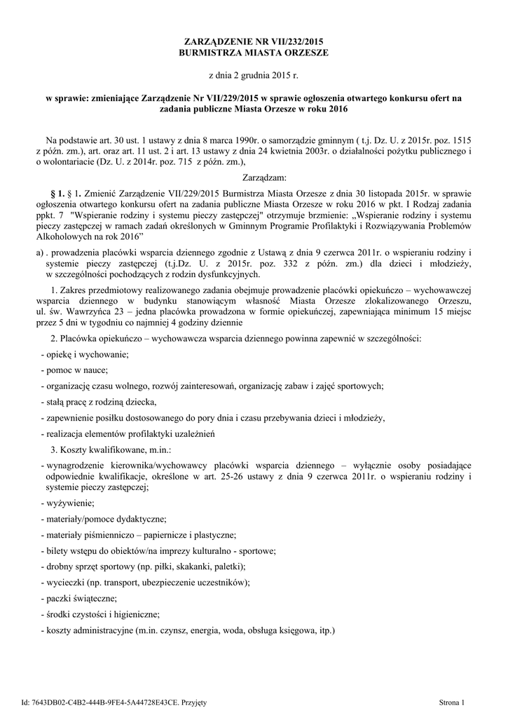 ZARZĄDZENIE NR VII/232/2015 BURMISTRZA MIASTA ORZESZE z dnia 2 grudnia 2015 r. w sprawie: zmieniające Zarządzenie Nr VII/229/2015 w sprawie ogłoszenia otwartego konkursu ofert na zadania publiczne Miasta Orzesze w roku 2016 Na podstawie art. 30 ust. 1 ustawy z dnia 8 marca 1990r. o samorządzie gminnym ( t.j. Dz. U. z 2015r. poz. 1515 z późn. zm.), art. oraz art. 11 ust. 2 i art. 13 ustawy z dnia 24 kwietnia 2003r. o działalności pożytku publicznego i o wolontariacie (Dz. U. z 2014r. poz. 715 z późn. zm.), Zarządzam: § 1. § 1. Zmienić Zarządzenie VII/229/2015 Burmistrza Miasta Orzesze z dnia 30 listopada 2015r. w sprawie ogłoszenia otwartego konkursu ofert na zadania publiczne Miasta Orzesze w roku 2016 w pkt. I Rodzaj zadania ppkt. 7 "Wspieranie rodziny i systemu pieczy zastępczej" otrzymuje brzmienie: „Wspieranie rodziny i systemu pieczy zastępczej w ramach zadań określonych w Gminnym Programie Profilaktyki i Rozwiązywania Problemów Alkoholowych na rok 2016” a) . prowadzenia placówki wsparcia dziennego zgodnie z Ustawą z dnia 9 czerwca 2011r. o wspieraniu rodziny i systemie pieczy zastępczej (t.j.Dz. U. z 2015r. poz. 332 z późn. zm.) dla dzieci i młodzieży, w szczególności pochodzących z rodzin dysfunkcyjnych. 1. Zakres przedmiotowy realizowanego zadania obejmuje prowadzenie placówki opiekuńczo – wychowawczej wsparcia dziennego w budynku stanowiącym własność Miasta Orzesze zlokalizowanego Orzeszu, ul. św. Wawrzyńca 23 – jedna placówka prowadzona w formie opiekuńczej, zapewniająca minimum 15 miejsc przez 5 dni w tygodniu co najmniej 4 godziny dziennie 2. Placówka opiekuńczo – wychowawcza wsparcia dziennego powinna zapewnić w szczególności: - opiekę i wychowanie; - pomoc w nauce; - organizację czasu wolnego, rozwój zainteresowań, organizację zabaw i zajęć sportowych; - stałą pracę z rodziną dziecka, - zapewnienie posiłku dostosowanego do pory dnia i czasu przebywania dzieci i młodzieży, - realizacja elementów profilaktyki uzależnień 3. Koszty kwalifikowane, m.in.: - wynagrodzenie kierownika/wychowawcy placówki wsparcia dziennego – wyłącznie osoby posiadające odpowiednie kwalifikacje, określone w art. 25-26 ustawy z dnia 9 czerwca 2011r. o wspieraniu rodziny i systemie pieczy zastępczej; - wyżywienie; - materiały/pomoce dydaktyczne; - materiały piśmienniczo – papiernicze i plastyczne; - bilety wstępu do obiektów/na imprezy kulturalno - sportowe; - drobny sprzęt sportowy (np. piłki, skakanki, paletki); - wycieczki (np. transport, ubezpieczenie uczestników); - paczki świąteczne; - środki czystości i higieniczne; - koszty administracyjne (m.in. czynsz, energia, woda, obsługa księgowa, itp.) Id: 7643DB02-C4B2-444B-9FE4-5A44728E43CE. Przyjęty Strona 1 § 2. Treść zarządzenia zmieniającego, o którym mowa w § 1, zamieścić w Biuletynie Informacji Publicznej, w siedzibie Urzędu Miejskiego Orzesze w miejscu przeznaczonym na zamieszczanie ogłoszeń oraz na stronie internetowej Urzędu Miejskiego Orzesze. § 3. Wykonanie zarządzenia powierza się Kierownikowi Referatu ds. Promocji Miasta, Współpracy ze Stowarzyszeniami, Przeciwdziałania Uzależnieniom oraz Zarządzania Kryzysowego. § 4. Zarządzenie wchodzi w życie z dniem podpisania. Burmistrz Miasta Orzesze inż. Mirosław Blaski Id: 7643DB02-C4B2-444B-9FE4-5A44728E43CE. Przyjęty Strona 2