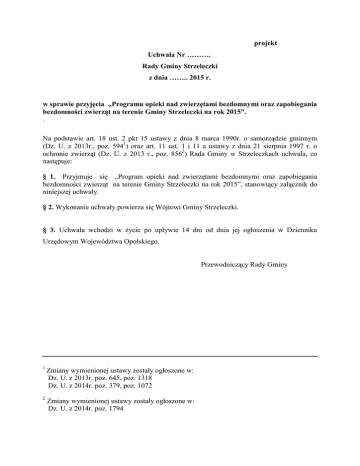 projekt Uchwała Nr ………. Rady Gminy Strzeleczki z dnia …….. 2015 r. w sprawie przyjęcia „Programu opieki nad zwierzętami bezdomnymi oraz zapobiegania bezdomności zwierząt na terenie Gminy Strzeleczki na rok 2015”. . Na podstawie art. 18 ust. 2 pkt 15 ustawy z dnia 8 marca 1990r. o samorządzie gminnym (Dz. U. z 2013r., poz. 5941) oraz art. 11 ust. 1 i 11 a ustawy z dnia 21 sierpnia 1997 r. o ochronie zwierząt (Dz. U. z 2013 r., poz. 8562) Rada Gminy w Strzeleczkach uchwala, co następuje: § 1. Przyjmuje się „Program opieki nad zwierzętami bezdomnymi oraz zapobiegania bezdomności zwierząt na terenie Gminy Strzeleczki na rok 2015”, stanowiący załącznik do niniejszej uchwały. § 2. Wykonanie uchwały powierza się Wójtowi Gminy Strzeleczki. § 3. Uchwała wchodzi w życie po upływie 14 dni od dnia jej ogłoszenia w Dzienniku Urzędowym Województwa Opolskiego. Przewodniczący Rady Gminy 1 Zmiany wymienionej ustawy zostały ogłoszone w: Dz. U. z 2013r. poz. 645, poz. 1318 Dz. U. z 2014r. poz. 379, poz. 1072 2 Zmiany wymienionej ustawy zostały ogłoszone w: Dz. U. z 2014r. poz. 1794 Załącznik do Uchwały Nr ……… Rady Gminy Strzeleczki z dnia ………. 2015 r. Program opieki nad zwierzętami bezdomnymi oraz zapobiegania bezdomności zwierząt na terenie Gminy Strzeleczki na rok 2015 Rozdział I Postanowienia ogólne § 1. Program ma zastosowanie do wszystkich zwierząt domowych i gospodarskich, w tym w szczególności do psów i kotów przebywających w granicach administracyjnych Gminy Strzeleczki. § 2. Celami programu są: 1) zapewnienie bezdomnym zwierzętom miejsca w schronisku dla zwierząt; 2) sprawowanie opieki nad wolno żyjącymi kotami, w tym ich dokarmianie; 3) odławianie bezdomnych zwierząt; 4) ograniczenie populacji bezdomnych zwierząt poprzez obligatoryjną sterylizację lub kastracje zwierząt w schroniskach dla zwierząt; 5) poszukiwanie właścicieli dla bezdomnych zwierząt; 6) usypianie ślepych miotów; 7) wskazanie gospodarstwa rolnego w celu zapewnienia miejsca dla zwierząt gospodarskich z terenu Gminy Strzeleczki; 8) zapewnienie całodobowej opieki weterynaryjnej w przypadkach zdarzeń drogowych z udziałem zwierząt. § 3 Ilekroć w regulaminie jest mowa o: 1) zwierzętach bezdomnych – rozumie się przez to zwierzęta określone w art. 4 pkt 16 ustawy z dnia 21 sierpnia 1997 r. o ochronie zwierząt (Dz. U. z 2013 r., poz. 856 ze zm.); 2) zwierzętach domowych - rozumie się przez to zwierzęta określone w art. 4 pkt 17 ustawy z dnia 21 sierpnia 1997 r. o ochronie zwierząt (Dz. U. z 2013 r., poz. 856 ze zm.); 3) zwierzętach gospodarskich – rozumie się przez to zwierzęta określone w art. 4 pkt 18 ustawy z dnia 21 sierpnia 1997 r. o ochronie zwierząt (Dz. U. z 2013 r., poz. 856 ze zm.); 4) schronisku – należy przez to rozumieć schroniska dla bezdomnych zwierząt z którym Gmina Strzeleczki zawarła stosowne porozumienie; 5) Programie – należy przez to rozumieć Program opieki nad zwierzętami bezdomnymi oraz zapobiegania bezdomności zwierząt na terenie Gminy Strzeleczki na rok 2014. § 4. Wykonawcami Programu są: 1) Urząd Gminy Strzeleczki, 2) organizacje pozarządowe, których statutowym celem jest ochrona zwierząt, 3) osoby prawne i fizyczne działające na rzecz zapewnienia opieki bezdomnym zwierzętom. Rozdział II Zapewnienie opieki bezdomnym zwierzętom § 5. W celu zapewnienia opieki bezdomnym zwierzętom przewiduje się realizację następujących zadań: 1) wyłapywanie bezdomnych zwierząt z terenu gminy Strzeleczki przez Pana Andrzeja Skóra prowadzącego Gabinet Weterynaryjny przy ul. Kozielskej 1, 47-300 Krapkowice. 2) przyjęcie i przetrzymywanie wyłapanych bezdomnych zwierząt w schronisku dla zwierząt w Raciborzu przy ul. Komunalnej 9, prowadzonego przez Przedsiębiorstwo Komunalne Sp. z o.o. w Raciborzu, ul. K Adamczyka 10. 3) zapewnienie całodobowej opieki weterynaryjnej w przypadku zdarzeń drogowych z udziałem zwierząt oraz w przypadku zwierząt agresywnych, przez Pana Andrzeja Skóra prowadzącego Gabinet Weterynaryjny przy ul. Kozielskej 1, 47-300 Krapkowice. 4) sterylizację albo kastrację bezdomnych psów dostarczonych do schroniska dla zwierząt w Raciborzu przy ul. Komunalnej 9 lub sterylizację albo kastrację kotów wolnożyjących po dostarczeniu zwierzęcia do Gabinetu Weterynaryjnego Pana Andrzeja Skóra. 5) poszukiwanie nowych właścicieli dla bezdomnych zwierząt przebywających w schronisku, 6) zapewnienie miejsca u Pana Krystiana Pawliczka, zam. Pisarzowice 1B, 47-364 Strzeleczki dla zwierząt gospodarskich, znalezionych na terenie Gminy Strzeleczki i nie posiadających właściciela, 7) dokarmianie kotów wolnożyjących, 8) podejmowanie interwencji w sprawach dotyczących traktowania zwierząt niezgodnie z przepisami ustawy prawo ochrony zwierząt. Uszczegółowienie § 6.1. Zwierzęta w schronisku będą miały zapewnione właściwe warunki bytowania oraz zapewnioną opiekę lekarsko – weterynaryjną. 2. Informacje o bezpańskich zwierzętach bądź zwierzętach, które uległy wypadkom drogowym na terenie Gminy Strzeleczki będzie można zgłaszać pod numerem : 77 4076666, 774661984, 604171936. 3. Informacje o zwierzętach oczekujących na adopcje będą prezentowane m.in. na stronie internetowej Urzędu Gminy Strzeleczki, jak również na łamach prasy lokalnej. 4. Zwierzęta gospodarskie nie posiadające właściciela, które zostały znalezione na terenie gminy Strzeleczki będą przekazywane do gospodarstwa rolnego pana Krystiana Pawliczka i będą tam przebywały do momentu znalezienia nowych właścicieli. 5. Dokarmianie kotów wolnożyjących będzie odbywało się w okresie zimy, kiedy wystąpią temperatury ujemne. W związku z tym powstanie rejestr tzw. społecznych opiekunów kotów wolnożyjących, gdzie zawarte będą następujące informacje: imię i nazwisko oraz miejsce zamieszkania społecznego opiekuna wraz z dokładnym miejscem przebyw