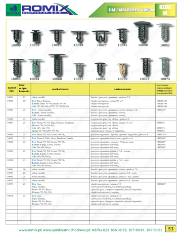 FIAT / ALFA ROMEO / LANCIA 10000 10002 10020 10024 10053 10054 10060 10067 numer kat. ilość w opakowaniu marka/model 10027 10069 10041 10050 10070 10073 zastosowanie DZIAŁ VI 10052 10074 mocowanie odpowiadające następującemu numerowi OEM 10000 25 różne modele boczki i poszycia tapicerskie, spinka ø 7,8 10002 10 Fiat Tipo, Tempra, Lancia Delta ’93-’99, Dedra ‘94-’99 Alfa 155,145,146, GTV: ’95-’98,’98-’05, słupki wewnętrzne, spinka 9,1 x 9 słupki wewnętrzne, słupki wewnętrzne, 181016180 181016180 181016180 10020 25 Fiat - różne modele, Lancia - różne modele, Alfa - różne modele, boczki i poszycia tapicerskie, osłony, spinka ø 7,8 boczki i poszycia tapicerskie, osłony, boczki i poszycia tapicerskie, osłony, 14591487 10024 25 różne modele wygłuszenie pokrywy silnika, spinka ø 6 10027 25 Fiat Panda ‘91-’03, Tipo, Tempra, Barchetta, Ducato: ‘90-’94,’94-’02, Alfa 145, 146, 155, Spider ‘95-’98, GTV ’95-’98, wygłuszenie pokrywy silnika, spinka 11 x 13 wygłuszenie pokrywy silnika, wygłuszenie pokrywy silnika, tapicerka pasa tylnego w bagażniku, 5938093 5938093 5938093 10041 25 Fiat Panda ‘91-’03, Croma ‘90-’96, pokrywa bagażnika , dywany, tapicerka bagażnika, spinka ø 8 14591784 10050 25 Fiat Punto I, Palio, Siena, Barchetta, Strada, poszycia tapicerskie i wyciszenia, spinka ø 11 14590887 10052 25 Fiat Panda ‘91-’03, Croma ‘90-’96, Lancia Kappa, Lybra, Thema Alfa 156,166, Brera, poszycia tapicerskie, spinka ø 7,8 jasno-szara poszycia tapicerskie i dywany, poszycia tapicerskie i dywany, 14592087 14592087 14592087 10053 25 Fiat Panda ‘91-’03, Croma ‘90-’96, Lancia Kappa, Lybra, Thema Alfa 156,166, Brera, poszycia tapicerskie,spinka ø 7,8 , czarna poszycia tapicerskie i dywany, poszycia tapicerskie i dywany, 10054 25 Fiat Panda ‘91-’03, Croma ‘90-’96, Lancia Kappa, Lybra, Thema Alfa 156,166, Brera, poszycia tapicerskie,spinka ø 7,8 , szara poszycia tapicerskie i dywany, poszycia tapicerskie i dywany, 10060 10 różne modele boczki i poszycia tapicerskie, osłony, spinka ø 7,8 10067 25 różne modele boczki i poszycia tapicerskie, spinka ø 6,9 , szara 10069 25 różne modele boczki i poszycia tapicerskie, spinka ø 6,9 , czarna 10070 25 różne modele boczki i poszycia tapicerskie, spinka ø 6,9 , beżowa 10073 25 Fiat Uno, Tipo, Tempra, Bravo ‘95-’01, Brava, Fiorino: ‘91-’05, ‘04-, słupki wewnętrzne, spinka ø 7,9 zakola przeciwbłotne, wykładziny podłogi, tapicerka pasa tylnego w bagażniku, boczki bagażnika, słupki wewnętrzne w kabinie, 10074 25 Fiat Uno, Tipo, Tempra, Bravo ‘95-’01, Brava, Fiorino: ‘91-’05, ‘04-, słupki wewnętrzne, spinka ø 7,9 zakola przeciwbłotne, wykładziny podłogi, tapicerka pasa tylnego w bagażniku, boczki bagażnika, słupki wewnętrzne w kabinie, 14591887 www.romix.pl; www.spinkisamochodowe.pl; tel/fax 022 836 08 93, 877 60 81, 877 60 82 53 FIAT / ALFA ROMEO / LANCIA 10078 10136 numer kat. 10078 10146 10145 ilość w opakowaniu 25 10093 10079 10114 10147 marka/model 10130 10131 10148 10159 zastosowanie Fiat Punto: I, II, Tempra, Idea, Lancia Musa wykładziny w bagażniku, deska rozdzielcza, spinka ø 8 wykładziny w bagażniku, wykładziny w bagażniku, DZIAŁ VI 10134 10161 mocowanie odpowiadające następującemu numerowi OEM 14592287 14592287 10079 25 Fiat Punto: I,II, Tempra, Idea, Lancia Musa wykładziny w bagażniku, deska rozdzielcza, spinka ø 8 wykładziny w bagażniku, wykładziny w bagażniku, 10093 25 Fiat Panda ‘91-’03, Punto I, Tipo, Tempra, Bravo: ‘95-’01,’07-, Brava, Stilo, Multipla, Marea, Palio, Siena, Linea, Croma ‘05-’10, Strada, Doblo: ‘00-’09,’09-, Fiorino ‘04-, Doblo: ‘00-’09,’09-, Punto ‘05-’09, Croma ‘90-’96, Doblo: ‘00-’09,’09-, Lancia Y, Delta ‘93-’99, Ypsilon, Delta ‘93-’99, Dedra ‘94-’99, Lybra, Alfa 145, 146, 147, 155, 156, 159, GTV:’95-’98,’98-’05, Brera, Spider ‘06-’10, 155, krata wlotu powietrza, spinka ø 6,8 uszczelki drzwi przód i tył, uszczelki drzwi przód i tył, uszczelki drzwi przednich, uszczelka drzwi bocznych przesuwnych, uszczelka pokrywy silnika, uszczelka pokrywy silnika, uszczelki drzwi przód i tył, uszczelki drzwi przód i tył, uszczelki drzwi przód i tył, uszczelka pokrywy silnika, 7677865 4482612 7677865 7677865 10114 10 Fiat Panda ‘91-’03, uszczelki i akcesoria różne , spinka ø 4,2 10130 25 różne modele uszczelki i akcesoria różne , spinka ø 7,4 10131 10 różne modele wyciszenie pokrywy silnika, spinka ø 6,5 10134 25 Fiat Uno, Fiorino ‘91-’05, wyciszenie pokrywy silnika, spinka ø 9,4 7684263 10136 10 Fiat Punto: I,II FL, Tipo, Tempra, Bravo ‘95-’01, Brava, Marea, Bravo ‘95-’01, Brava, Lancia Y, Ypsilon, Delta ‘93-’99, Delta ‘93-’99, Dedra ‘94-’99, Alfa 145, 146, 155, 156, 145, 146, wyciszenia w komorze silnika, spinka ø 16,2 wyciszenia w komorze silnika, listwy progowe zewnętrzne, wyciszenia w komorze silnika, listwy progowe zewnętrzne, listwy progowe zewnętrzne, wykładziny i dywany w kabinie, 7637466 7637466 7637466 10145 10 Fiat Punto I, Bravo ‘95-’01, Brava, Marea, Strada ‘99-’05, uszczelka pokrywy silnika i inne, spinka ø 7,5 7768047 10146 10 Fiat Cinquecento, Punto I, Bravo ‘95-’01, Brava, Marea, Palio, Siena, Croma ‘90-’96, Lancia Delta:’86-’92, ’93-’99, Dedra ‘94-’99, Thema, Kappa, Lybra, Alfa 159, 166, Spider ‘98-’06, GTV:’95-’98,’98-’05, Brera, wyciszenie pokrywy silnika, podsufitka, spinka ø 8,2 wyciszenie pokrywy silnika, wyciszenie pokrywy silnika, wyciszenie pokrywy silnika, wyciszenie pokrywy silnika, zakola przeciwbłotne, półka tylna, wyciszenie pokrywy silnika, dolne uszczelki drzwi, 7560860 7560860 7560860 10147 10 różne modele wiele zastosowań, spinka ø 6,2 10148 10 Fiat Bravo ‘95-’01, Brava, Marea, Multipla, Alfa 159, podszybie czołowe, spinka 9,8 x 8 listwa progowa zewnętrzna, pokrycie pasa ty