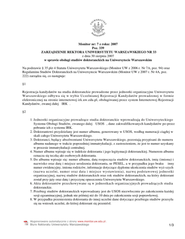 Monitor nr: 7 z roku: 2007 Poz. 339 ZARZĄDZENIE REKTORA UNIWERSYTETU WARSZAWSKIEGO NR 33 z dnia 30 sierpnia 2007 w sprawie obsługi studiów doktoranckich na Uniwersytecie Warszawskim Na podstawie § 35 pkt 4 Statutu Uniwersytetu Warszawskiego (Monitor UW z 2006 r. Nr 7A, poz. 94) oraz Regulaminu Studiów Doktoranckich na Uniwersytecie Warszawskim (Monitor UW z 2007 r. Nr 4A, poz. 222) zarządza się, co następuje: §1 Rejestracja kandydatów na studia doktoranckie prowadzone przez jednostki organizacyjne Uniwersytetu Warszawskiego odbywa się w trybie Uczelnianej Rejestracji Kandydatów prowadzonej w formie elektronicznej na stronie internetowej irk.uw.edu.pl, obsługiwanej przez system Internetowej Rejestracji Kandydatów, zwanej dalej IRK . §2 1. Jednostki organizacyjne prowadzące studia doktoranckie wprowadzają do Uniwersyteckiego Systemu Obsługi Studiów, zwanego dalej USOS , dane zakwalifikowanych kandydatów po-przez pobranie ich z systemu IRK. 2. Doktorantowi przydzielany jest numer albumu, generowany w USOS, według numeracji ciągłej w skali całego Uniwersytetu Warszawskiego. 3. Doktoranci, będący absolwentami Uniwersytetu Warszawskiego, pozostają przypisani do numeru albumu nadanego w trakcie poprzedniej immatrykulacji, z zastrzeżeniem, że jest to numer uzyskany w procesie immatrykulacji centralnej. 4. Numer albumu wpisuje się w indeksie doktoranta i jego legitymacji doktoranckiej. Numerem albumu oznacza się teczkę akt osobowych doktoranta. 5. Do albumu wpisuje się: numer albumu, datę rozpoczęcia studiów doktoranckich, imię (imiona) i nazwisko oraz datę i miejsce urodzenia doktoranta, nr PESEL, a w przypadku jego braku inny numer ewidencyjny, imiona rodziców, informacje dotyczące dyplomu ukończenia studiów wyż-szych (nazwa uczelni, numer oraz data i miejsce wystawienia), nazwę podstawowej jednostki organizacyjnej, nazwę studiów doktoranckich oraz rok studiów doktoranckich, na który doktorant został przy-jęty oraz datę i przyczynę opuszczenia Uniwersytetu Warszawskiego. 6. Akta doktorantów przechowywane są w jednostkach organizacyjnych prowadzących studia doktoranckie. 7. Przebieg studiów doktoranckich wprowadzany jest do USOS niezwłocznie po zakończeniu każdej sesji egzaminacyjnej, jednak nie później niż do 10 dnia po zakończeniu sesji poprawkowej. 8. W przypadku przeniesienia doktoranta do innej uczelni dane dotyczące przebiegu studiów przesyła się na wniosek uczelni, do której doktorant się przeniósł. 1/3 §3 W USOS przechowuje się dane osobowe i ewidencyjne, a w szczególności: 1. informacje wymagane od kandydata na studia doktoranckie: 1. numer dyplomu ukończenia studiów wyższych wraz z datą jego wydania i nazwą uczelni, która dokument wydała, 2. ankietę osobową, zawierającą imię (imiona) i nazwisko, datę i miejsce urodzenia, nr PESEL, a w przypadku jego braku inny numer ewidencyjny, adres zamieszkania (państwo, miasto lub wieś), adres do korespondencji oraz informację o podstawowym źródle utrzymania rodziny kandydata na studia doktoranckie, 3. dane z postępowania kwalifikacyjnego stanowiące podstawę podjęcia decyzji o przyjęciu na studia doktoranckie; 2. decyzję o przyjęciu na studia; 3. dane z kart okresowych osiągnięć doktoranta; 4. decyzje władz uczelni dotyczące przebiegu studiów, w szczególności: udzielonych urlopów, zgód na powtarzanie roku, skreślenia z listy uczestników studiów doktoranckich, a także nagród, wy-różnień i kar dyscyplinarnych, skierowania na studia lub praktyki do innej instytucji polskiej lub za-granicznej; 5. decyzje dotyczące przyznania doktorantowi pomocy materialnej; 6. potwierdzenie odbioru legitymacji uczestnika studiów doktoranckich i indeksu, a także ich duplika-tów; 7. potwierdzenie odbioru świadectwa ukończenia studiów doktoranckich i jego odpisu, a także dupli-katu świadectwa; 8. potwierdzenie odbioru dyplomu doktorskiego i jego odpisów. §4 Po przeprowadzeniu postępowania rekrutacyjnego zgodnie z odrębnymi przepisami, właściwe jednostki organizacyjne przesyłają listy osób przyjętych na studia doktoranckie do Biura ds. Studiów Doktoranckich i Kształcenia Podyplomowego. §5 Po immatrykulacji uczestnik studiów doktoranckich otrzymuje: 1. indeks, 2. legitymację uczestnika studiów doktoranckich, 3. legitymację ubezpieczeniową, o ile nie jest ubezpieczony z innego tytułu. §6 1. Świadczenia z funduszu pomocy materialnej dla doktorantów, określone w odrębnych przepisach, wypłacane są za pośrednictwem systemu USOS, po wprowadzeniu do niego decyzji o przyznanych świadczeniach oraz podaniu przez doktoranta numeru konta bankowego, na który te świadczenia powinny być przekazywane. 2/3 2. Stypendia doktoranckie, przyznawane na podstawie odrębnych przepisów, wypłacane są za pośrednictwem USOS, po wprowadzeniu do niego decyzji o przyznanych świadczeniach oraz podaniu przez doktoranta numeru konta bankowego, na który te świadczenia powinny być przekazy-wane. 3. Inne świadczenia, z zastrzeżeniem przepisów odrębnych, wypłacane są za pośrednictwem USOS. §7 1. Przepisy § 1−4 oraz § 6 ust. 2 stosuje się do doktorantów przyjętych na pierwszy rok studiów doktoranckich począwszy od dnia 1 października 2007 r. 2. Przepisy § 5 oraz § 6 ust. 1 stosuje się do wszystkich doktorantów. §8 Zarządzenie wchodzi w życie z dniem 1 września 2007 r. 3/3