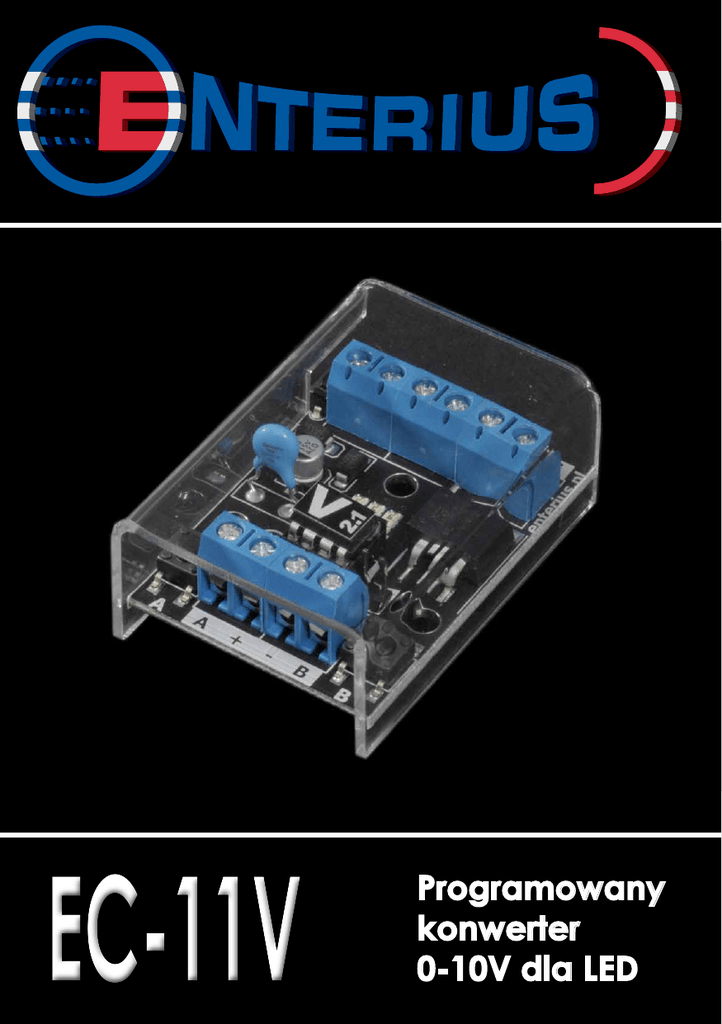 EC-11V Programowany konwerter 0-10V dla LED Dziękujemy za wybór naszego produktu. Prosimy o uważne zapoznanie się z niniejszą instrukcją obsługi i ścisłe przestrzeganie zawartych w niej wskazówek. Instrukcja wraz z karta gwarancyjną stanowi integralną część produktu i należy ją zachować. Urządzenie należy wykorzystywać zgodnie z jego przeznaczeniem a instalacji powinien dokonać wykwalifikowany personel. Za szkody spowodowane błędami w instalacji i użytkowaniu oraz nieprzestrzeganiem instrukcji obsługi producent nie bierze odpowiedzialności! Urządzenie opisywane w niniejszej instrukcji jest produktem profesjonalnym przeznaczonym do sterowania oświetleniem estradowym. Możliwość jego stosowania w innych aplikacjach może być uzależniona od aktualnych przepisów prawa lub obowiązujących norm. Ważne informacje o bezpieczeństwie Urządzenie nie zawiera żadnych elementów możliwych do serwisowania przez użytkownika. W przypadku usterki, napraw może dokonać jedynie autoryzowany serwis wskazany przez producenta. Wszelkie samodzielne próby naprawy lub modyfikacji urządzenia będą skutkować utratą gwarancji. Urządzenia nie wolno narażać na działanie cieczy ani dużej wilgotności, która mogłaby doprowadzić do skraplania się wody i w efekcie uszkodzenia urządzenia. Instalację urządzenia oraz wszelkie podłączenia należy wykonywać zawsze przy odłączonym napięciu zasilania. Urządzenie należy czyścić sprężonym powietrzem lub suchym, miękkim pędzlem. Stosowanie szmatek lub ręczników papierowych może doprowadzić do uszkodzenie delikatnych elementów elektronicznych zamontowanych na płytce PCB. Dopuszcza się stosowanie chemicznych środków czyszczących jedynie typu „Dry Cleaner”. Czyszczenie należy bezwzględnie przeprowadzić przy odłączonym napięciu zasilania. Urządzenie jest przeznaczone do współpracy z zasilaczami napięcia stałego, stabilizowanego posiadającymi zabezpieczenie przeciwprzepięciowe. Zalecamy stosowanie zasilaczy umożliwiających podłączenie uziemienia (dodatkowa ochrona przeciwprzepięciowa). W trakcie burzy lub podczas długiego okresu nieużytkowania zalecamy odłączenie napięcia zasilania. Urządzenie podczas pracy z obciążeniami bliskimi maksymalnym nagrzewa się w znacznym stopniu. Należy zapewnić odpowiednią wentylację urządzenia oraz nie zaleca się instalować go w pobliżu innych źródeł ciepła. Należy ściśle przestrzegać podanej polaryzacji napięcia zasilającego oraz maksymalnych obciążeń wyjść. Zastrzega się prawo wprowadzania zmian parametrów technicznych i wyglądu bez uprzedzenia. Niniejsza instrukcja jest aktualna w momencie wydruku i jest chroniona prawem autorskim. Bez wyraźnej, pisemnej zgody Enterius żadna część tej instrukcji nie może być w jakimkolwiek celu powielana ani tez przekazywana w żadnej formie, elektronicznej lub mechanicznej, włączając w to fotokopiowanie lub innego rodzaju zapis. Aktualne wersje instrukcji obsługi urządzeń produkowanych przez Enterius zawsze na www.enterius.pl Niesprawnych urządzeń elektrycznych lub elektronicznych nie wolno wyrzucać razem z odpadami gospodarczymi. Urządzenie należy poddać utylizacji w akredytowanym zakładzie utylizacji lub komunalnym zakładzie utylizacji odpadów. Należy przestrzegać aktualnie obowiązujących przepisów. W razie pytań i wątpliwości odnośnie zasad utylizacji należy skontaktować się z najbliższym zakładem utylizacji. Wszystkie materiały opakowaniowe należy poddać utylizacji w sposób przyjazny dla środowiska Wprowadzenie Konwerter EC-11V jest odmianą ściemniacza, sterowanego sygnałem 0-10V lub 1-10V bardzo często spotykanym w systemach automatyki i sterowania. Urządzenie pozwala na pełną i liniową regulację jasności źródeł światła LED z poziomu każdego systemu lub sterownika posiadającego wyjście 0-10V lub 1-10V. Dodatkowo ściemniacz umożliwia sterowanie za pomocą przycisku podłączonego do wejścia A, co pozwala na rozszeżenie możliwości. EC-10V jest oparty na specjalizowanym mikroprocesorze, dzięki któremu mimo małych wymiarów posiada duże możliwości. Dodatkowo większość parametrów jego pracy użytkownik może samodzielnie programować tak, aby dopasować działanie EC-11V do swoich potrzeb. Płytka urządzenia zawiera dwa przyciski A i B do wyboru opcji oraz przycisk PRG służący do programowania. Ponadto mamy trzy wyjścia o obciążalności 2A każde, których sposób działania jest programowany. Wejście A służy do ewentualnego podłączenia przycisku lub styku sterującego, natomiast wejście B służy do podłączenia sygnału 0-10V lub 1-10V. Na płytce znajduje się też zworka 1-10V, którą należy założyć w przypadku korzystania z sygnału 1-10V lub zdjąć po podłączeniu sygnału 0-10V. W celu ułatwienia programowania urządzenia oraz odczytywania zaprogramowanych wartości na płytce urządzenia znajdują się trzy diody LED sygnalizujące stan pracy oraz programowane parametry. Zastosowanie przykręcanych zacisków na przewody ułatwia wykonanie połączeń i eliminuje konieczność stosowania specjalistycznych narzędzi. Działanie Podstawowe działanie EC-11V to konwersja sygnału analogowego 0-10V lub 1-10V na cyfrowy sygnał PWM bezpośrednio zasilający urządzenia LED. Wartość napięcia podanego na wejście B jest zamieniana liniowo na wypełnienie sygnału PWM obecnego na wyjściach. Te parametry pracy urządzenia, które użytkownik może samodzielnie programować zostały opisane w tabeli programowania. Poniżej opis ogólny. Wyjścia 1 , 2 oraz 3 w stanie załączonym podają masę, która dla wyjść oprogramowanych jako sterujące jasnością zostaje podawana w postaci impulsów PWM o częstotliwości 550 Hz. Plus zasilania jest podawany do odbiorników na stałe. W przypadku zaprogramowania wyjść jako sygnalizacyjne lub sterujące, co daje możliwość załączania inn