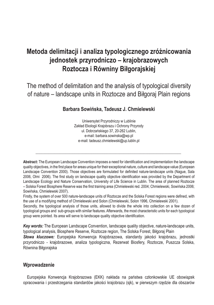 161 Metoda delimitacji i analiza typologicznego zróżnicowania jednostek przyrodniczo – krajobrazowych Roztocza i Równiny Biłgorajskiej The method of delimitation and the analysis of typological diversity of nature – landscape units in Roztocze and Biłgoraj Plain regions Barbara Sowińska, Tadeusz J. Chmielewski Uniwersytet Przyrodniczy w Lublinie Zakład Ekologii Krajobrazu i Ochrony Przyrody ul. Dobrzańskiego 37, 20-262 Lublin, e-mail: [email protected] e-mail: [email protected] ______________________________________________________________________________ Abstract: The European Landscape Convention imposes a need for identification and implementation the landscape quality objectives, in the first place for areas unique for their exceptional nature, culture and landscape value (European Landscape Convention 2000). Those objectives are formulated for definited nature-landscape units (Nague, Sala 2006, Olmi 2006). The first study on landscape quality objective identification was provided by the Department of Landscape Ecology and Nature Conservation, University of Life Science in Lublin. The area of planned Roztocze – Solska Forest Biosphere Reserve was the first training area (Chmielewski red. 2004; Chmielewski, Sowińska 2006; Sowińska, Chmielewski 2007). Firstly, the system of over 500 nature-landscape units of Roztocze and the Solska Forest regions were defined, with the use of a modifying method of Chmielewski and Solon (Chmielewski, Solon 1996, Chmielewski 2001). Secondly, the typological analysis of those units, allowed to divide the whole into collection on a few dozen of typological groups and sub-groups with similar features. Afterwards, the most characteristic units for each typological group were pointed. Its area will serve to landscape quality objective identification. Key words: The European Landscape Convention, landscape quality objective, nature-landscape units, typological analysis, Biosphere Reserve, Roztocze region, The Solska Forest, Biłgoraj Plain Słowa kluczowe: Europejska Konwencja Krajobrazowa, standardy jakości krajobrazu, jednostki przyrodniczo - krajobrazowe, analiza typologiczna, Rezerwat Biosfery, Roztocze, Puszcza Solska, Równina Biłgorajska Wprowadzenie Europejska Konwencja Krajobrazowa (EKK) nakłada na państwa członkowskie UE obowiązek opracowania i przestrzegania standardów jakości krajobrazu (sjk), w pierwszym rzędzie dla obszarów 162 Sowińska B. , Chmielewski T. J. wyróżniających się wybitnymi walorami przyrodniczymi, kulturowymi i fizjonomicznymi. W obrębie poszczególnych regionów standardy te określa się w odniesieniu do wydzielonych w ich strukturze krajobrazowej jednostek przestrzennych (Nague, Sala 2006, Olmi i In. 2006). Pierwsze, tak szerokie badania w Polsce prace nad określeniem standardów jakości krajobrazu podjęto w Zakładzie Ekologii Krajobrazu i Ochrony Przyrody UP w Lublinie, w odniesieniu do obszaru projektowanego Rezerwatu Biosfery „Roztocza - Puszcza Solska” (Chmielewski red. 2004; Chmielewski, Sowińska 2006; Sowińska, Chmielewski 2007). Pierwszym etapem prac było wyznaczenie w krajobrazach Roztocza i Puszczy Solskiej systemu jednostek przestrzennych, które były by dobrymi polami podstawowymi dla określania standardów jakości krajobrazu. Za pola takie uznano jednostki przyrodniczo – krajobrazowe (jpk), wyznaczane zmodyfikowaną metodą Chmielewskiego i Solona (Chmielewski, Solon 1996; Chmielewski 2001). Prace delimitacyjne prowadzono na obszarze ok. 263500 ha należącym do 5 mezoregionów fizycznogeograficznych: Roztocza Zachodniego, Roztocza Środkowego, Roztocza Południowego, Równiny Biłgorajskiej i Płaskowyżu Tarnogrodzkiego. Celem drugiego etapu prac było przeprowadzenie analizy typologicznego zróżnicowania zbioru wyznaczonych jednostek oraz wskazania jednostek najbardziej charakterystycznych (reprezentatywnych) dla poszczególnych grup typologicznych. Jednostki te staną się następnie obszarem szczegółowych analiz służących określeniu standardów jakości krajobrazu projektowanego rezerwatu biosfery. W niniejszej publikacji przedstawiono przyjętą metodę i wyniki delimitacji jpk oraz efekty typologicznej analizy zbioru jednostek wyodrębnionych na obszarze mezoregionu Roztocza Zachodniego. Charakterystyka obszaru badań Roztocze tworzy długi, przekraczający 180 km wał wzniesień rozciągający się z północnego – zachodu (okolice Kraśnika) na południowy – wschód (okolice Lwowa), gdzie na terytorium Ukrainy łączy się z Wyżyną Podolską. Grzbiet Roztocza tworzą faliste wierzchowiny, rozczłonkowane na szereg płaskowyżów i garbów rozdzielonych obniżeniami wąskich dolin rzecznych (Burczyński red. 2002). W granicach Polski znajduje się pas wzniesień Roztocza o długości 110 km, szerokości od 15 do 28 km i wysokości od 300 m n.p.m. w okolicy Batoża, do ponad 390 m w okolicy Lubyczy Królewskiej. Według regionalizacji fizyczno-geograficznej Kondrackiego, makroregion ten tworzą 3 mezoregiony: Roztocze Zachodnie, Środkowe oraz Wschodnie, zwane także Rawskim, lub Południowym (Kondracki 1998). Od południa przylega do nich płaska, silnie zalesiona Równina Biłgorajska (ryc. 1). Zespół tych czterech mezoregionów stanowi jeden z najcenniejszych kompleksów przyrodniczych Polski. O jego wyjątkowych walorach świadczy utworzenie tu 1 parku narodowego, 4 parków krajobrazowych, 21 istniejących i projektowanych obszarów Natura 2000, 15 rezerwatów przyrody, 2 obszarów chronionego krajobrazu oraz ponad 30 użytków ekologicznych (Chmielewski, Sowińska 2008). Walory te były podstawą przygotowania wniosku do UNESCO o nadanie temu obszarowi statusu Rezerwatu Biosfery o nazwie „Roztocze-Puszcza Solska” (Chmielewski red. 2004). W obręb rezerwatu wchodzi także niewielki fragment piątego mezoregionu – Płaskowyżu Tarnogrodzkiego. Roztocze Zachodnie jest najdalej na zachód wysuniętym mezoregionem Roztocza. W jego strukturze 