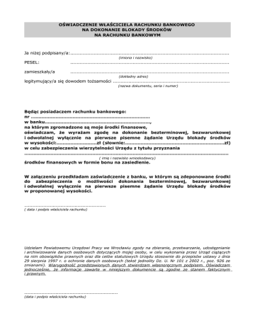 OŚWIADCZENIE WŁAŚCICIELA RACHUNKU BANKOWEGO NA DOKONANIE BLOKADY ŚRODKÓW NA RACHUNKU BANKOWYM Ja niżej podpisany/a:...................................................................................................... (imiona i nazwisko) PESEL: ...................................................................................................... zamieszkały/a ...................................................................................................... (dokładny adres) legitymujący/a się dowodem tożsamości ........................................................................... (nazwa dokumentu, seria i numer) Będąc posiadaczem rachunku bankowego: nr ….......................................................................... w banku...................................................................., na którym zgromadzone są moje środki finansowe, oświadczam, że wyrażam zgodę na dokonanie bezterminowej, bezwarunkowej i odwołalnej wyłącznie na pierwsze pisemne żądanie Urzędu blokady środków w wysokości:..........................zł (słownie:................................................................zł) w celu zabezpieczenia wierzytelności Urzędu z tytułu przyznania …................................................................................................................................. ( imię i nazwisko wnioskodawcy) środków finansowych w formie bonu na zasiedlenie. W załączeniu przedkładam zaświadczenie z banku, w którym są zdeponowane środki do zabezpieczenia o możliwości dokonania bezterminowej, bezwarunkowej i odwołalnej wyłącznie na pierwsze pisemne żądanie Urzędu blokady środków w proponowanej wysokości. ….................................................. ( data i podpis właściciela rachunku) Udzielam Powiatowemu Urzędowi Pracy we Wrocławiu zgody na zbieranie, przetwarzanie, udostępnianie i archiwizowanie danych osobowych dotyczących mojej osoby, w celu wykonania przez Urząd ciążących na nim obowiązków prawnych oraz dla celów statutowych Urzędu stosownie do przepisów ustawy z dnia 29 sierpnia 1997 r. o ochronie danych osobowych (tekst jednolity Dz. U. Nr 101 z 2002 r., poz. 926 ze zmianami). Wiarygodność przedstawionych danych stwierdzam własnoręcznym podpisem. Oświadczam jednocześnie, że informacje zawarte w niniejszym dokumencie są zgodne ze stanem faktycznym i prawnym. ............................................................ (data i podpis właściciela rachunku)